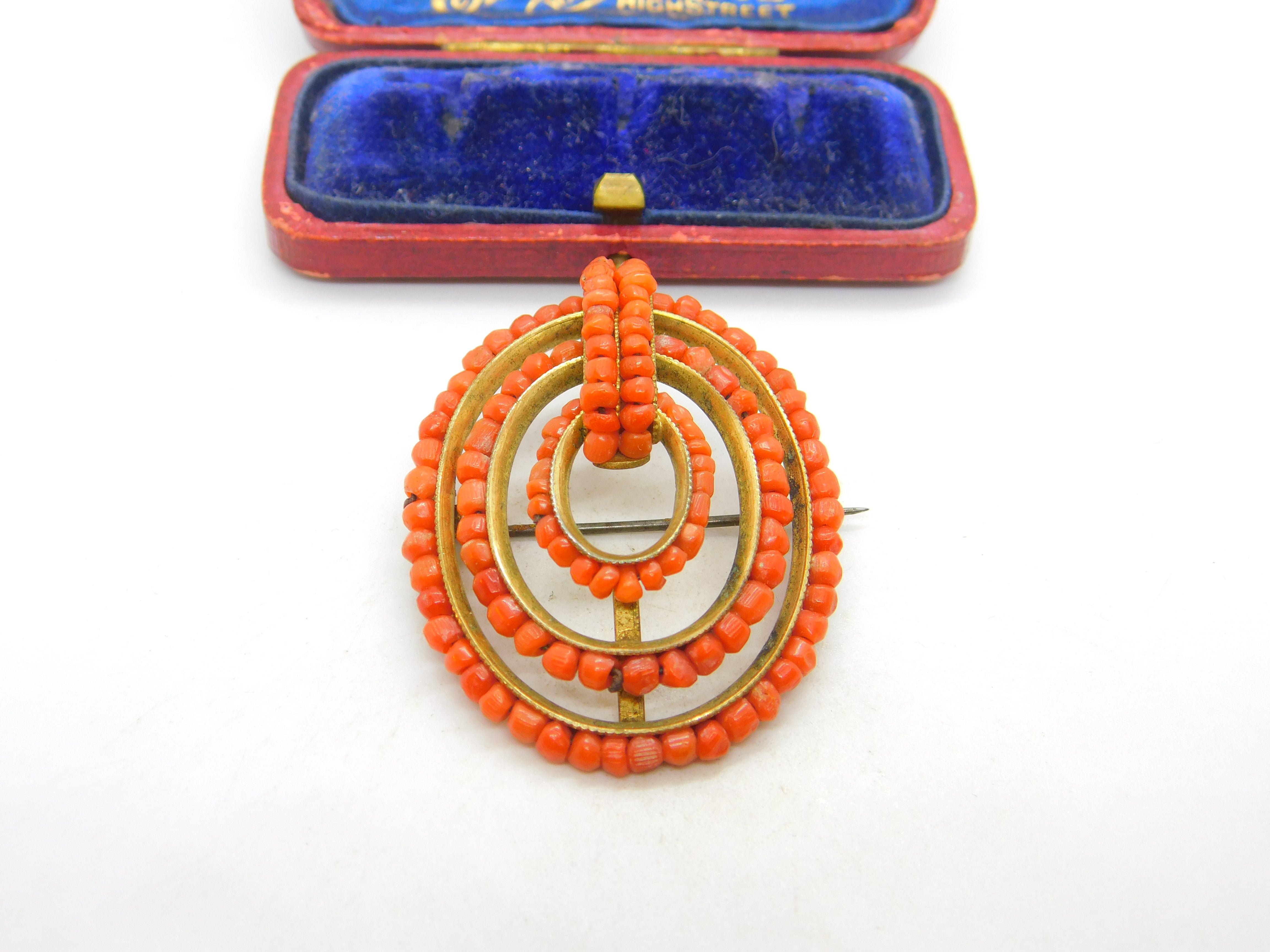 Victorian Yellow Metal & Red Coral Beaded Dress Brooch Pin c1850 Antique