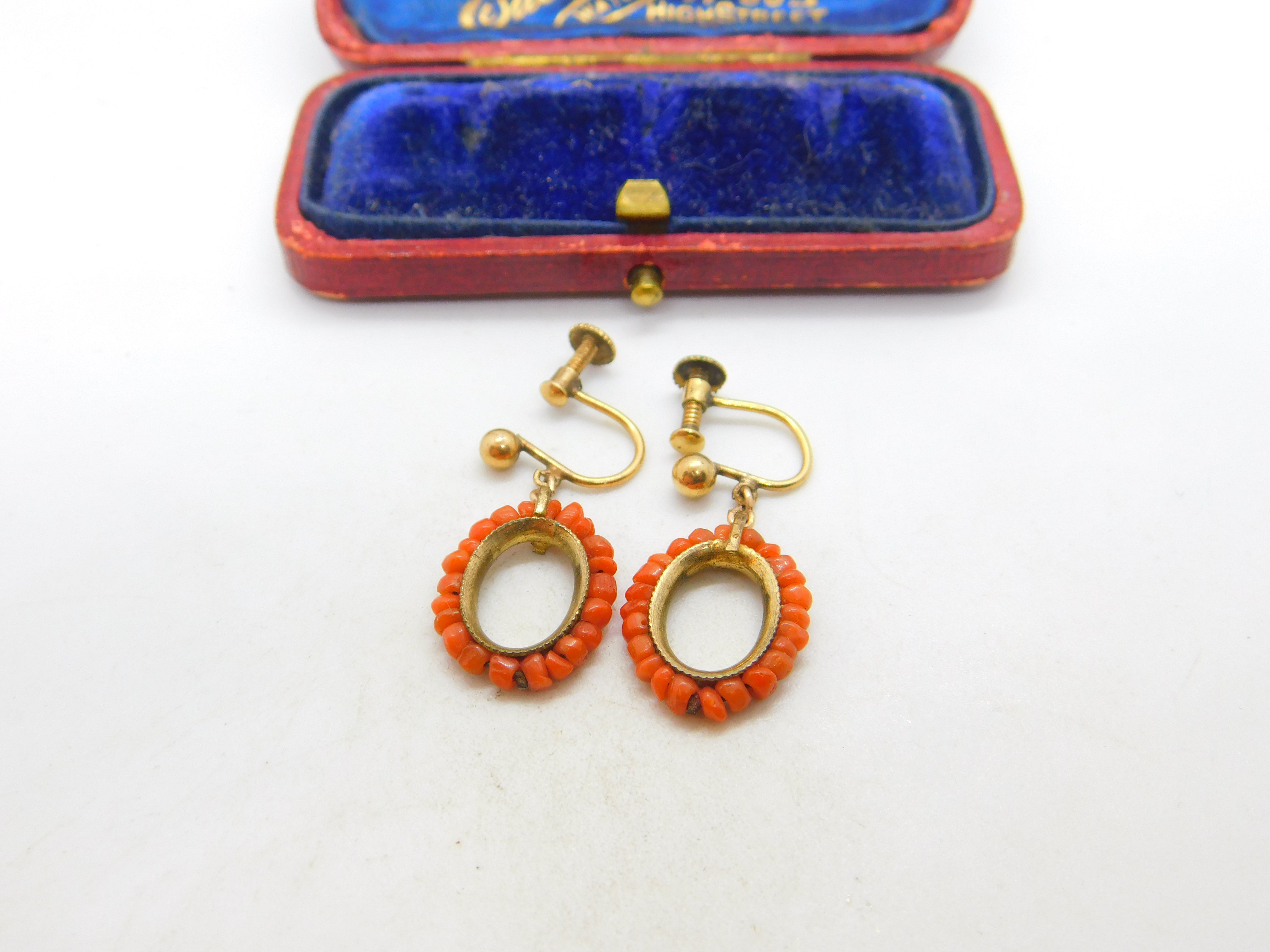 Victorian 9ct Gold & Beaded Red Coral Screw Back Drop Earrings c1880 Antique