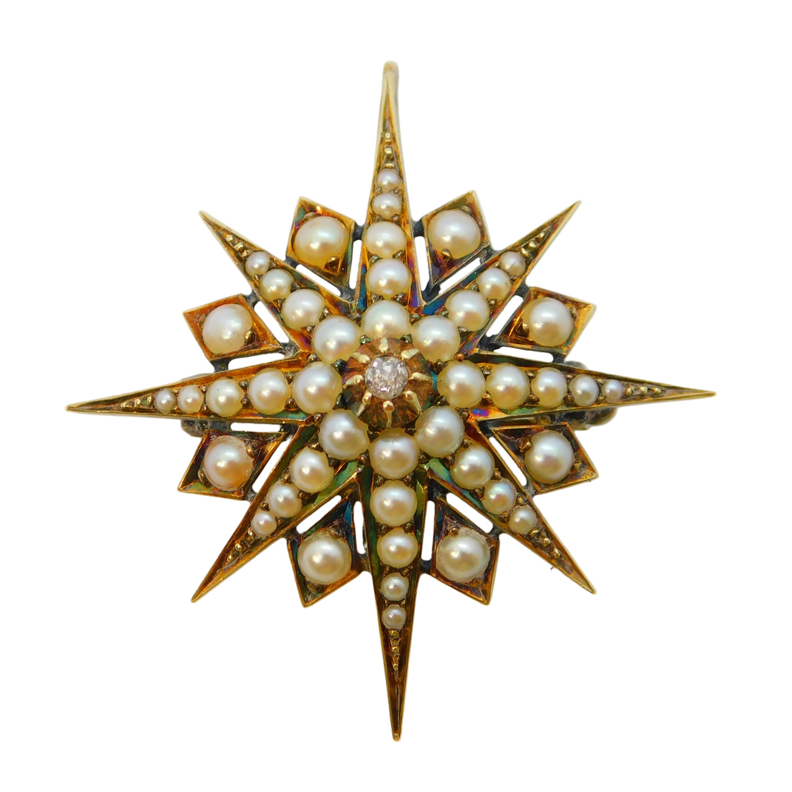 Victorian 15ct Gold, Seed Pearl & Diamond Starburst Pendant Antique c1880