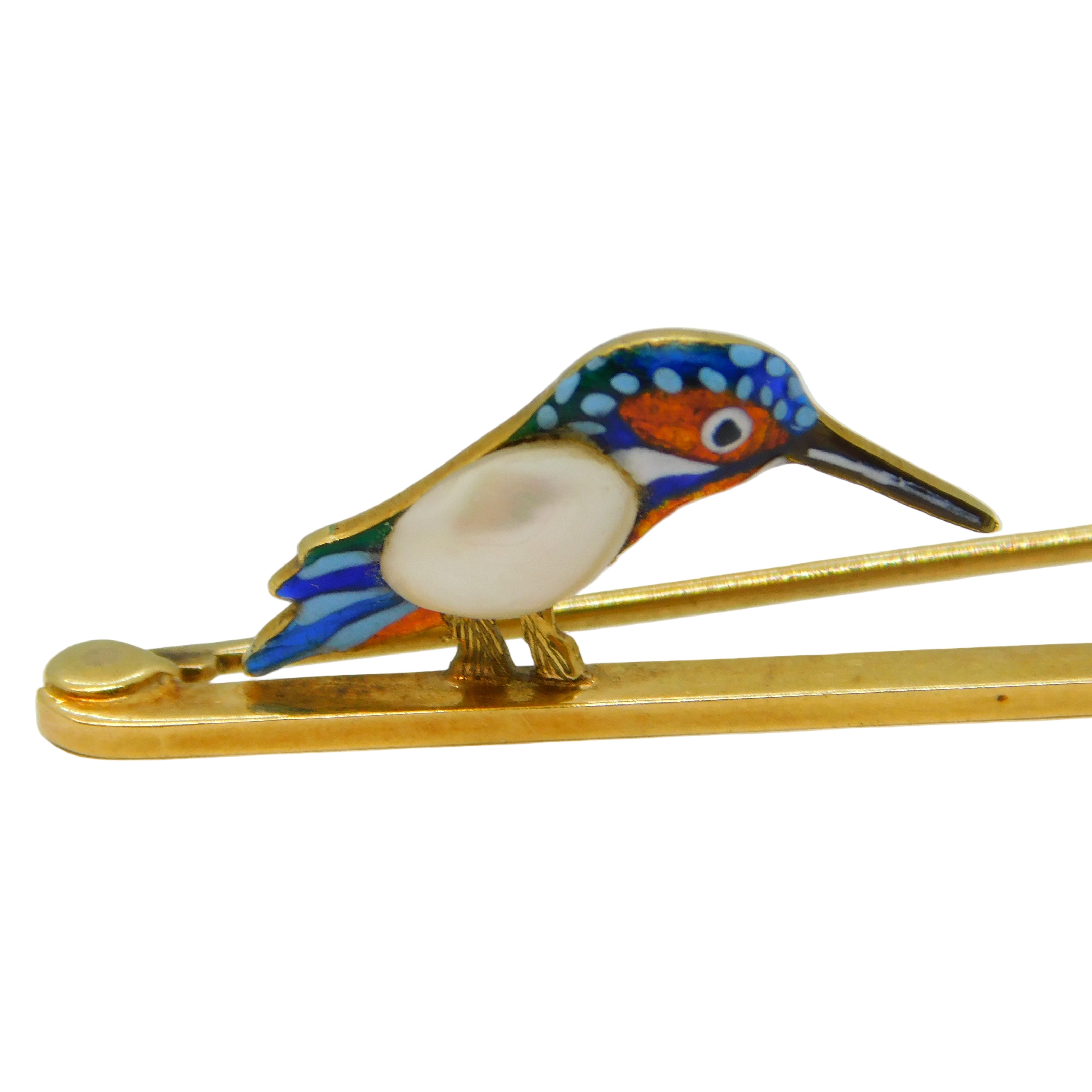 Victorian 15ct Yellow Gold, Enamel & Pearl Set Kingfisher Brooch Antique c1900