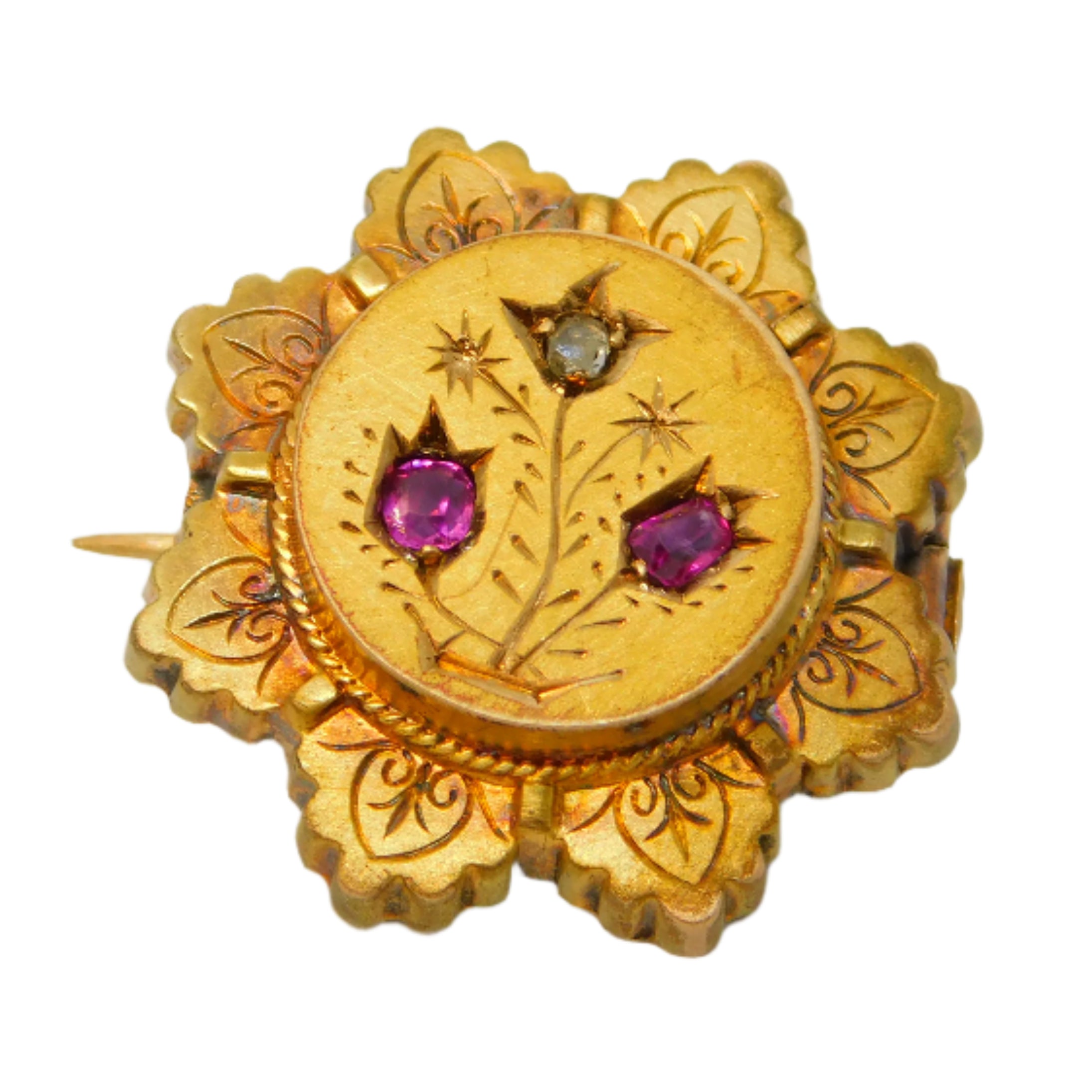 Victorian 9ct Gold, Diamond, Ruby Floral Locket Brooch Pin Antique c1880