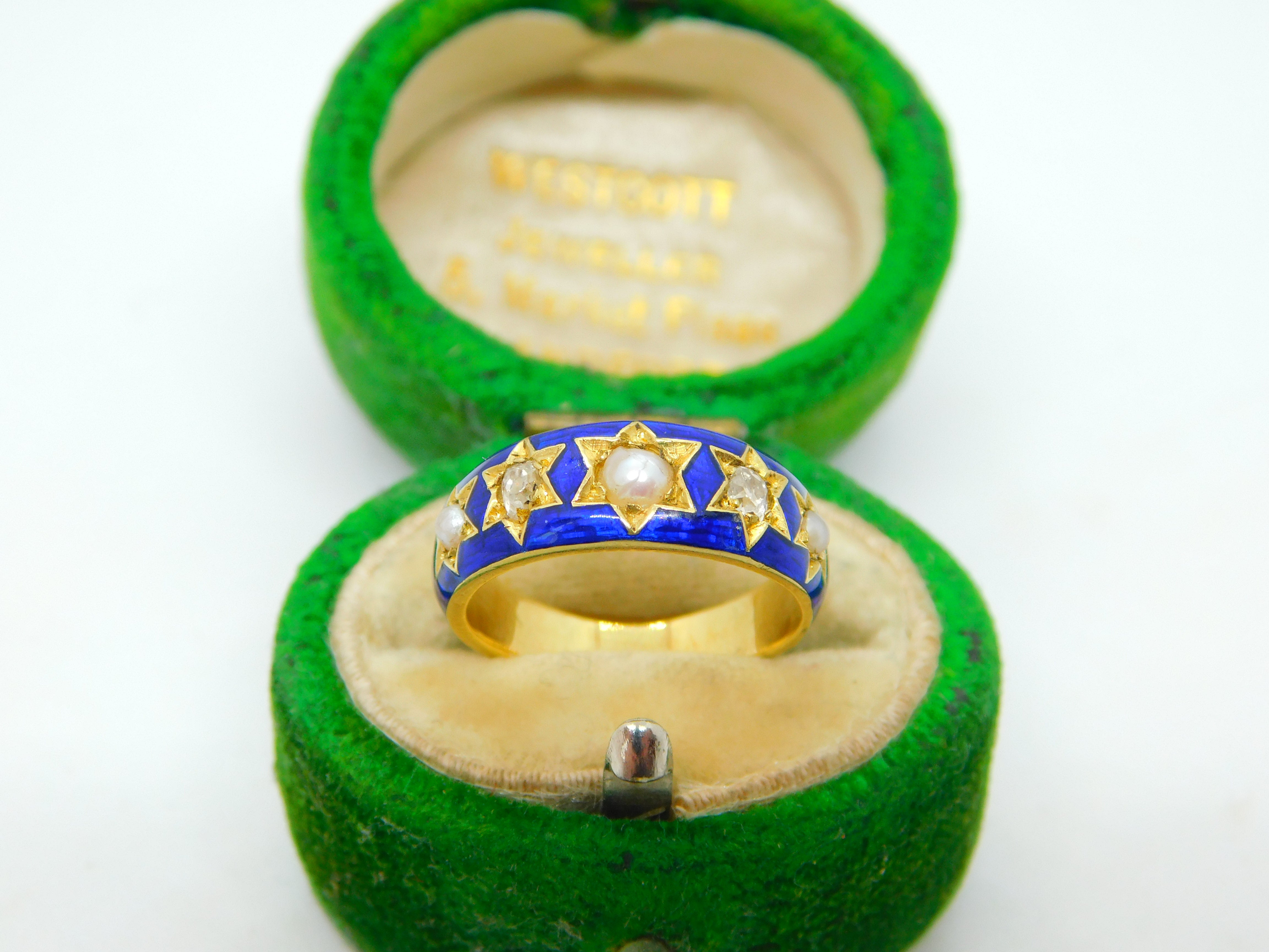 Victorian 18ct Yellow Gold, 0.2ct Diamond, Pearl, Blue Enamel Ring Antique c1860