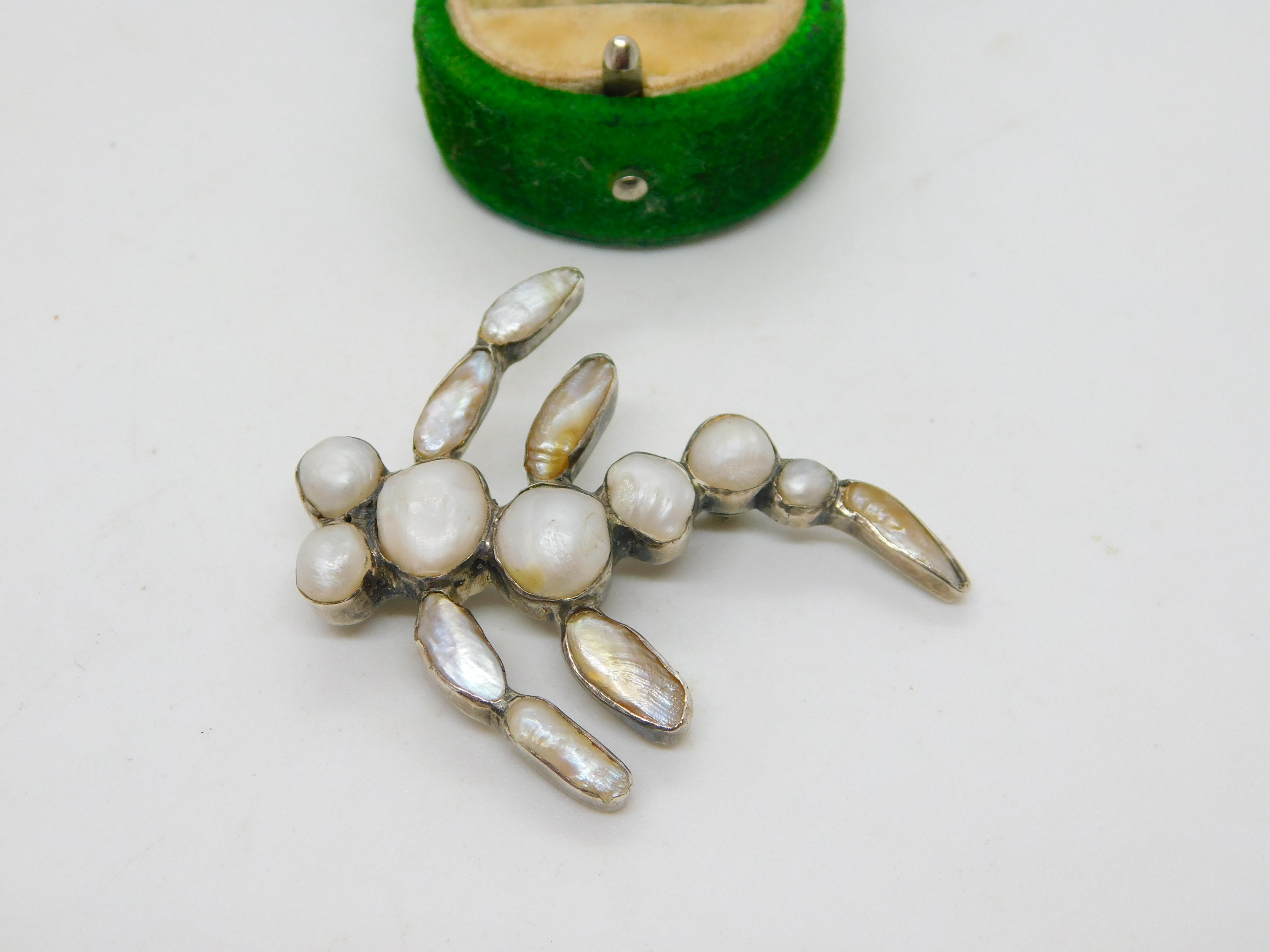 Victorian Sterling Silver & Blistered Pearl Dragonfly Insect Brooch Antique c1880