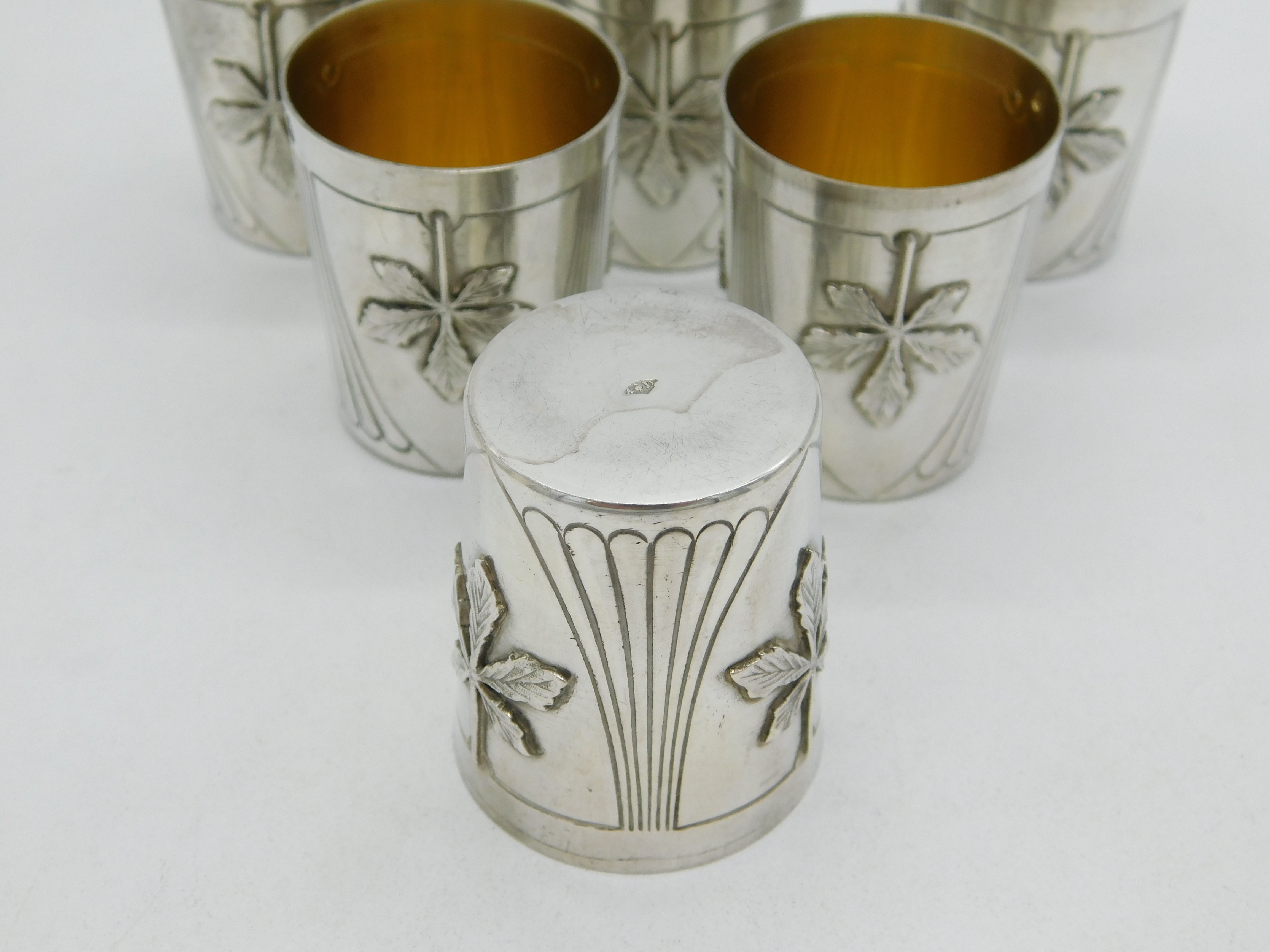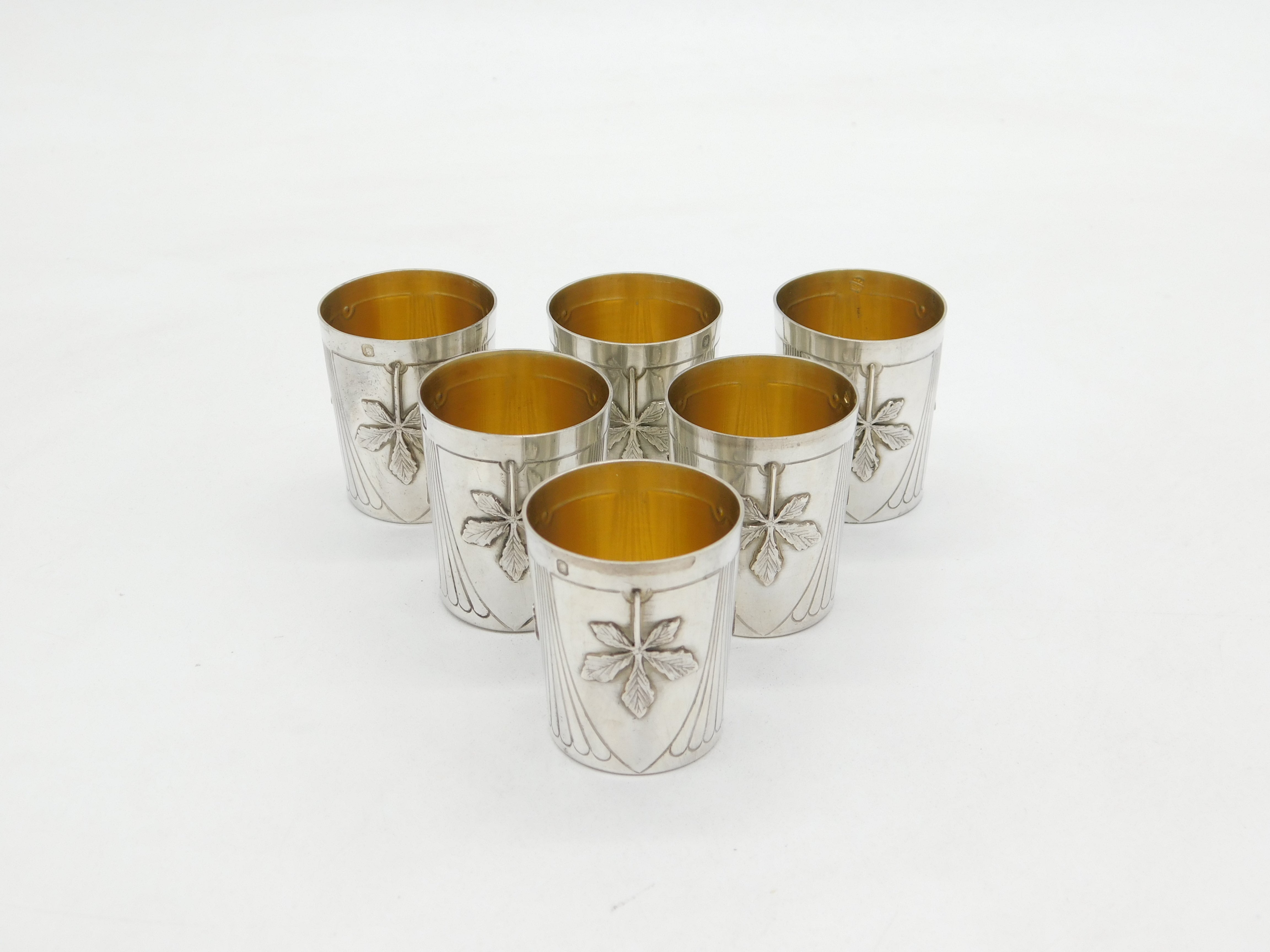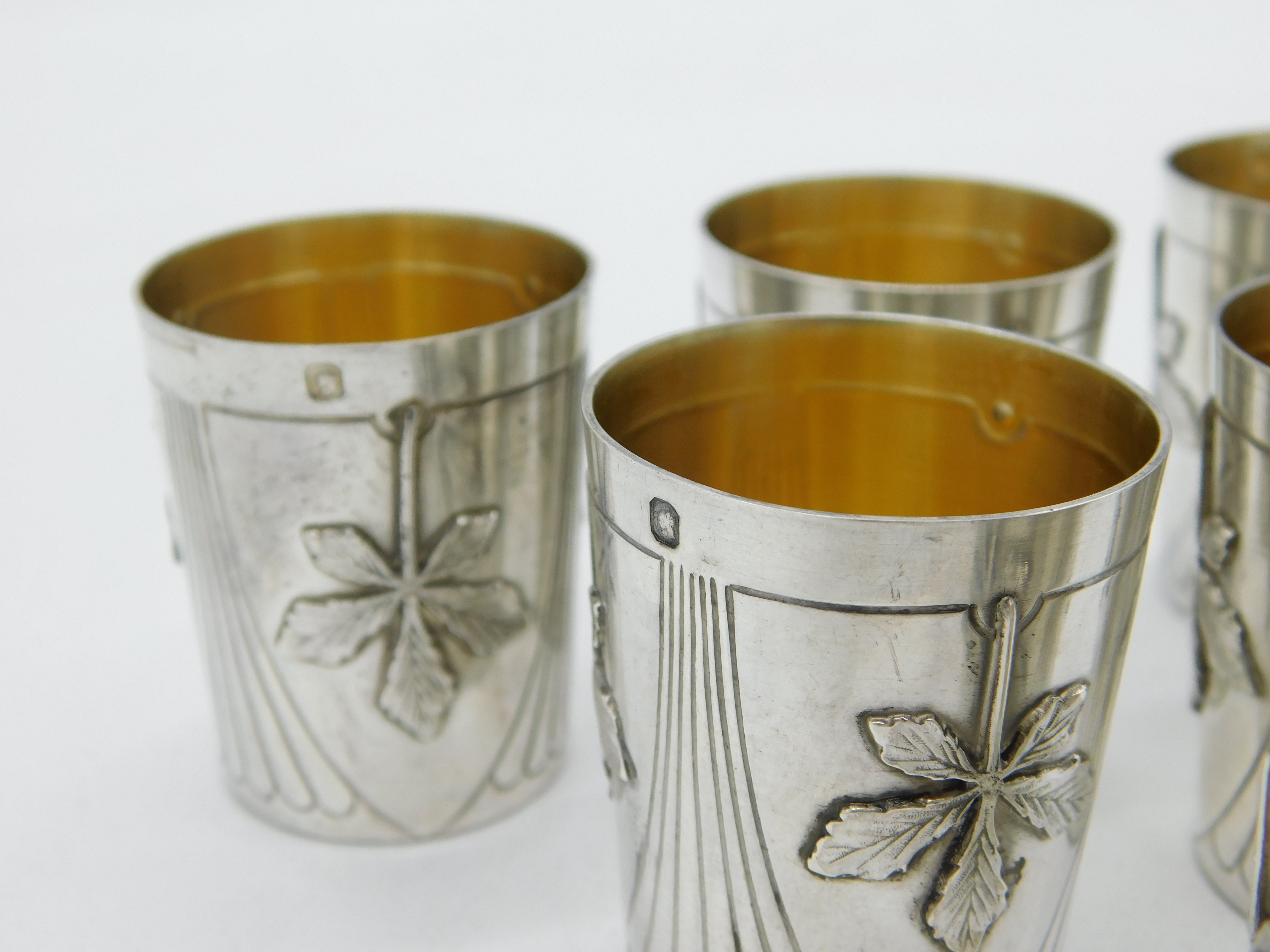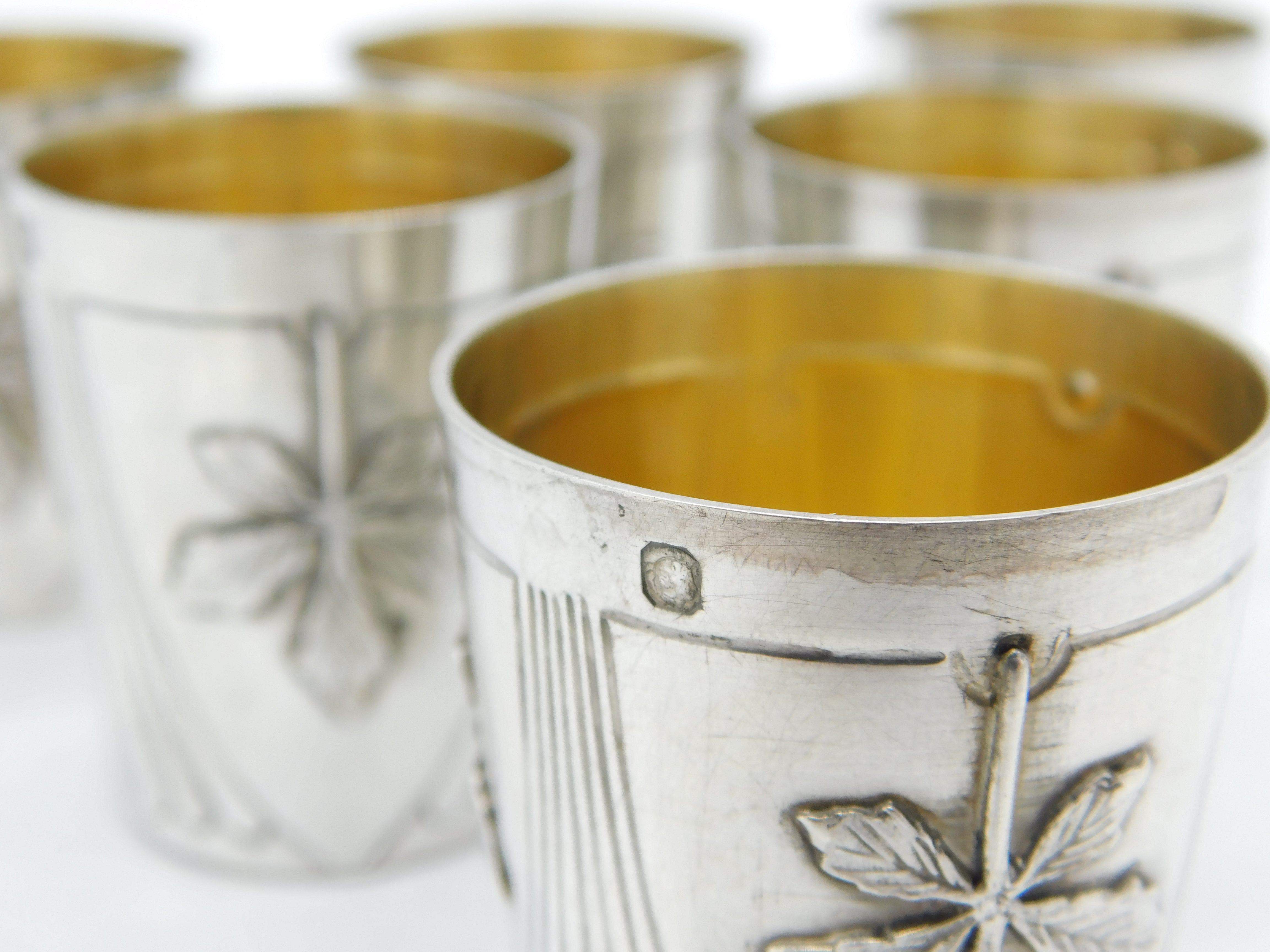 Details: A fantastic and wonderfully designed antique French 19th century set of six .950 grade silver shot goblets each gilded to the interior and adorned with charming art nouveau patterns, hallmarked with minerva head purity marks by Parisian marker Alphonse Debain. This is a wonderful item that would make a perfect gift or addition to any collection.