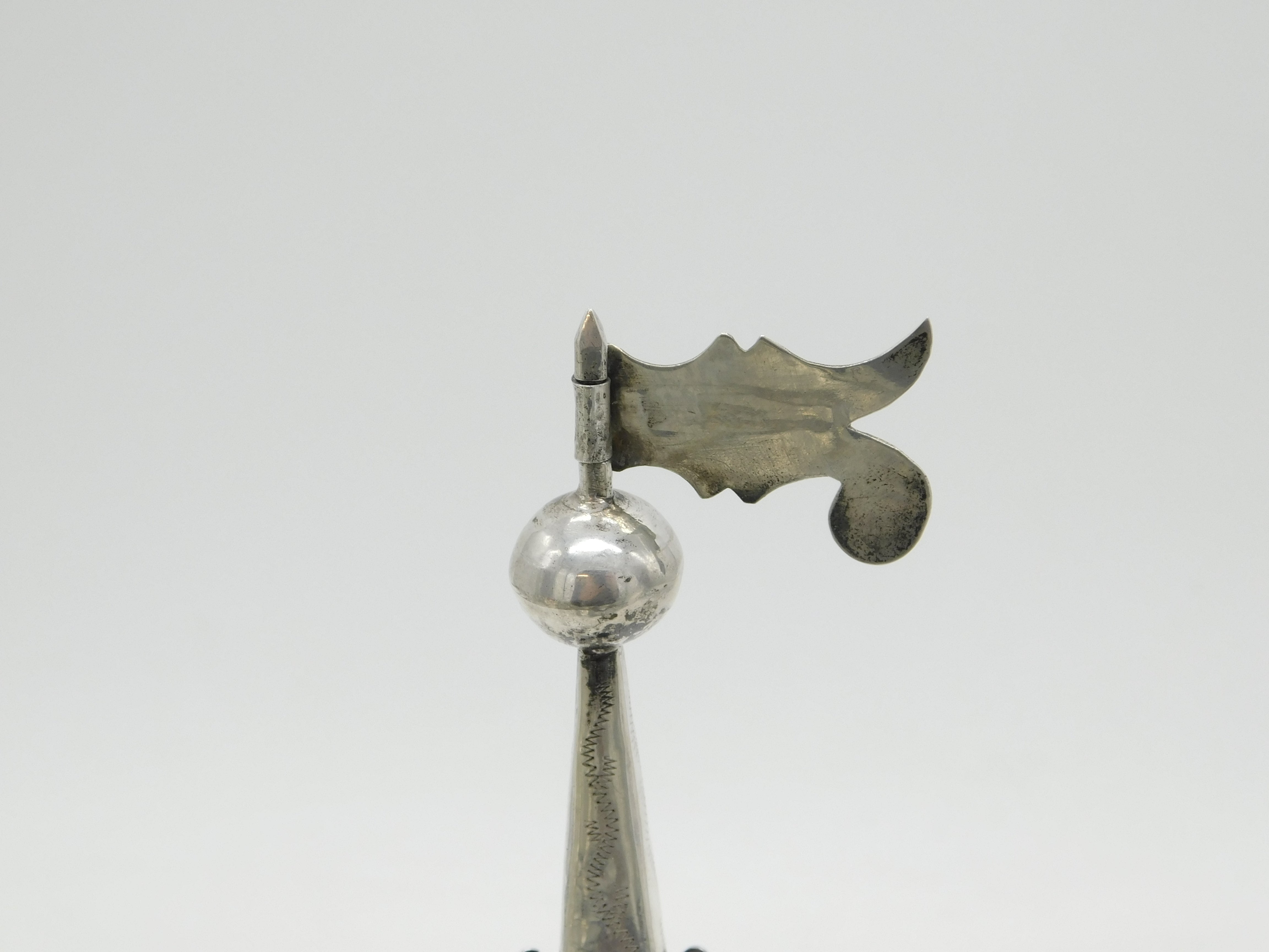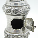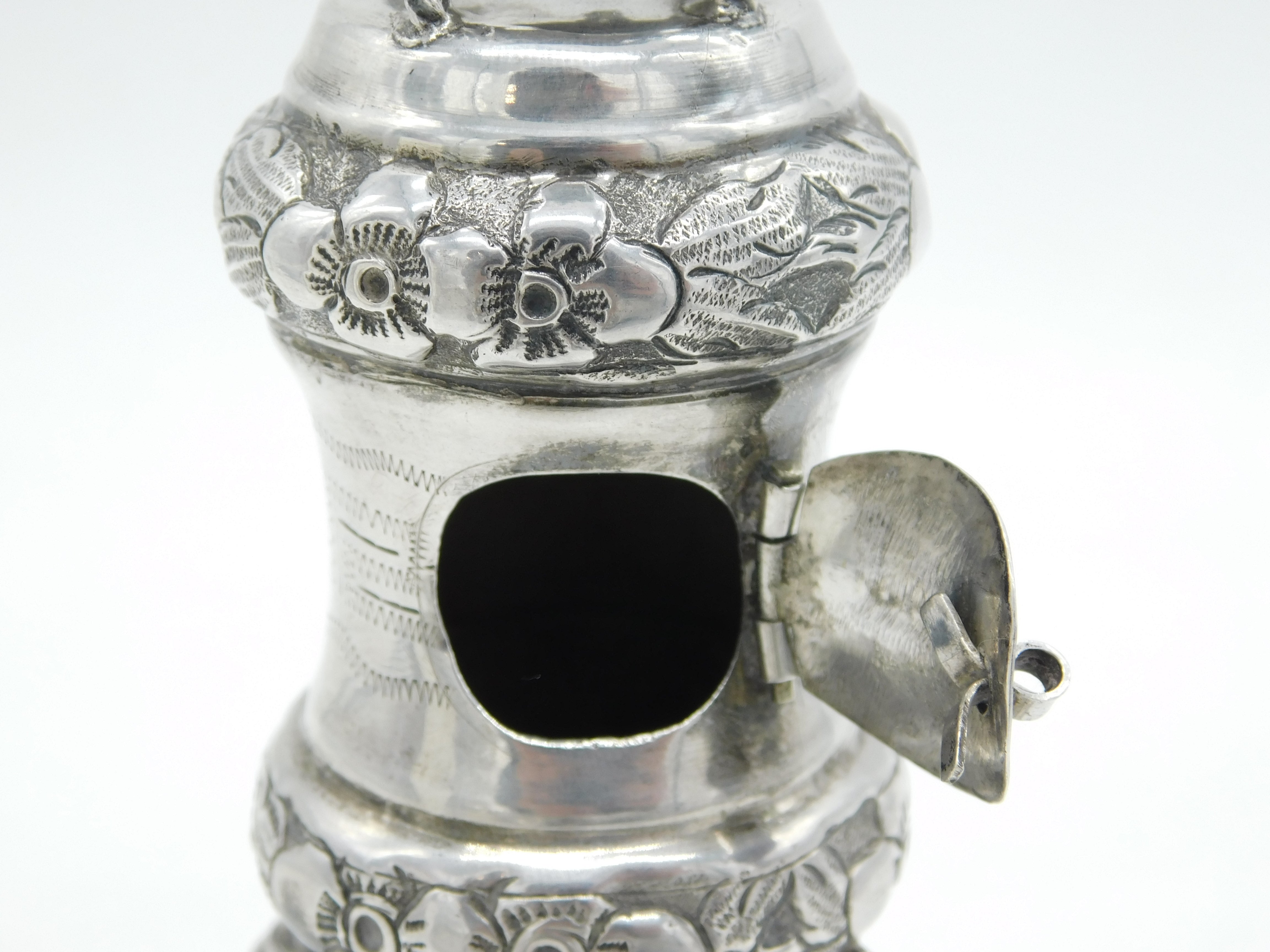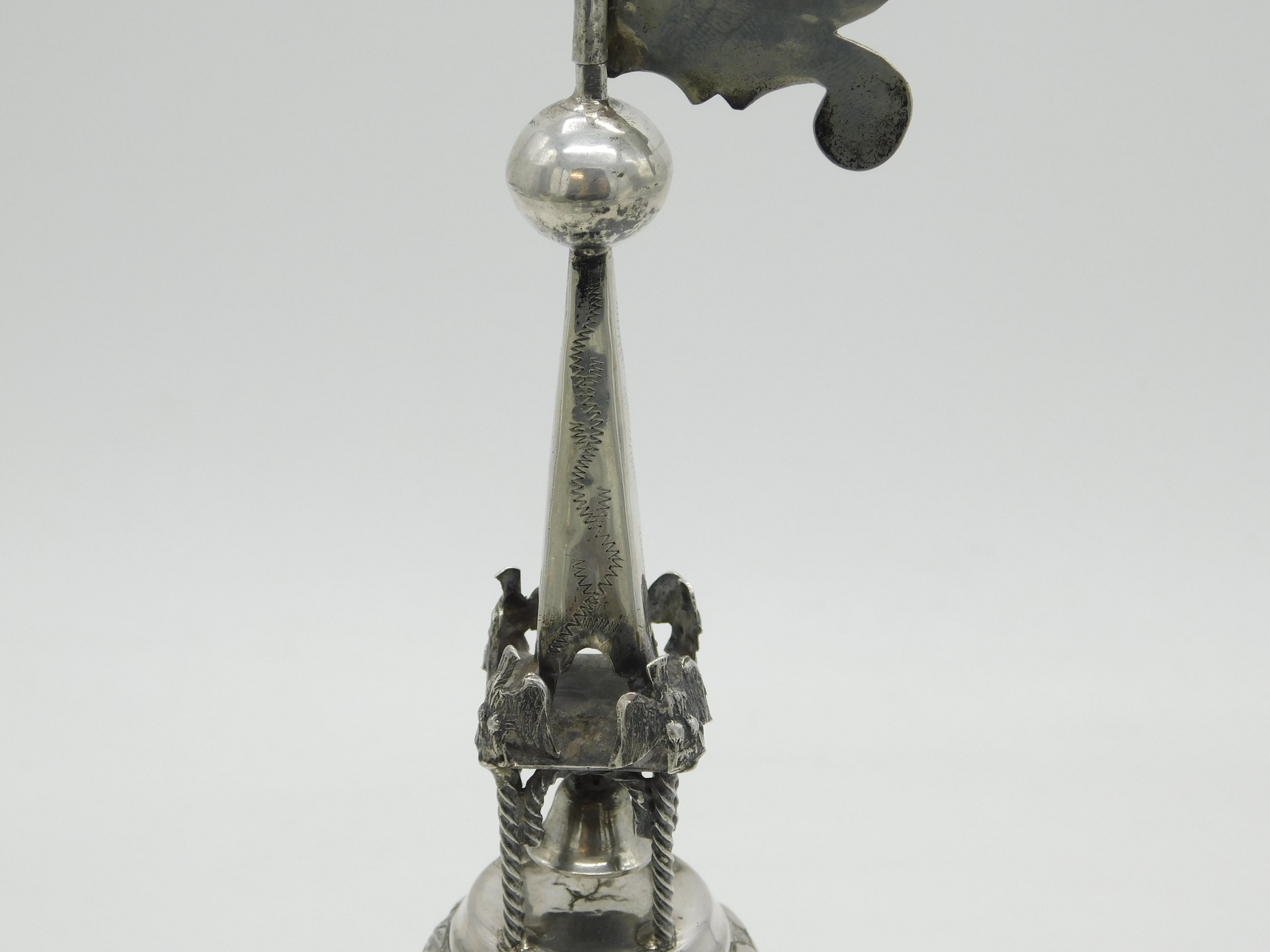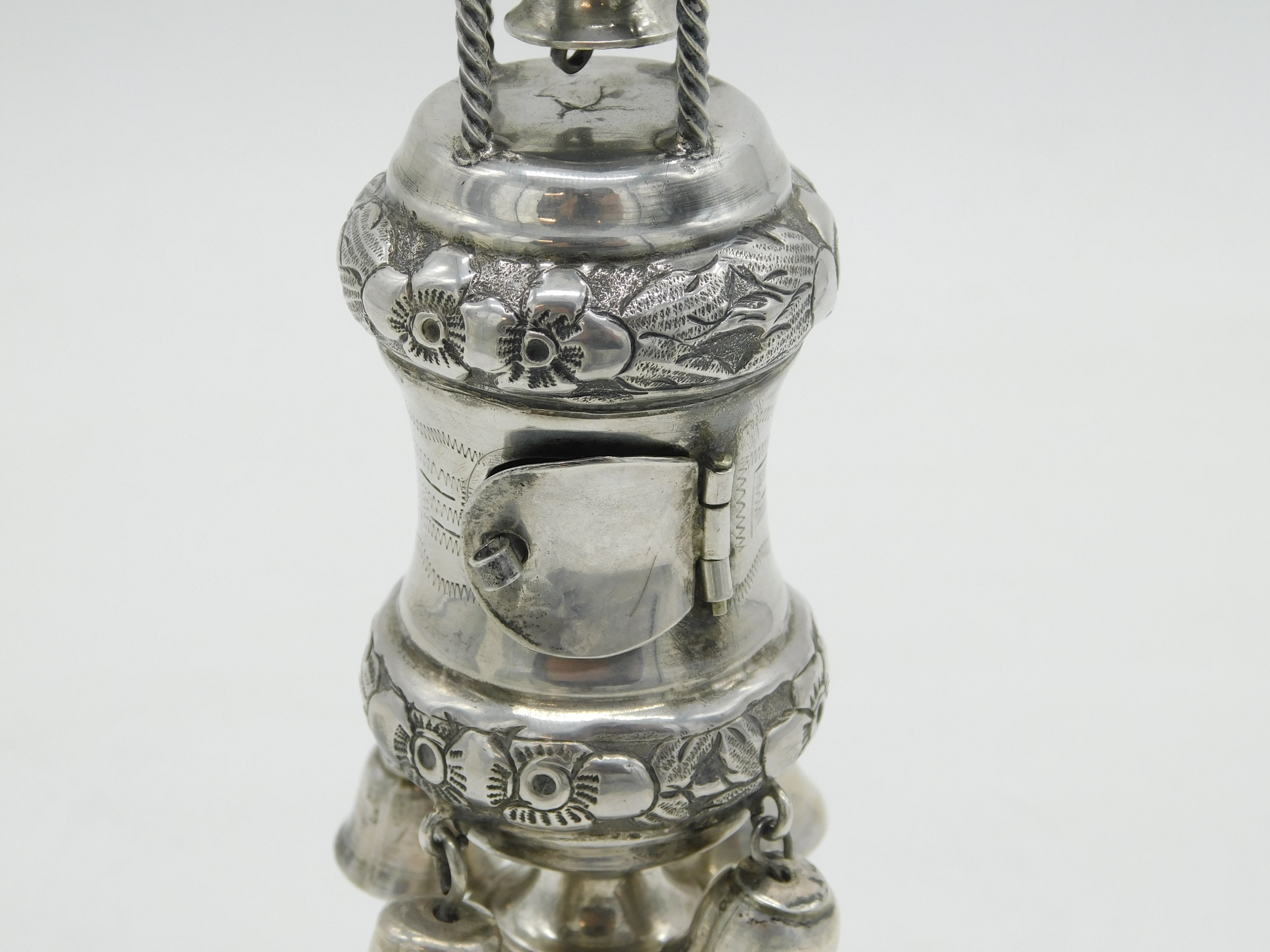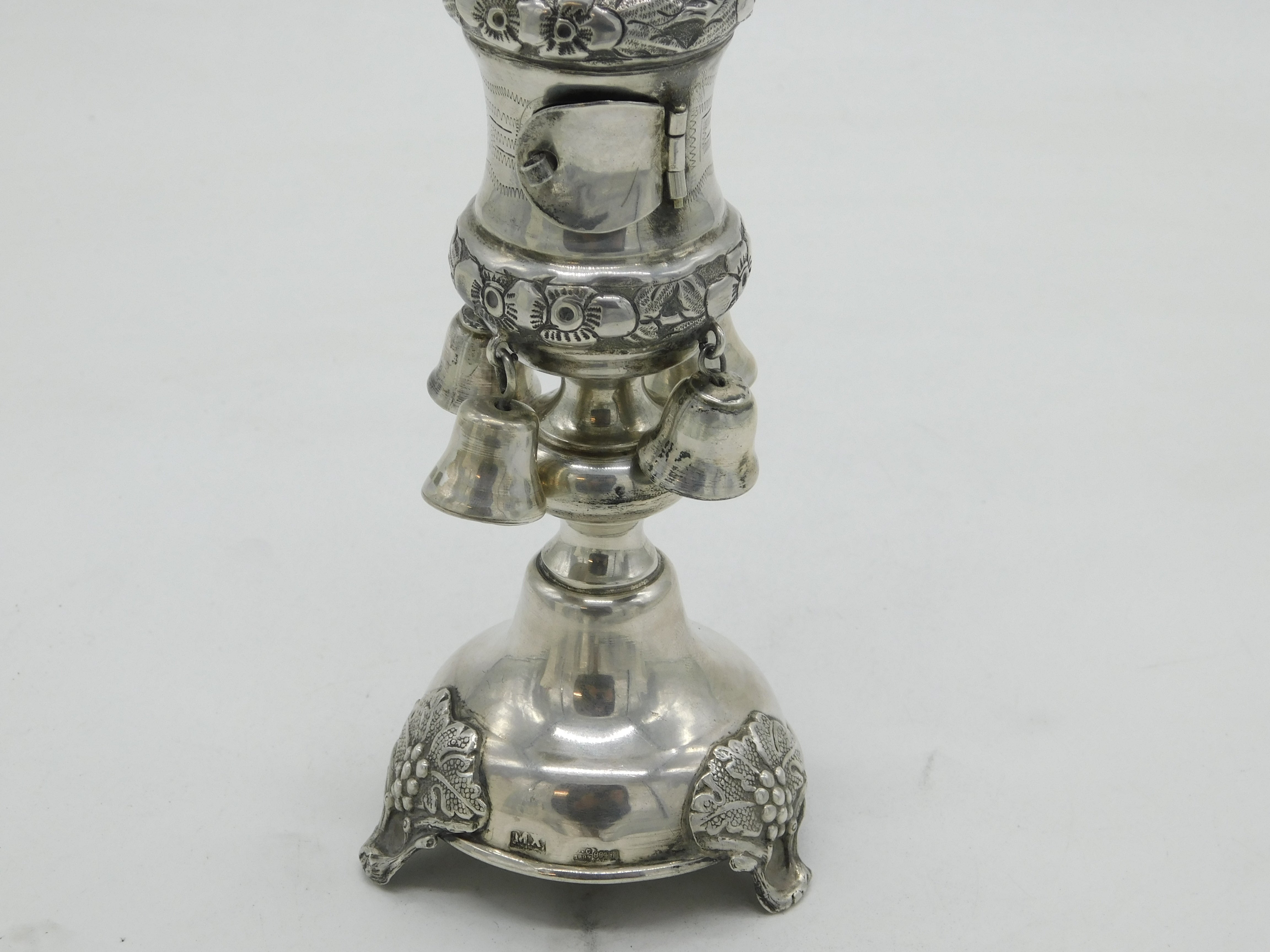 Details: A fantastic and wonderfully designed antique late 19th century imperial Russian .84 standard silver Judaica spice tower in the form a bell tower with flag to the top alongside multiple bells and floral embossed decorations hallmarked to the bottom edge for Moscow 1997 by maker 'MX'. This is a wonderful item that would make a perfect gift or addition to any collection. We are more than happy to provide XRF reports for items upon request.