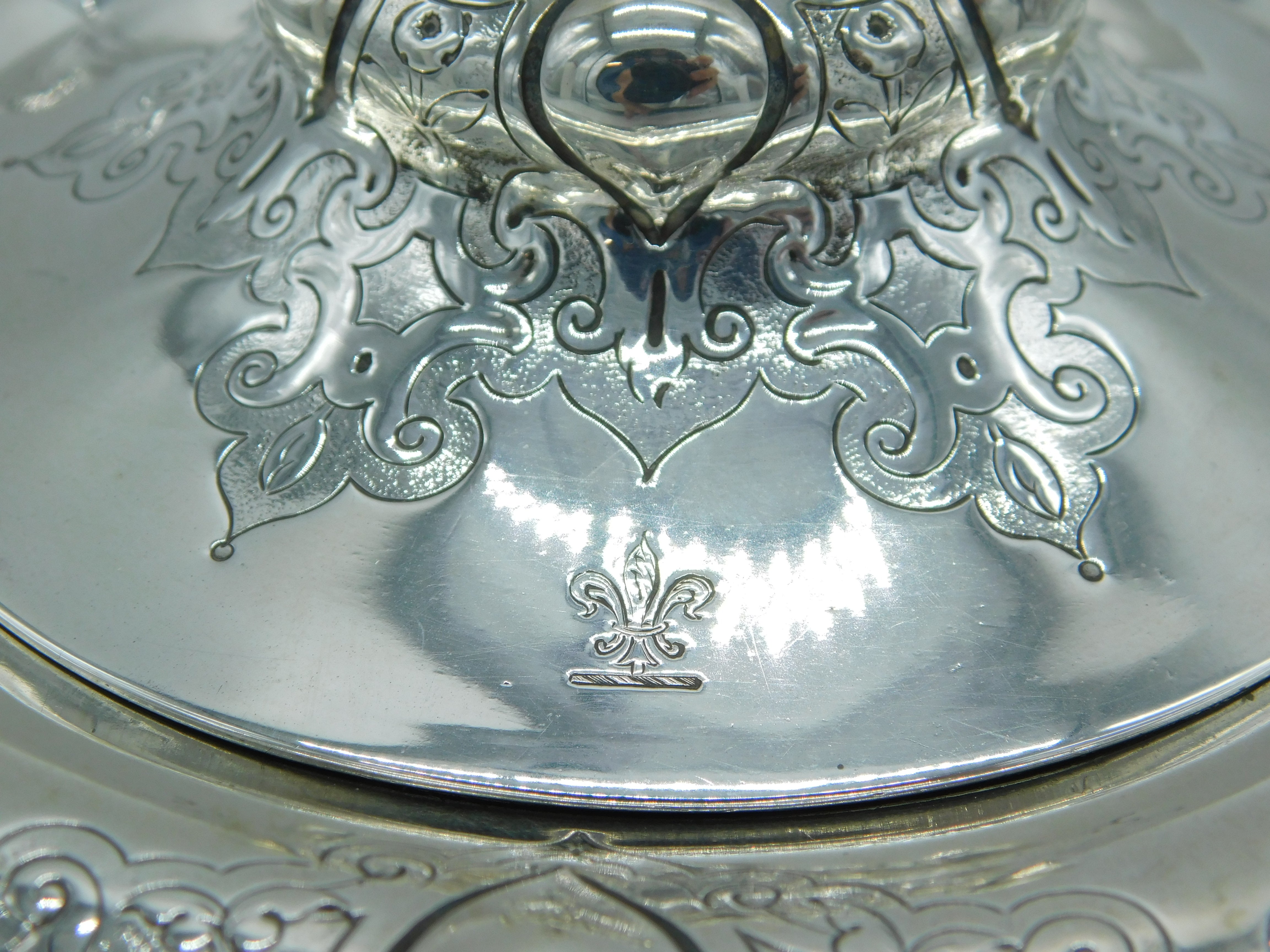 Details: A fantastic and wonderfully designed antique mid-Victorian sterling silver decorative butter dish with superb detailing and patterns throughout to include fleur-de-lis crest hallmarked London 1862 by Edward & John Barnard. This is a wonderful item that would make a perfect gift or addition to any collection. We are more than happy to provide XRF reports for items upon request.