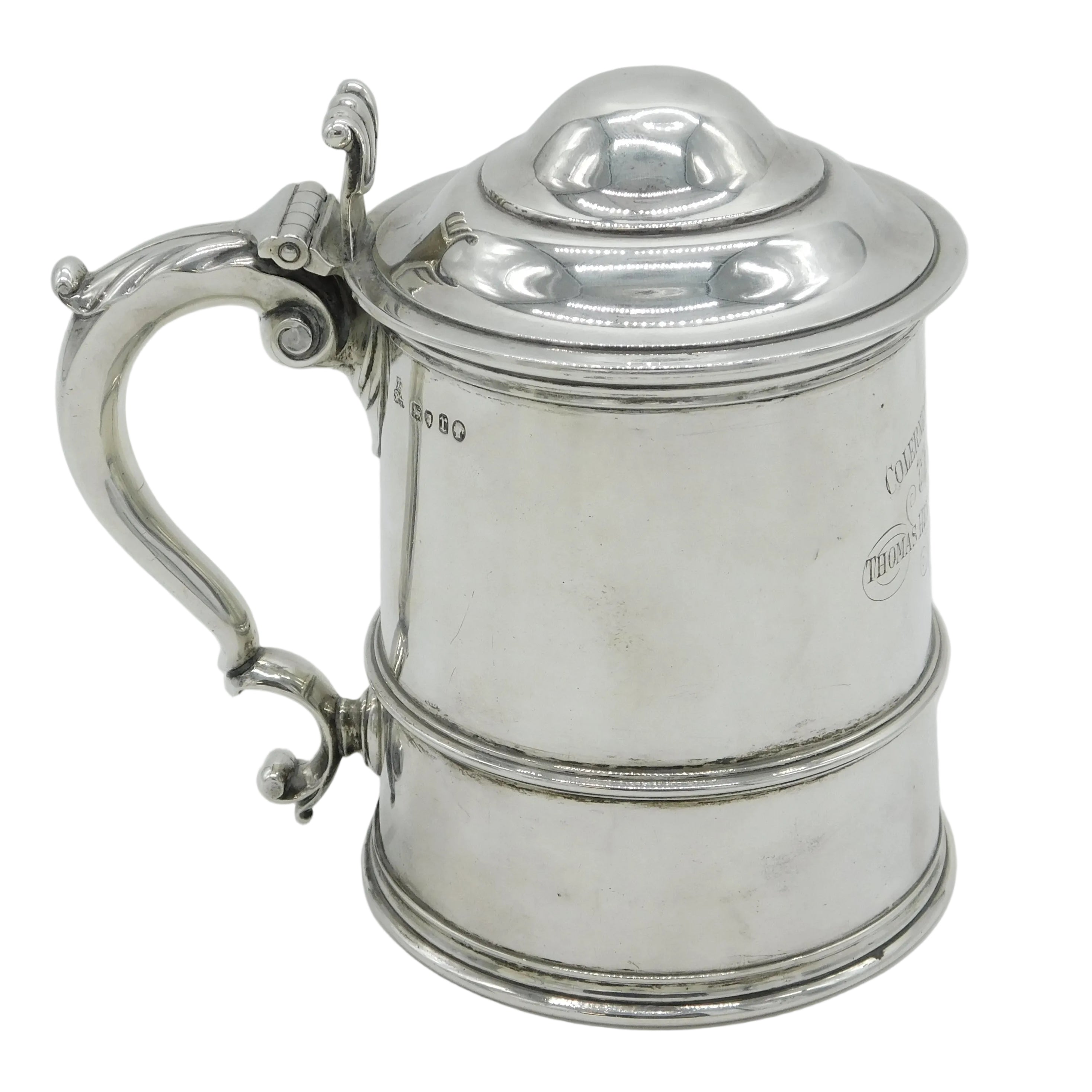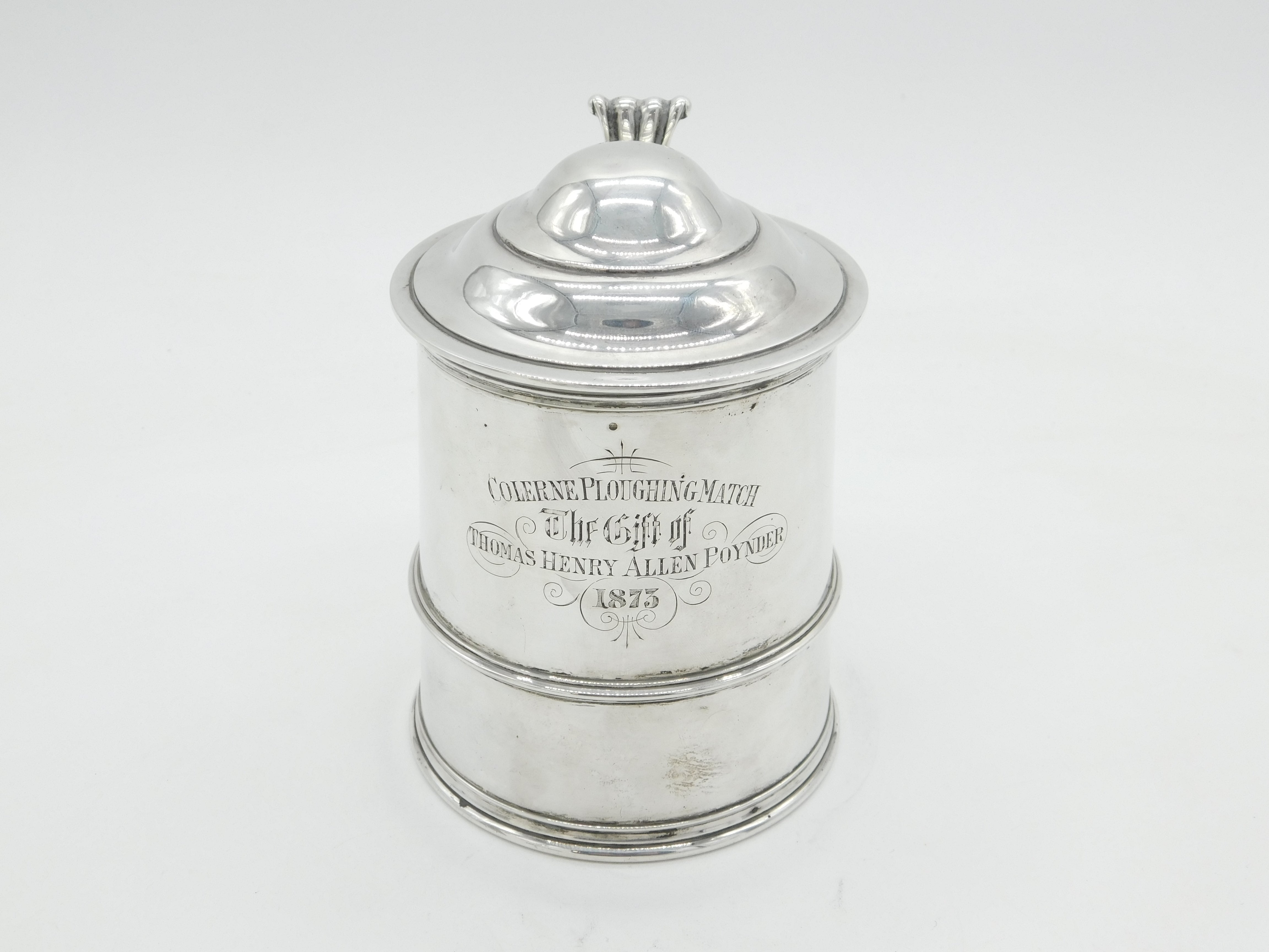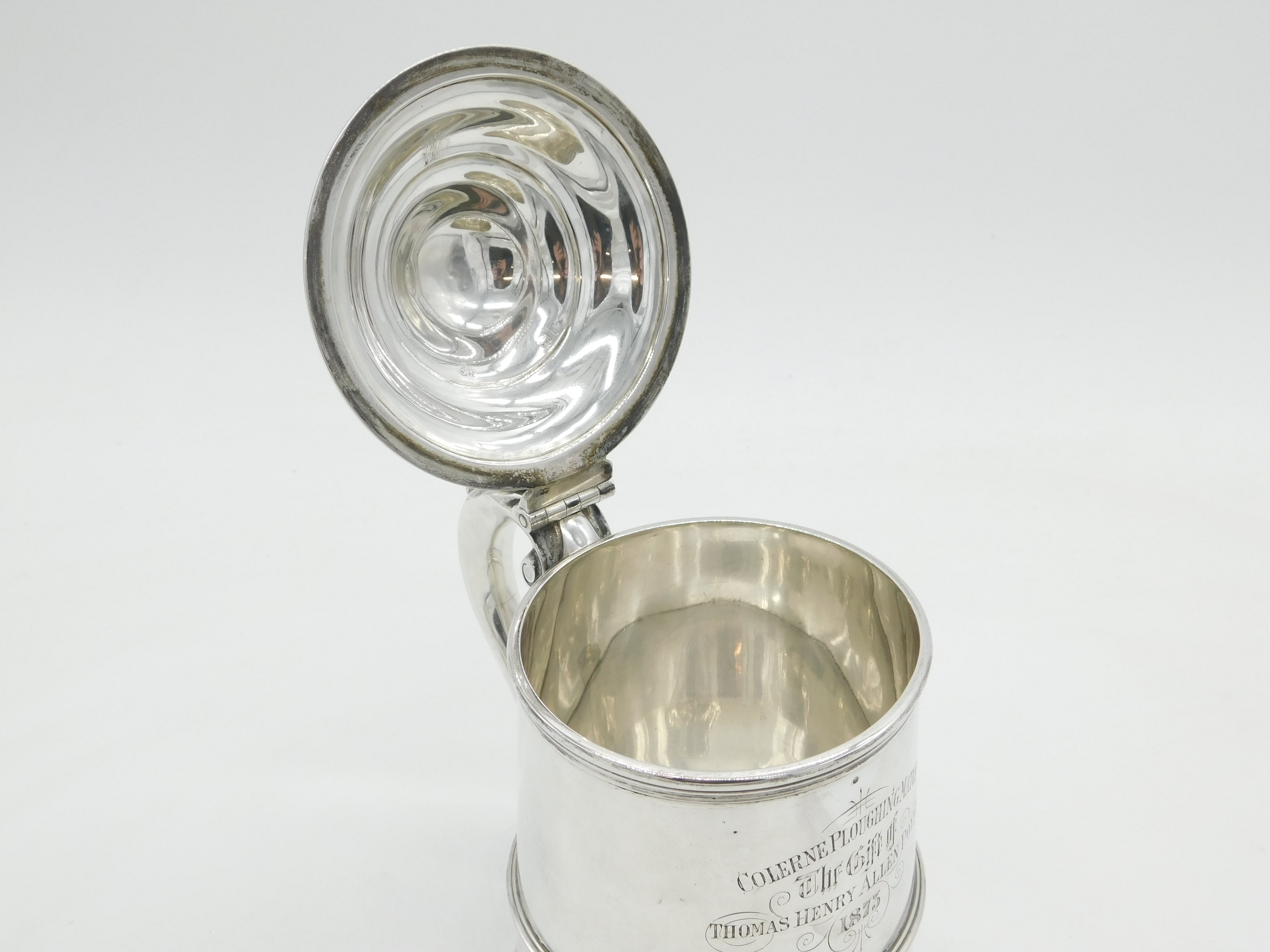Details: A fantastic and wonderfully designed antique Victorian sterling silver lidded stein pint tankard with charming detailing throughout engraved 'Colern Ploughing Match, 1872' to the front hallmarked London 1872 by Robert Garrard subsequently Garrard's. This is a wonderful item that would make a perfect gift or addition to any collection. We are more than happy to provide XRF reports for items upon request.