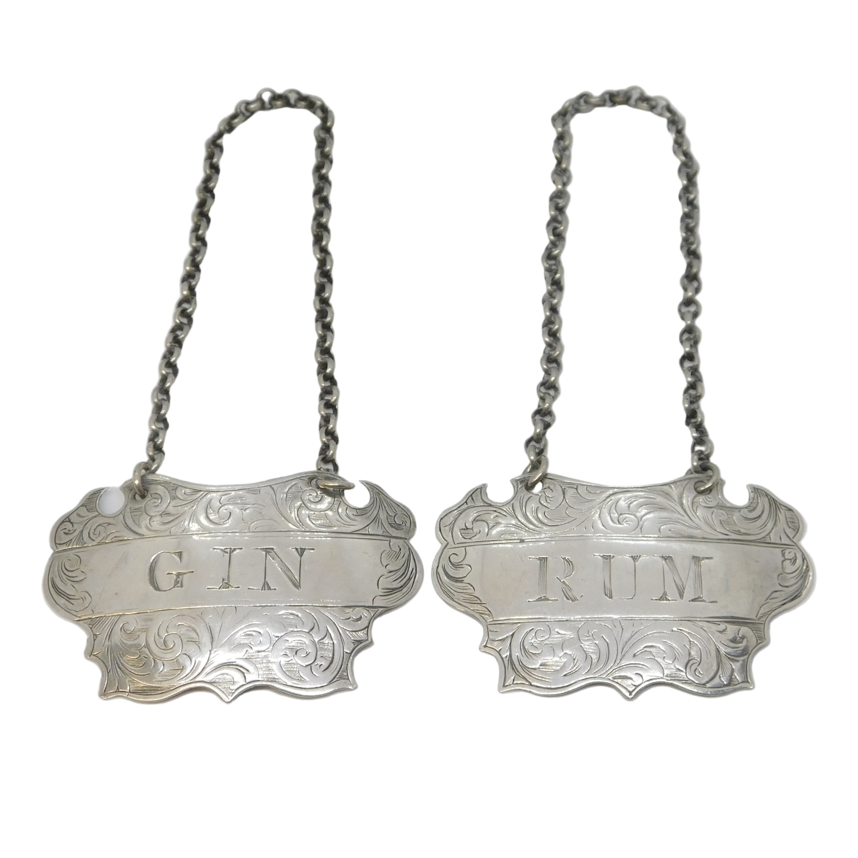 Details: A fantastic and wonderfully designed antique mid-Victorian pair of sterling silver Rum & Gin decanter labels with charming floral patterns throughout hallmarked Birmingham 1857 to the reverse by John Tongue. This is a wonderful item that would make a perfect gift or addition to any collection.