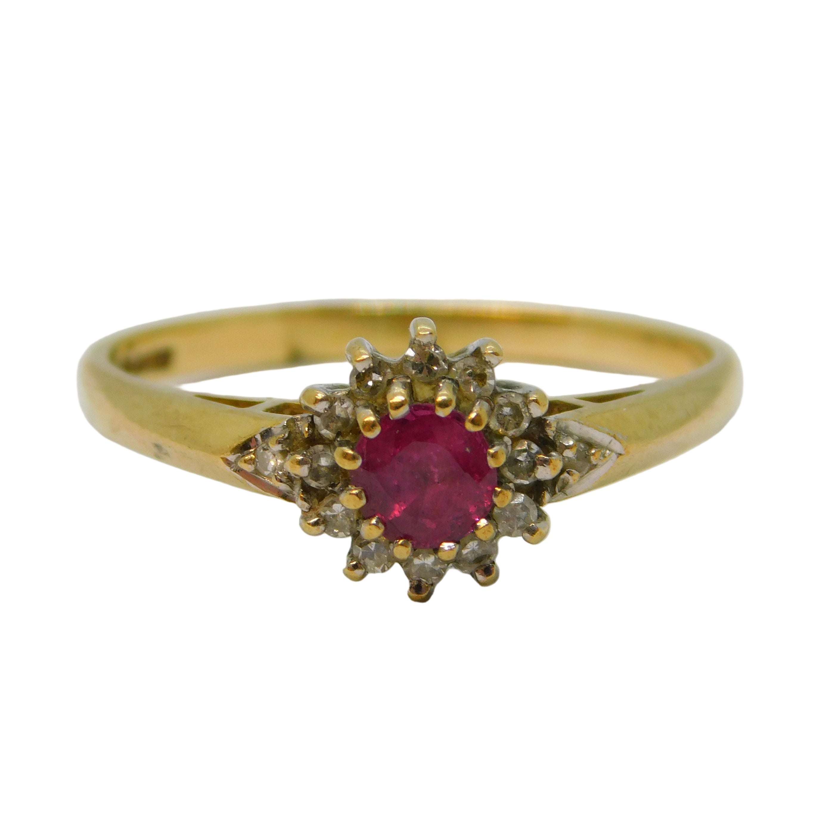 9ct Yellow Gold, Ruby & Diamond Set Floral Cluster Ring Vintage 1993 London