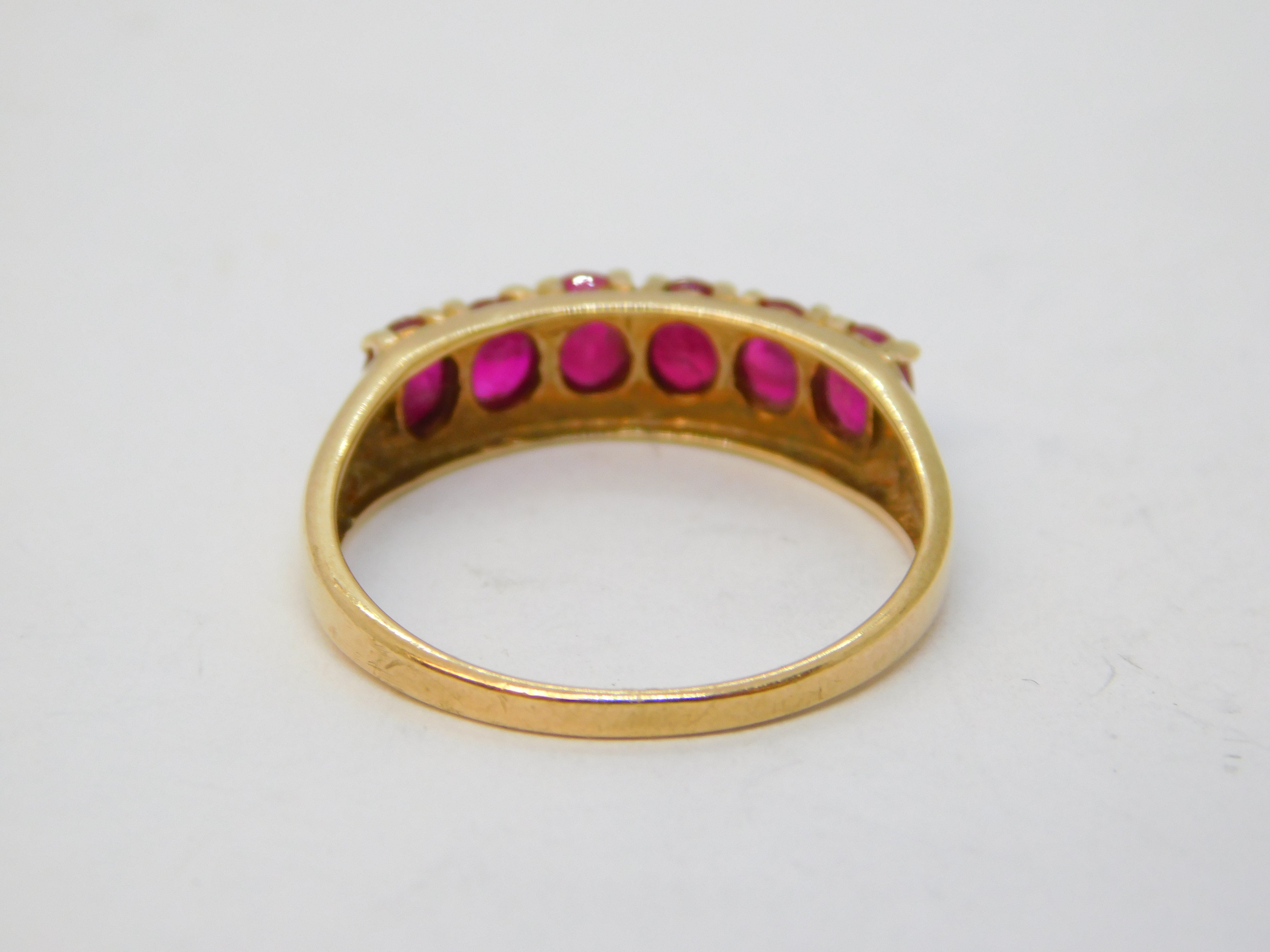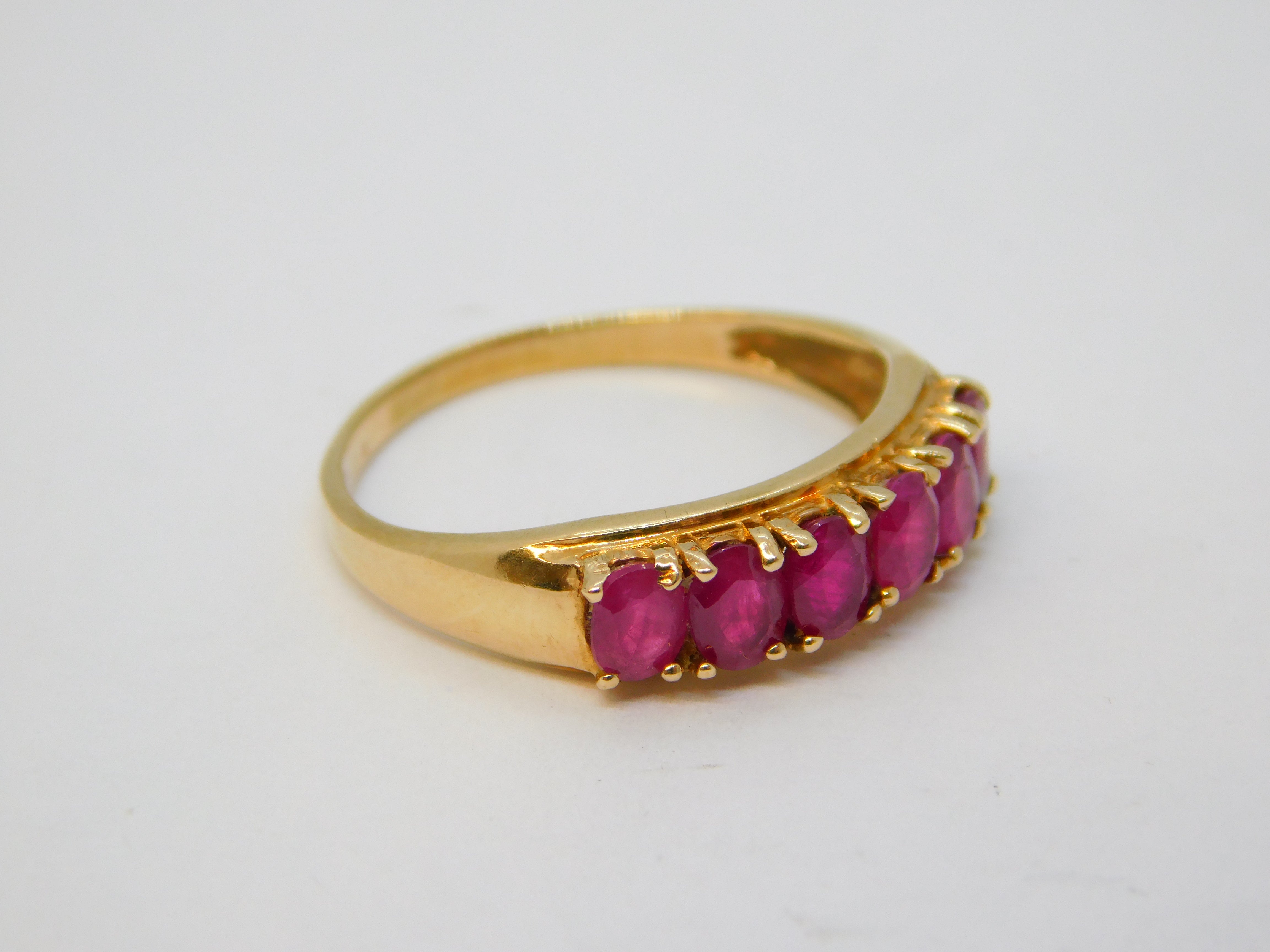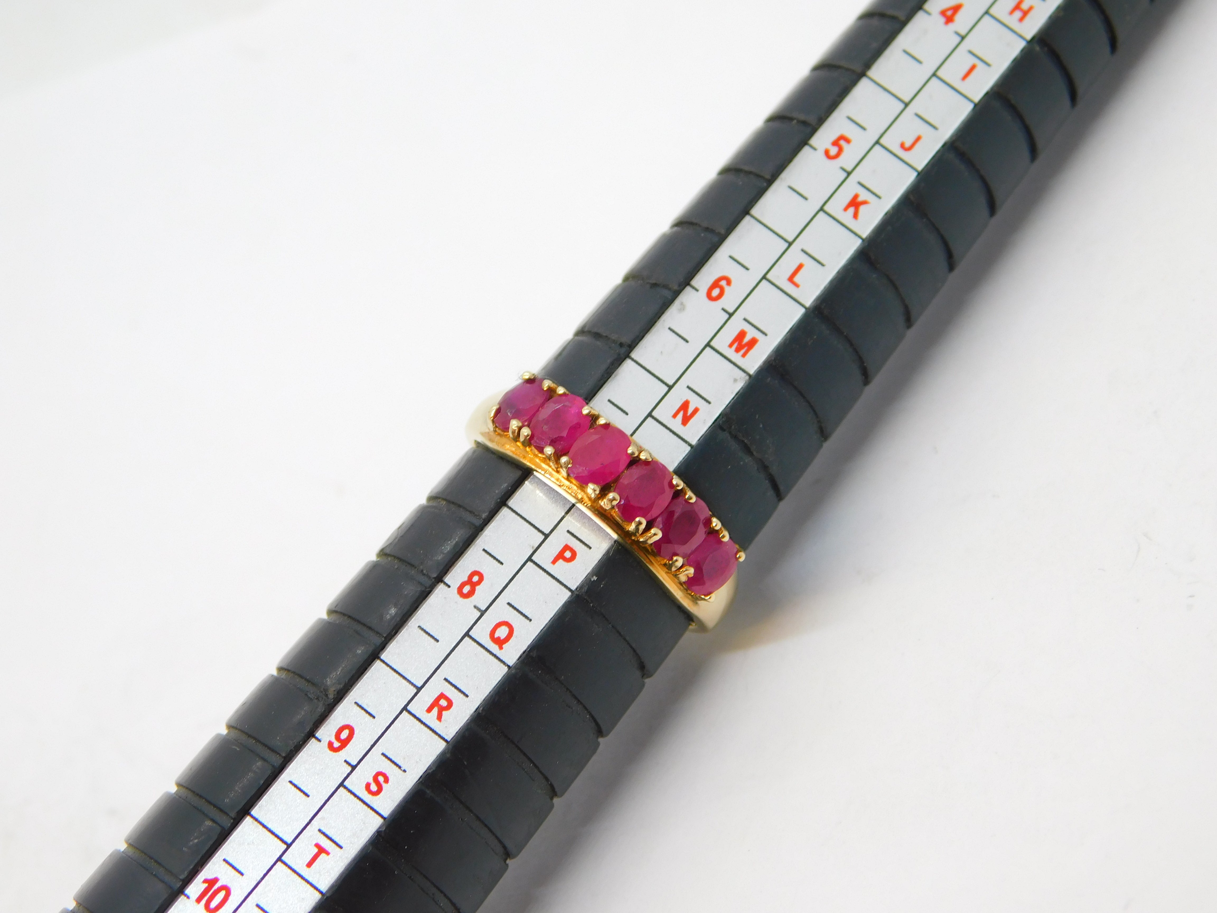 Details: A fantastic and wonderfully designed vintage 10ct yellow gold six-stone dress ring set with oval cut natural rubies, the gold has been XRF tested and the rubies have been machine tested. This is a wonderful item that would make a perfect gift or addition to any collection. We are more than happy to provide XRF reports for items upon request.