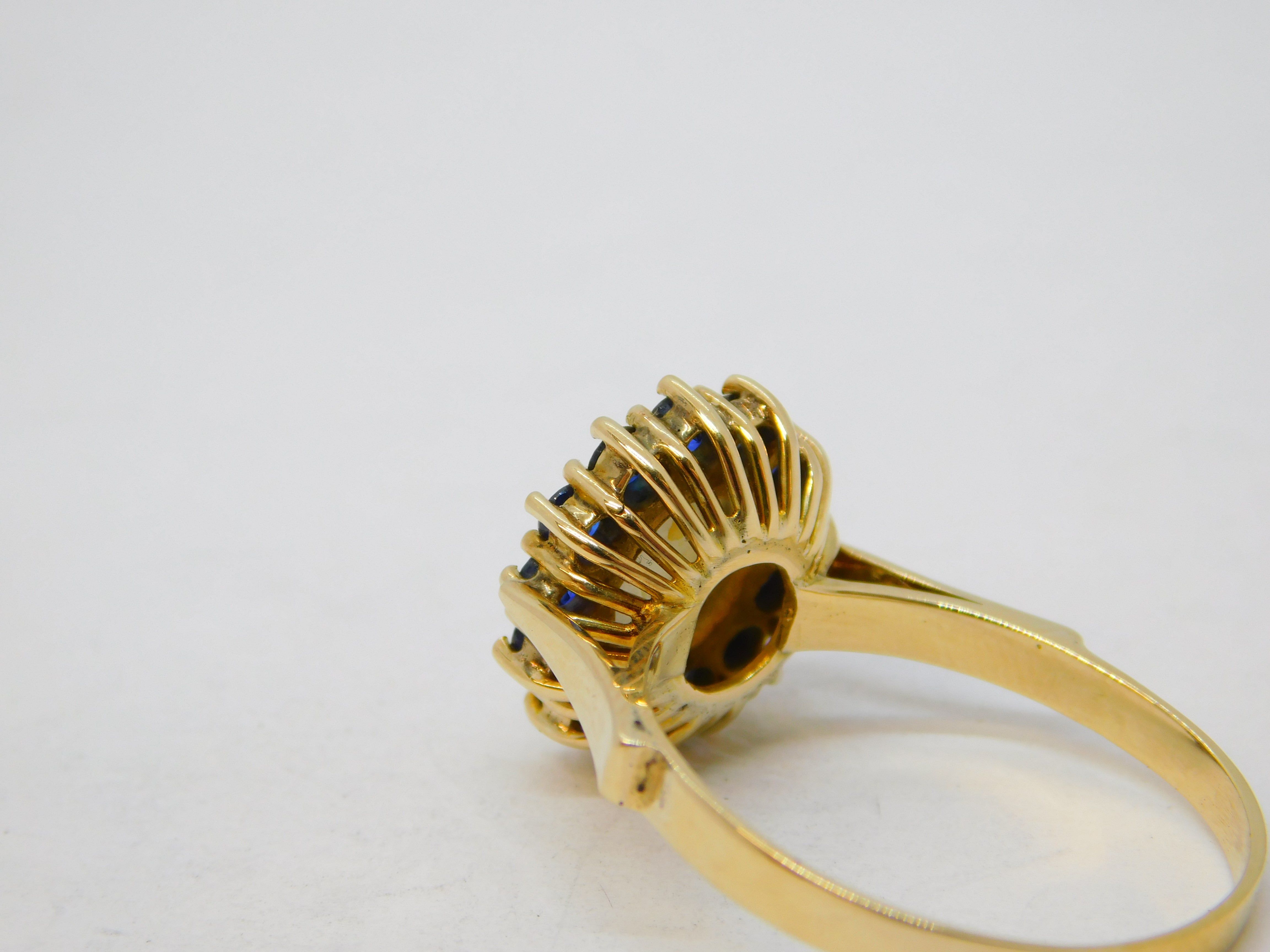 Details: A fantastic and wonderfully designed vintage 14ct yellow gold floral cluster ring set with a central white star sapphire flanked with blue sapphires c1960, the gold has been XRF tested as it is unmarked, the stones have been tested, lovely star sapphire under the light. This is a wonderful item that would make a perfect gift or addition to any collection.