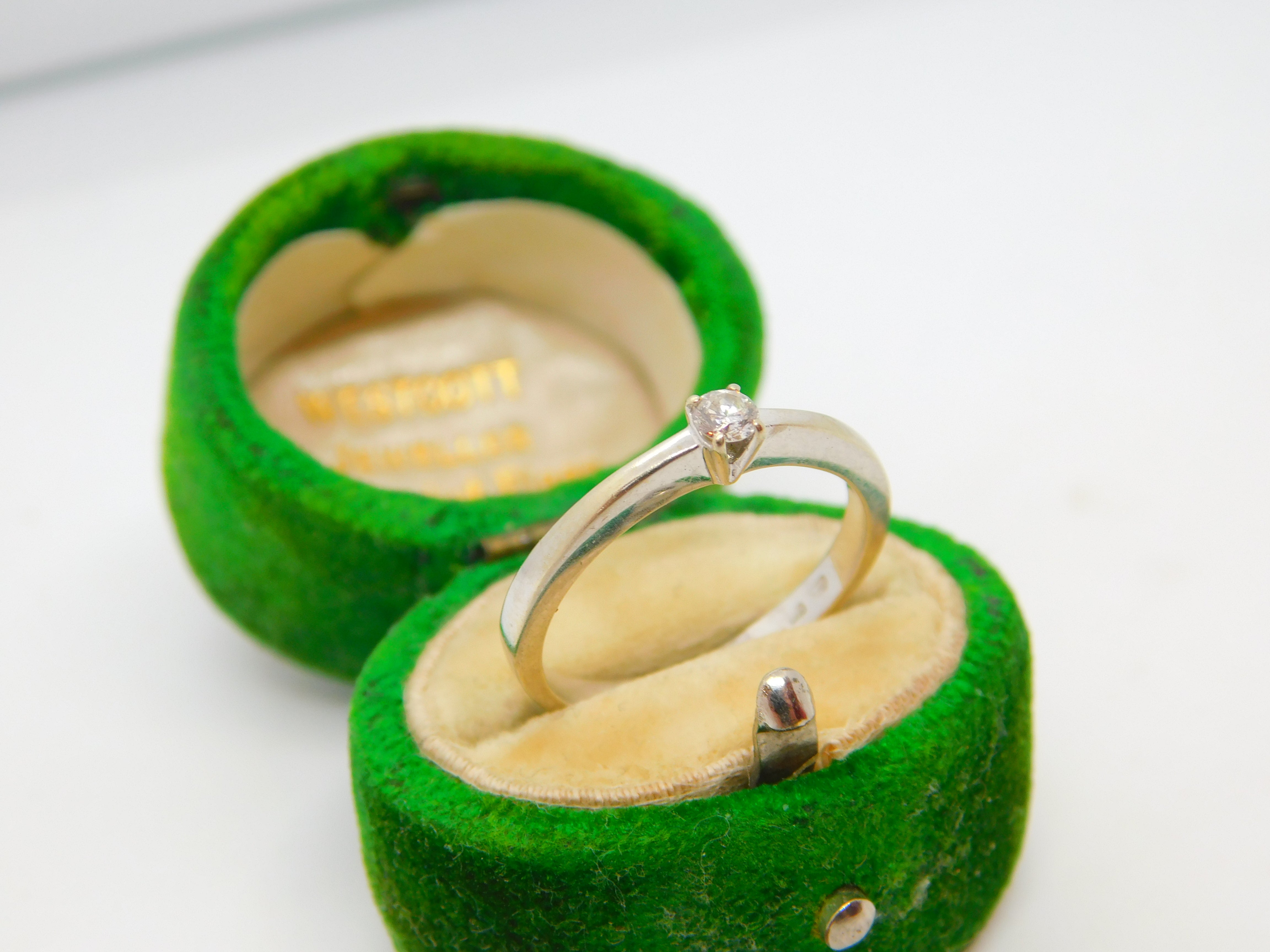 Details: A fantastic and wonderfully designed vintage 14ct white gold solitaire ring set with a central 0.1ct diamond hallmarked to the interior band c1970. The diamond has been tested. This is a wonderful item that would make a perfect gift or addition to any collection. The BOX pictured is for PRESENTATION ONLY and is NOT included in the listings but used to frame the pictures unless specifically stated otherwise.