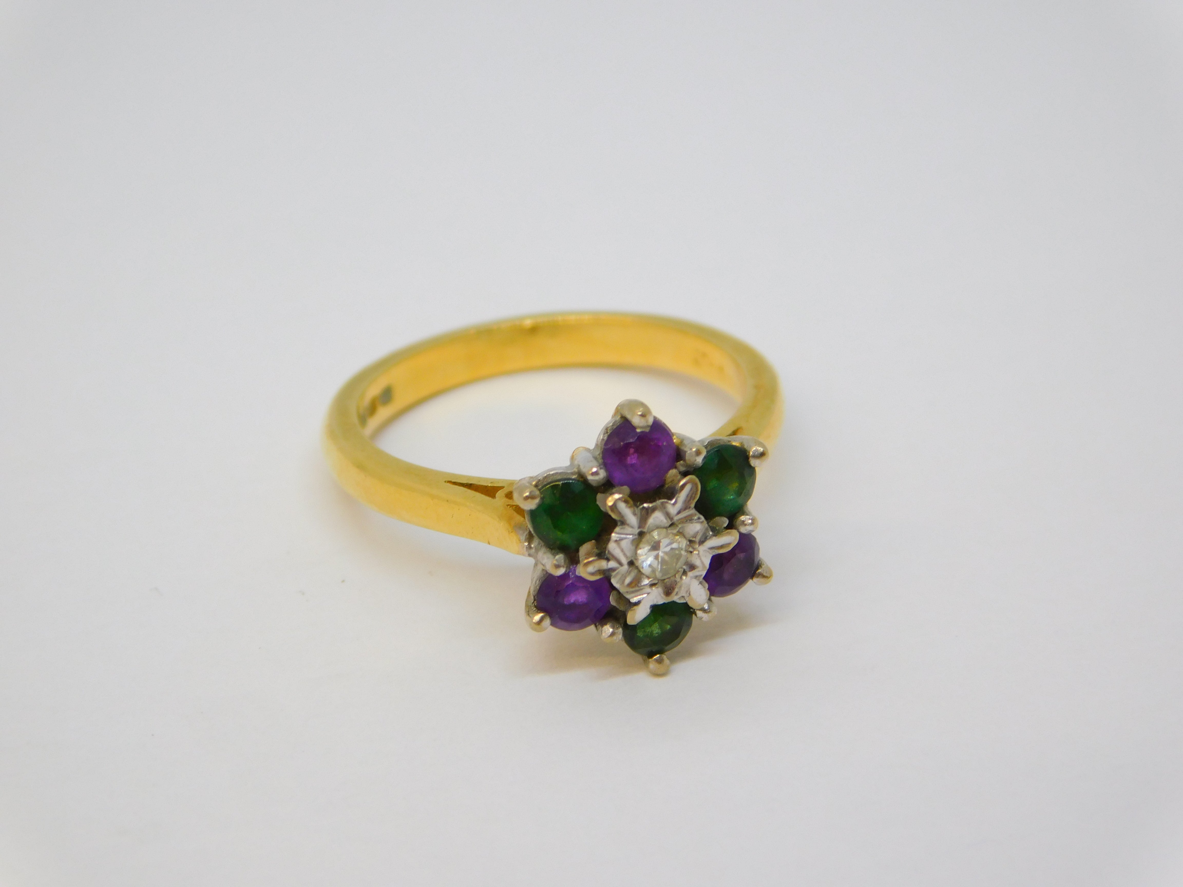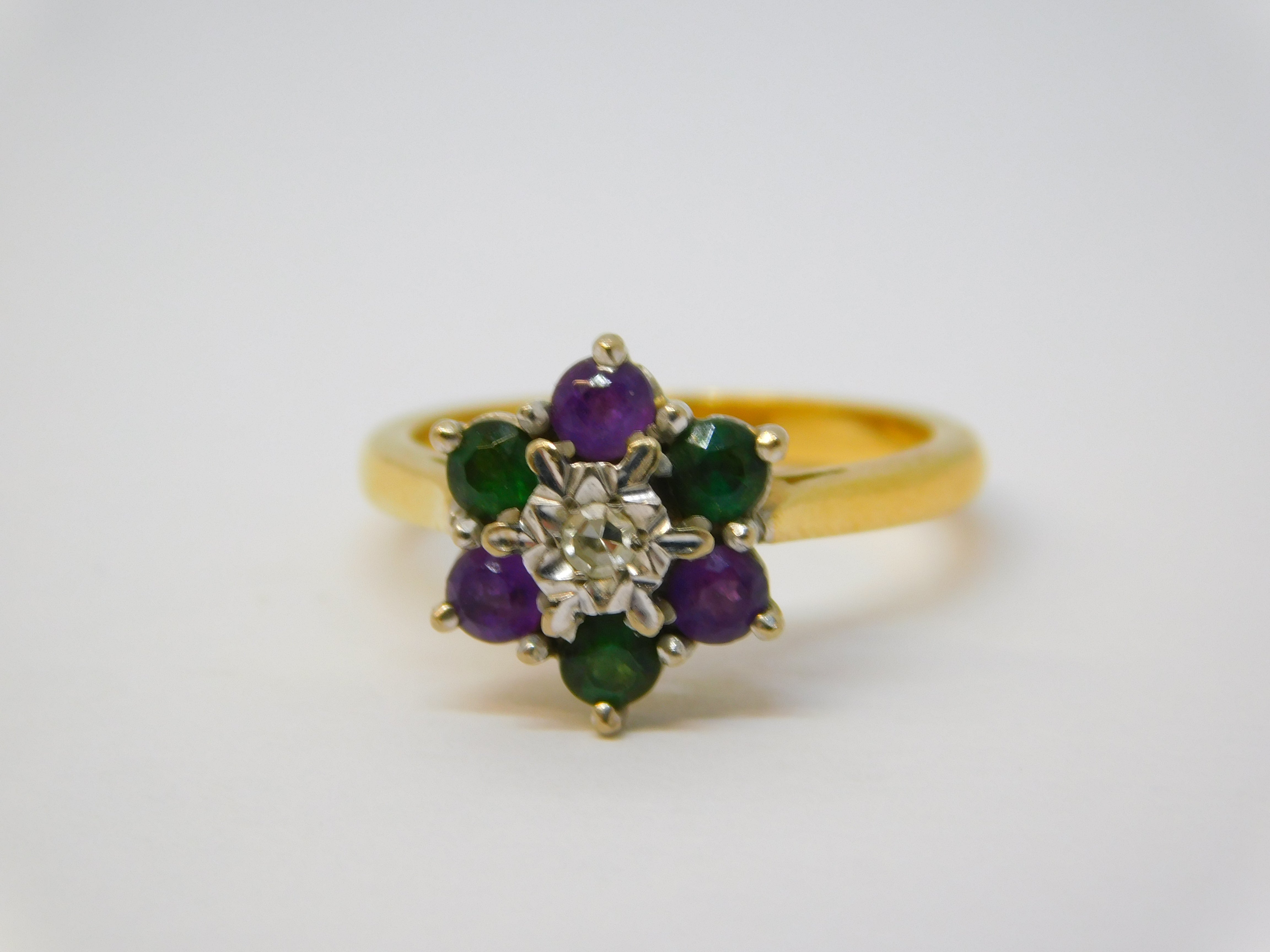 Details: A fantastic and wonderfully designed vintage 18ct yellow gold floral cluster ring set with amethyst and emeralds, colours representing the Suffragette movement, set with a central brilliant cut diamond hallmarked London 1970 to the interior band, the stones have all been tested. This is a wonderful item that would make a perfect gift or addition to any collection.