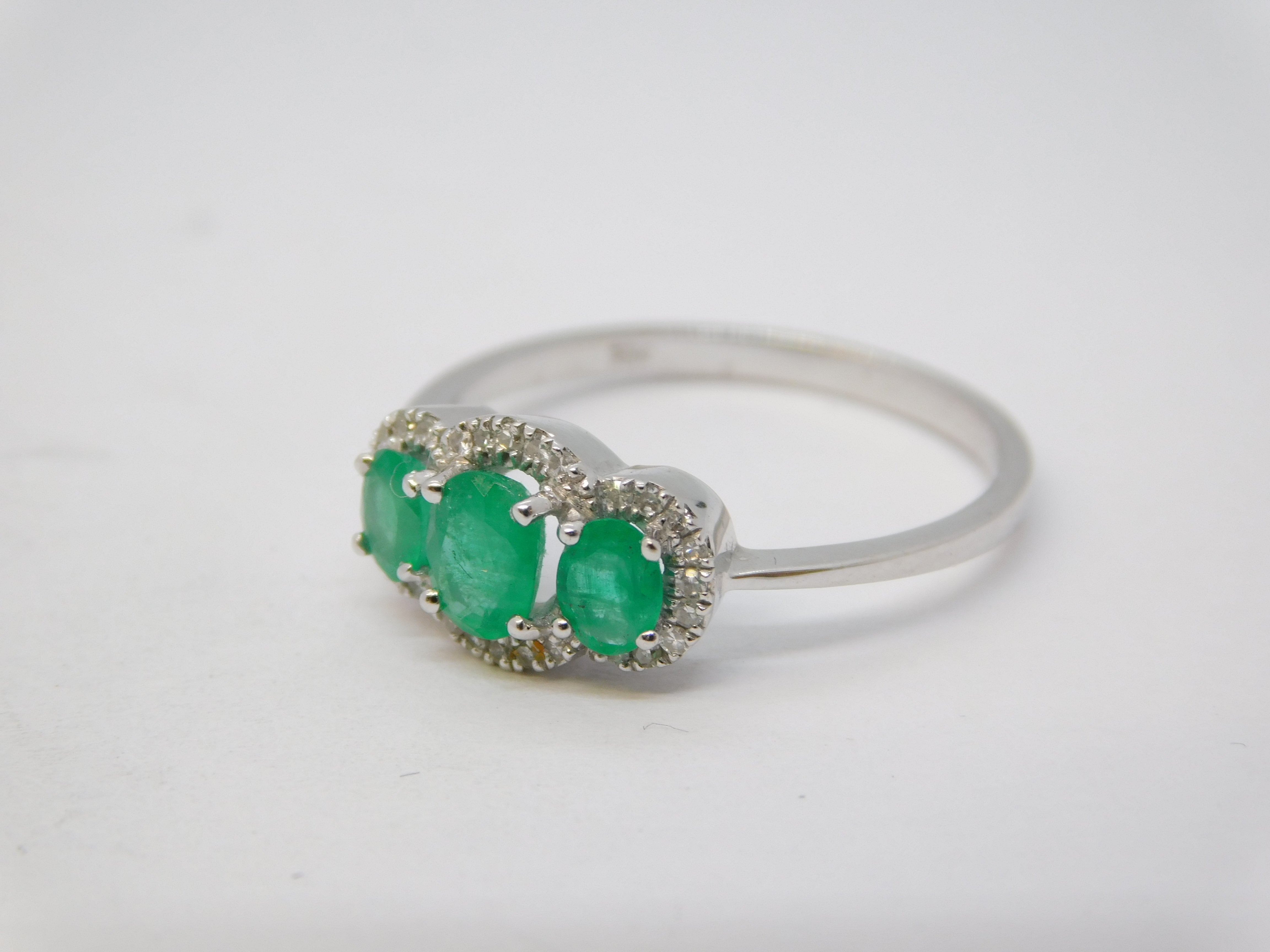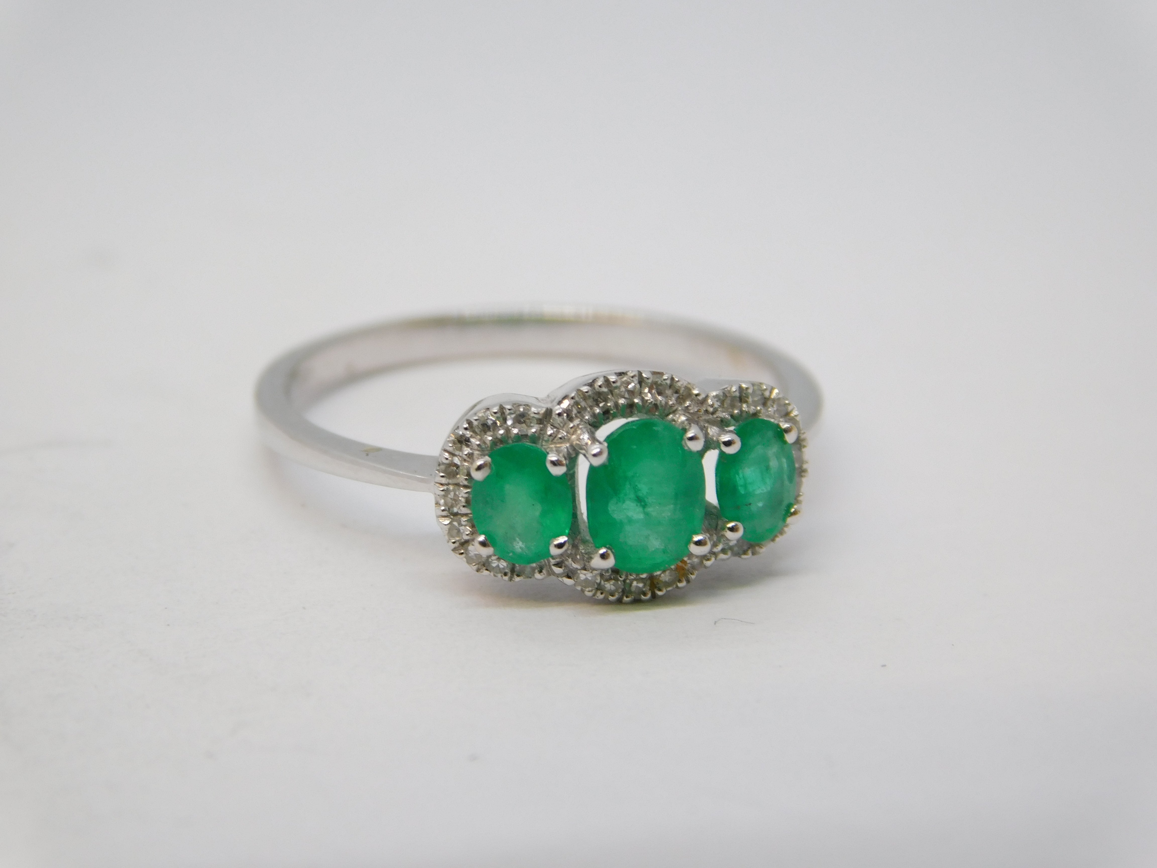 Details: A fantastic and wonderfully designed vintage 18ct white gold dress ring or engagement ring set with three central emeralds flanked with small diamonds hallmarked to the interior c1990, the stones have been tested. This is a wonderful item that would make a perfect gift or addition to any collection.