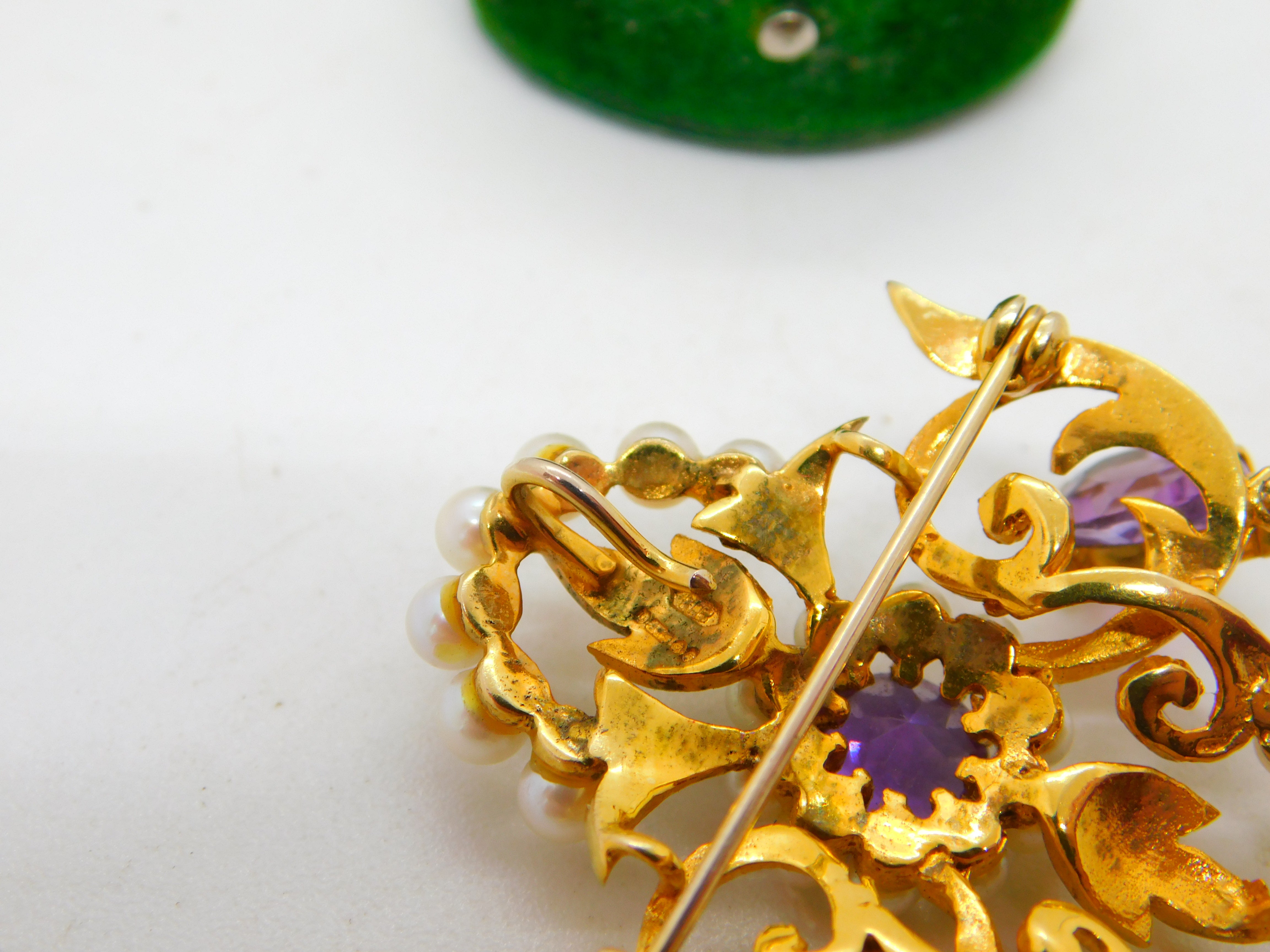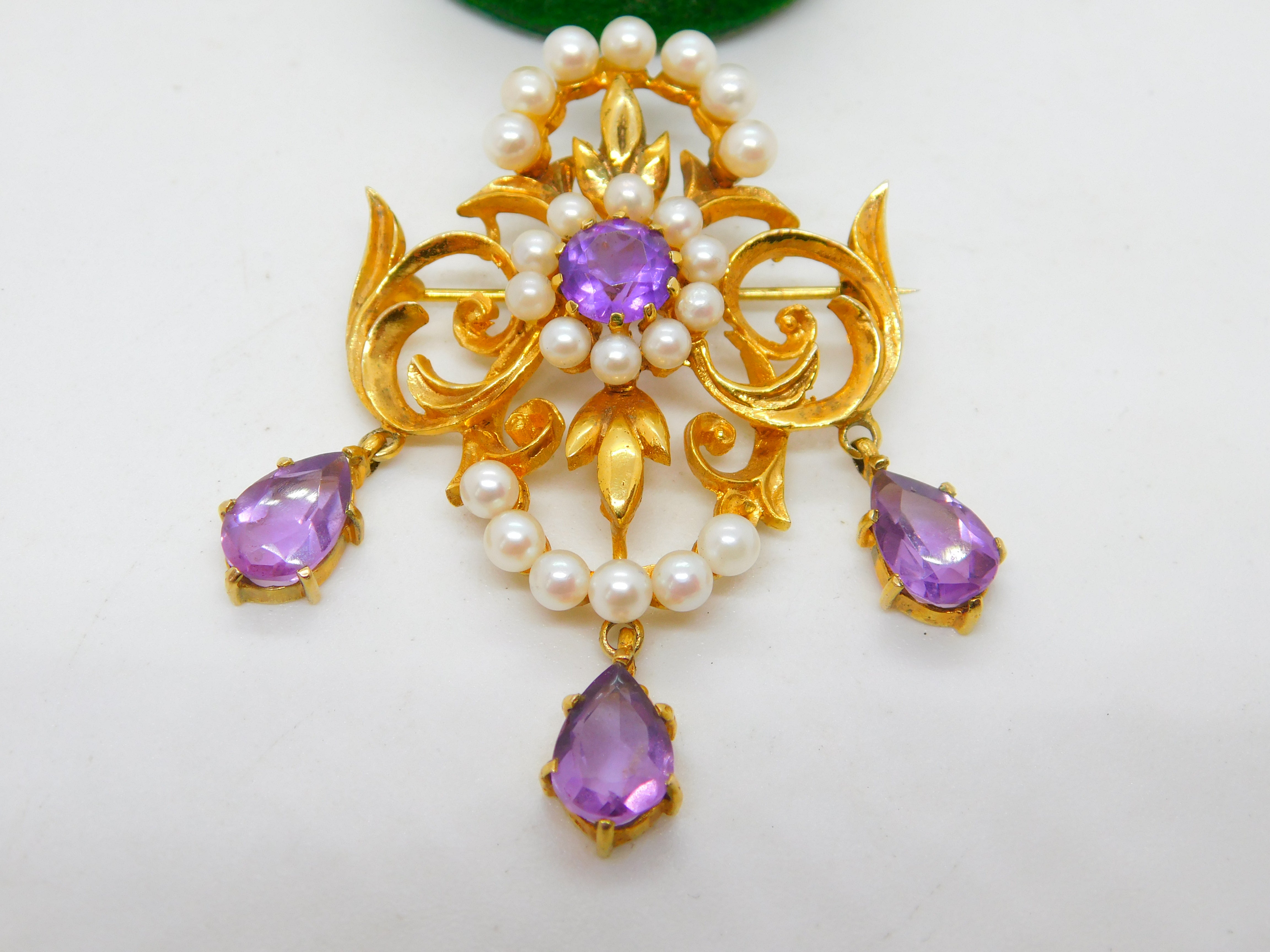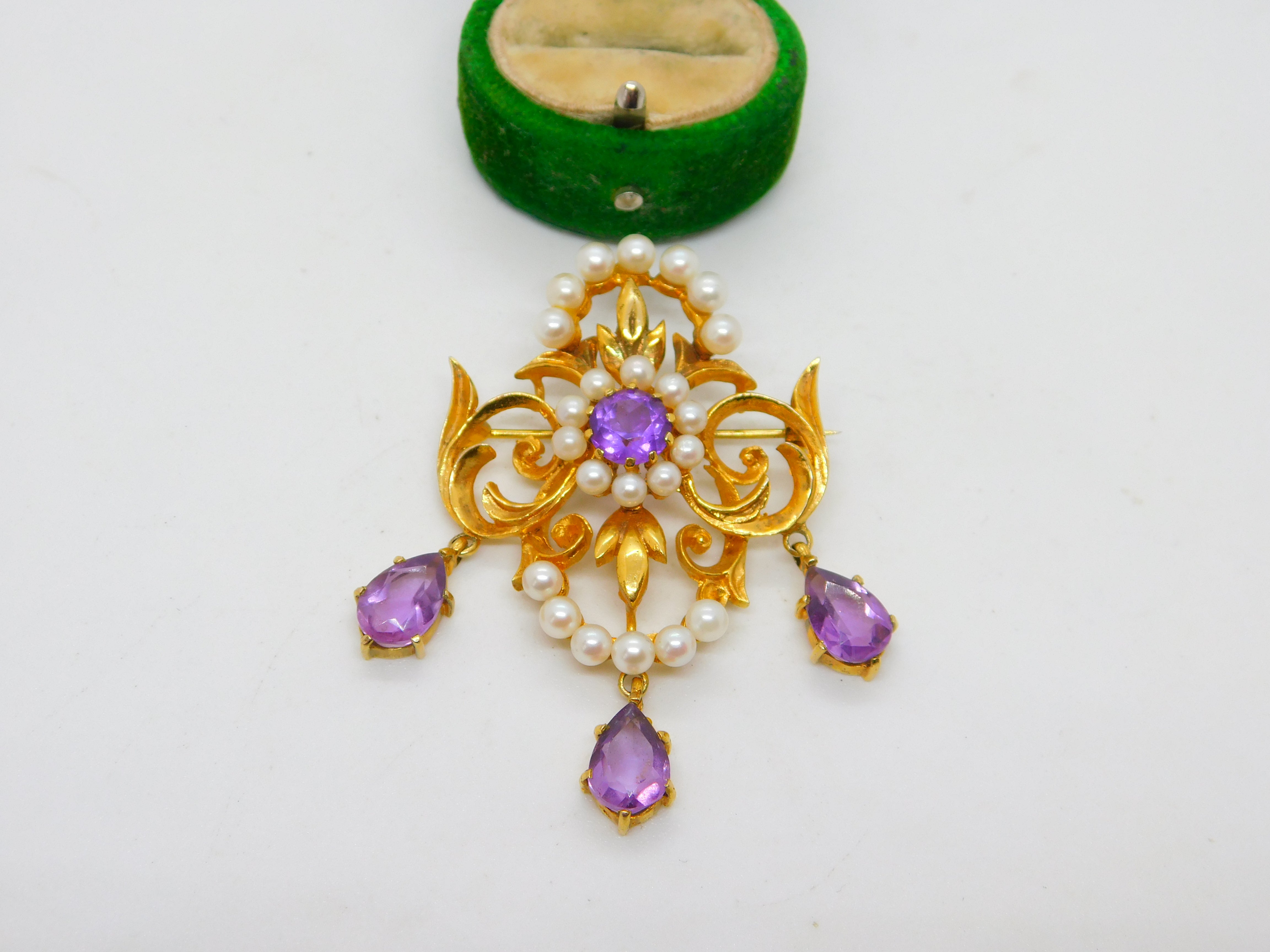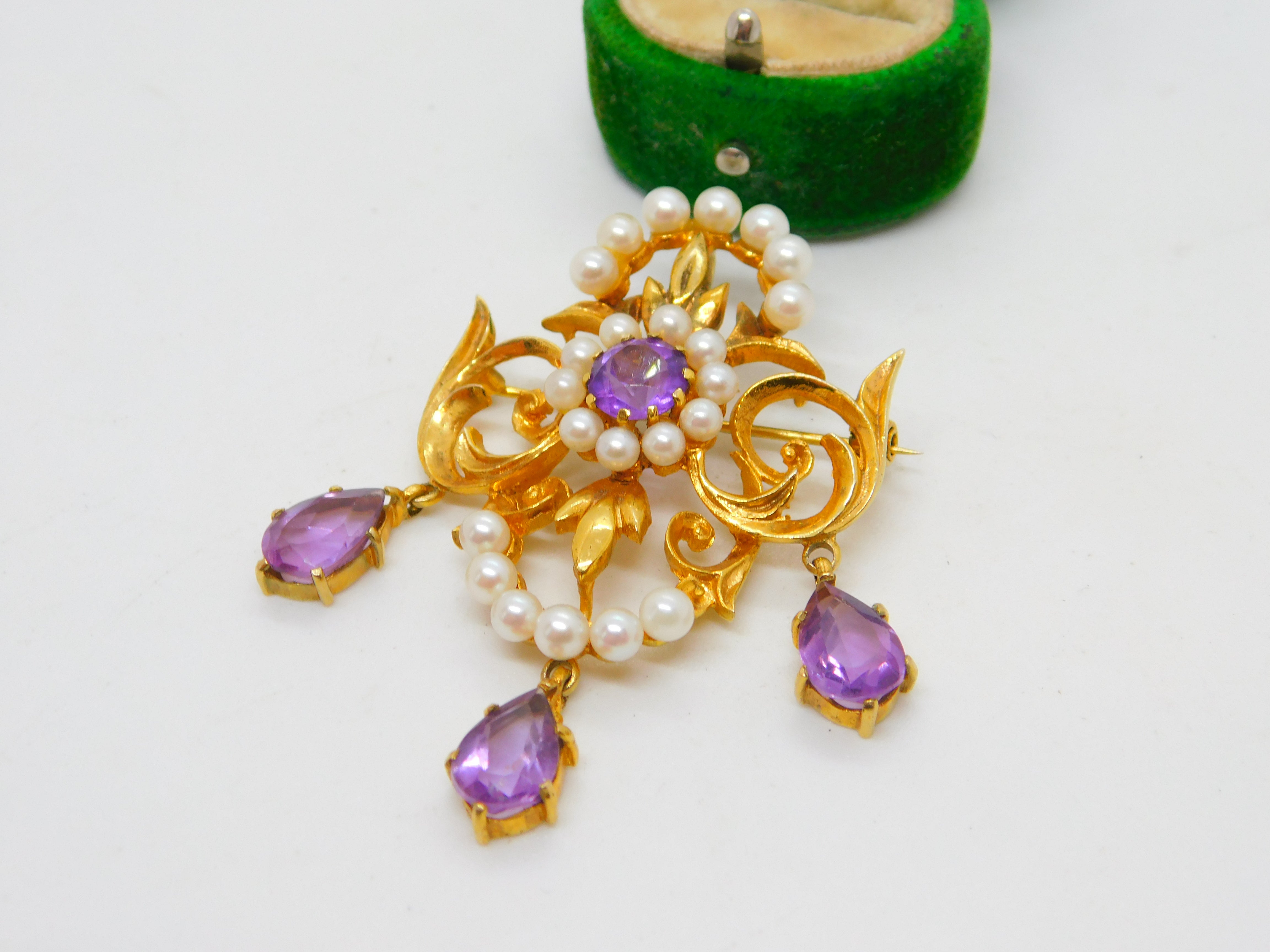 Details: A fantastic and wonderfully designed vintage large 9ct yellow gold lavalier victorian style drop pendant set throughout with amethysts and pearls hallmarked London 1971 to the reverse, the pendant could also be worn as a brooch and has a back pin. This is a wonderful item that would make a perfect gift or addition to any collection. The BOX pictured is for PRESENTATION ONLY and is NOT included in the listings but used to frame the pictures unless specifically stated otherwise.