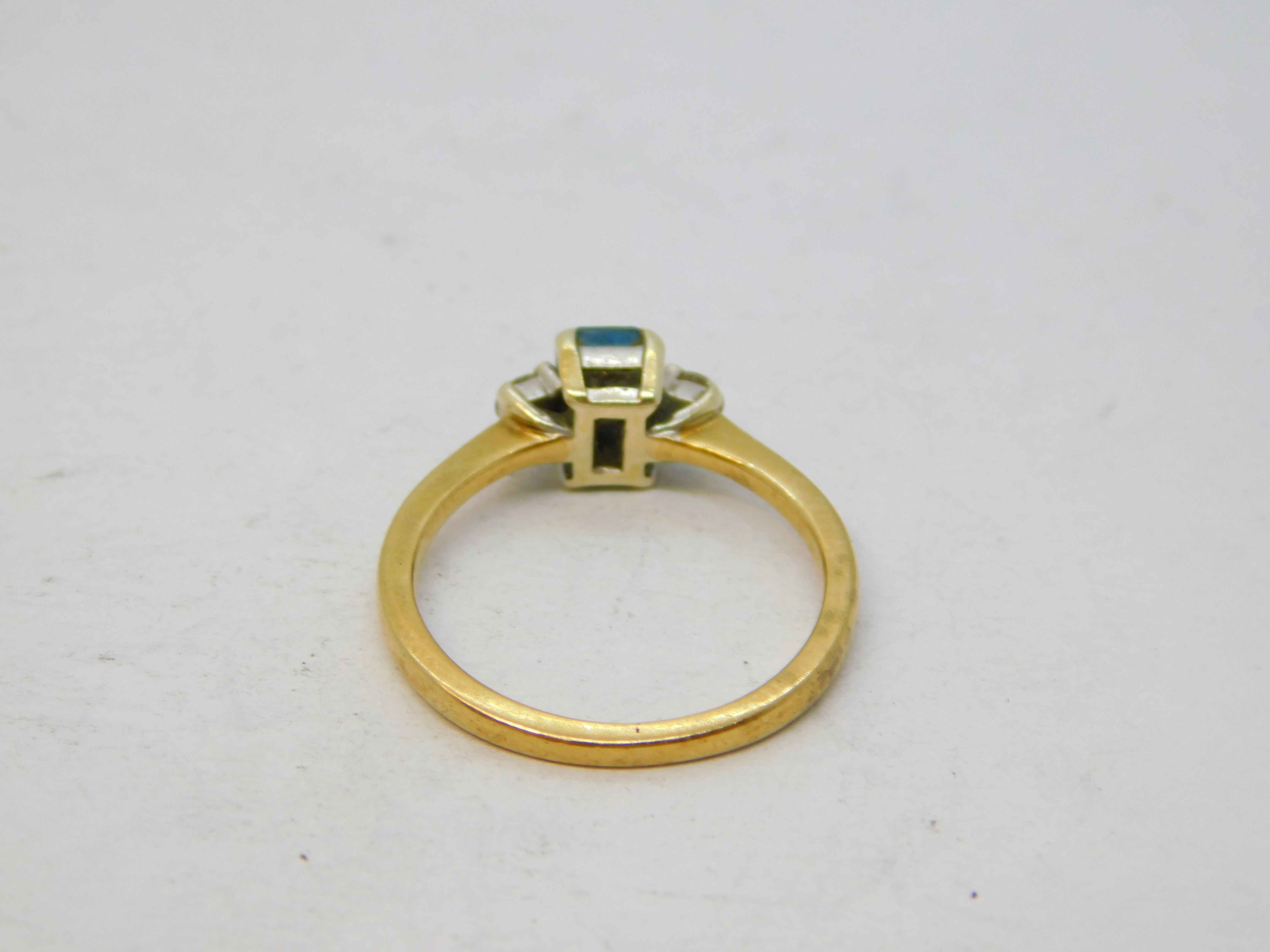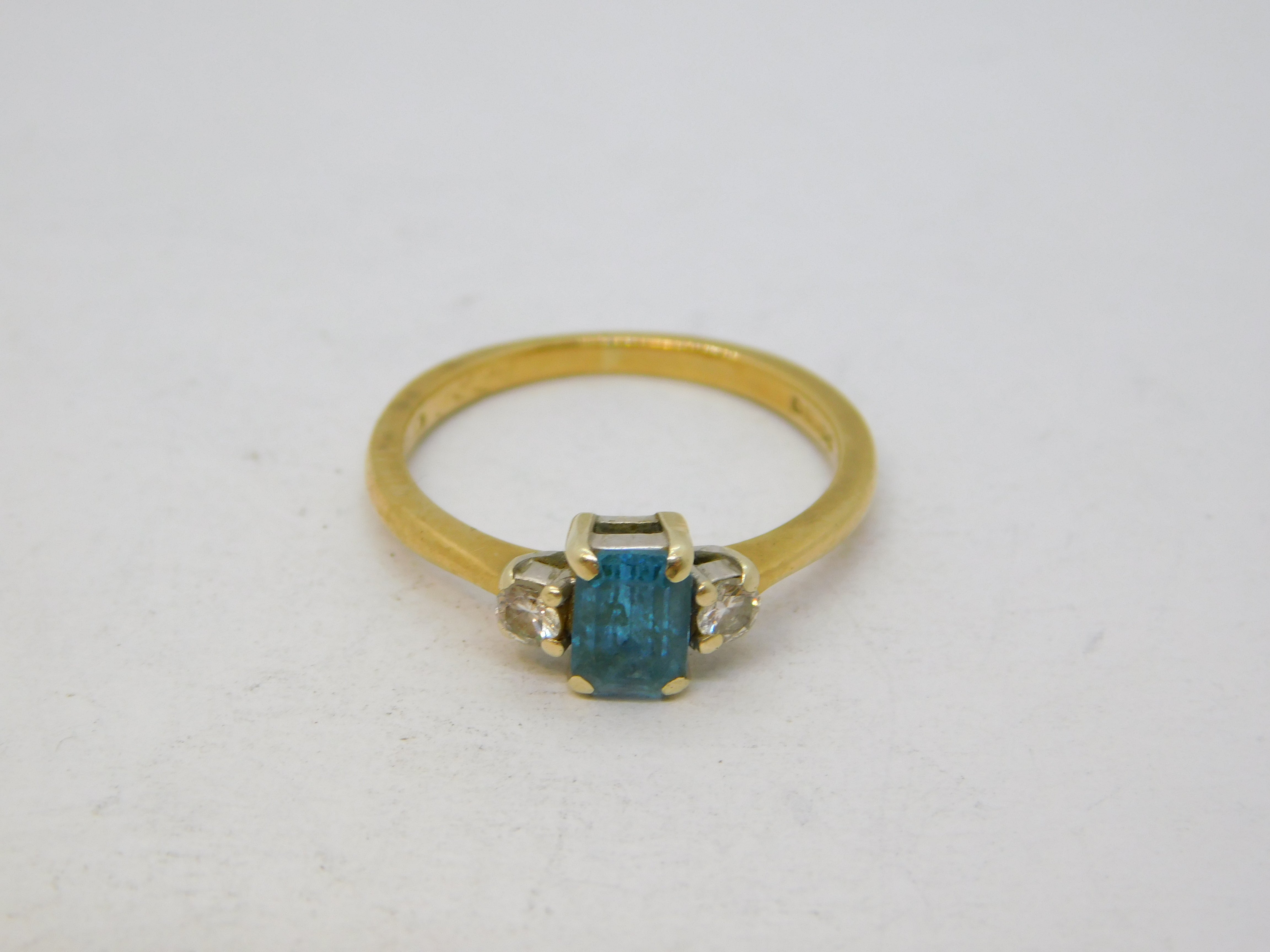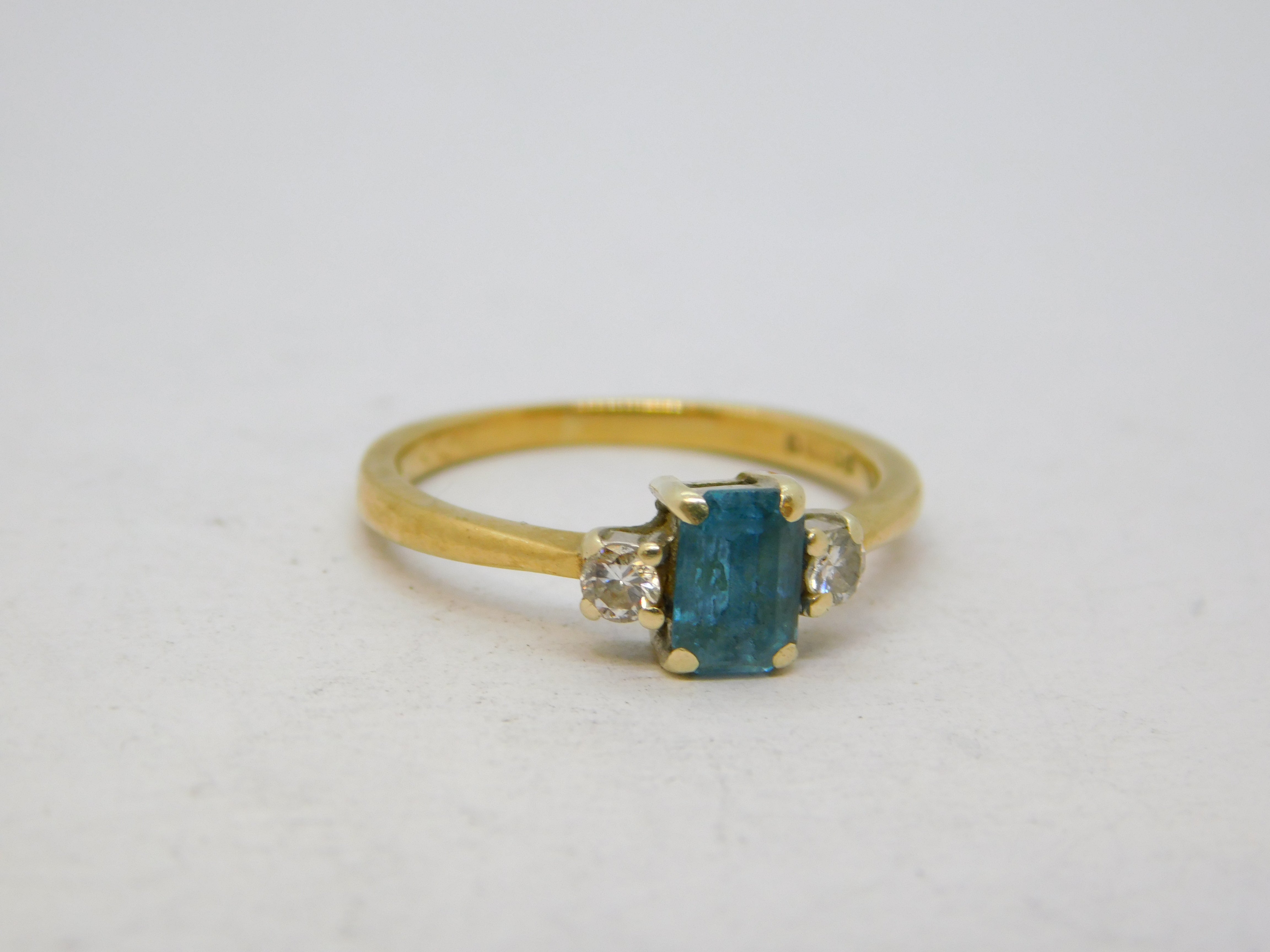 Details: A fantastic and wonderfully designed vintage 9ct yellow gold dress ring set with a central 0.5ct aquamarine flanked with two small diamonds hallmarked London 1990 to the reverse. This is a wonderful item that would make a perfect gift or addition to any collection.
