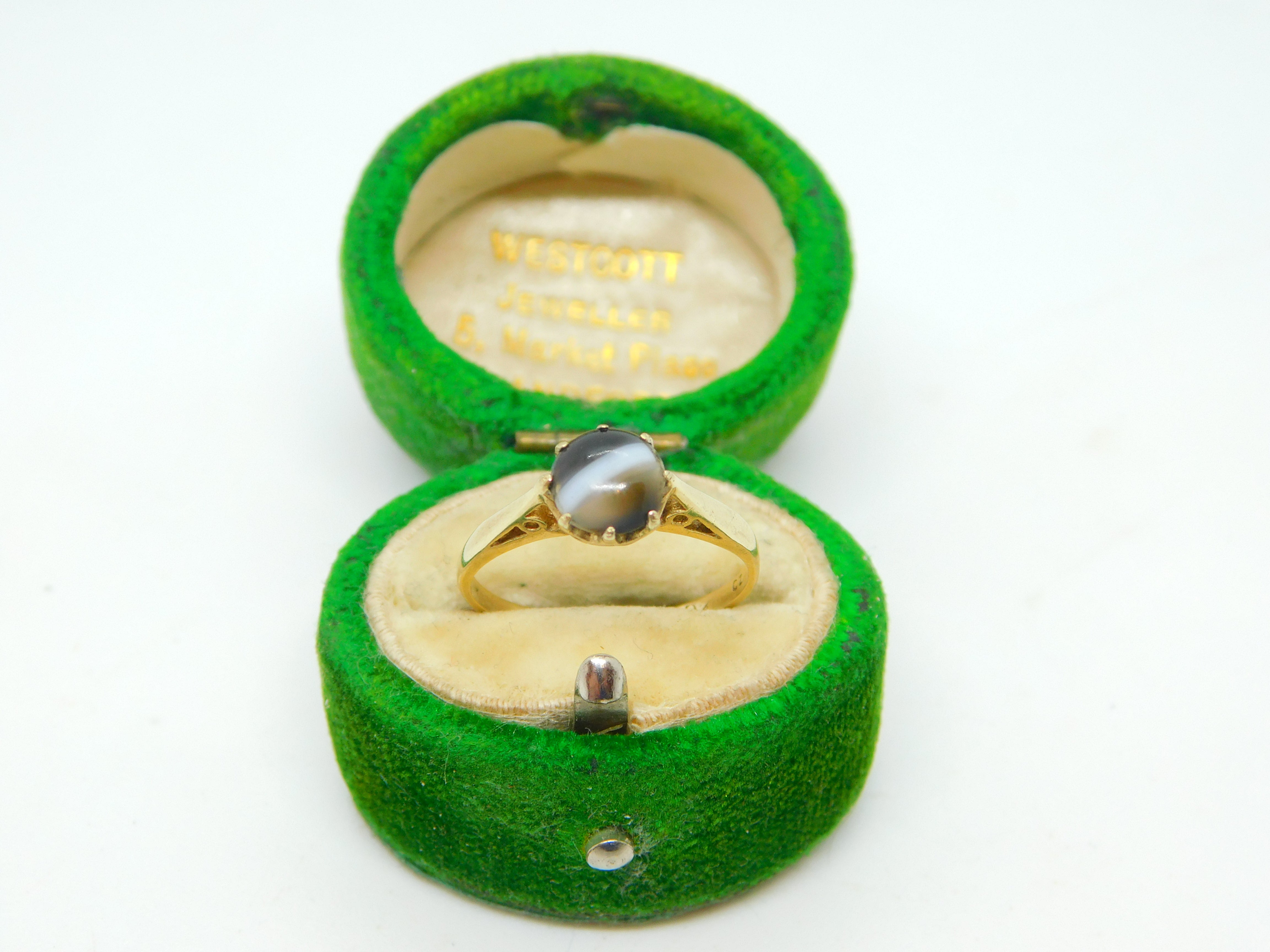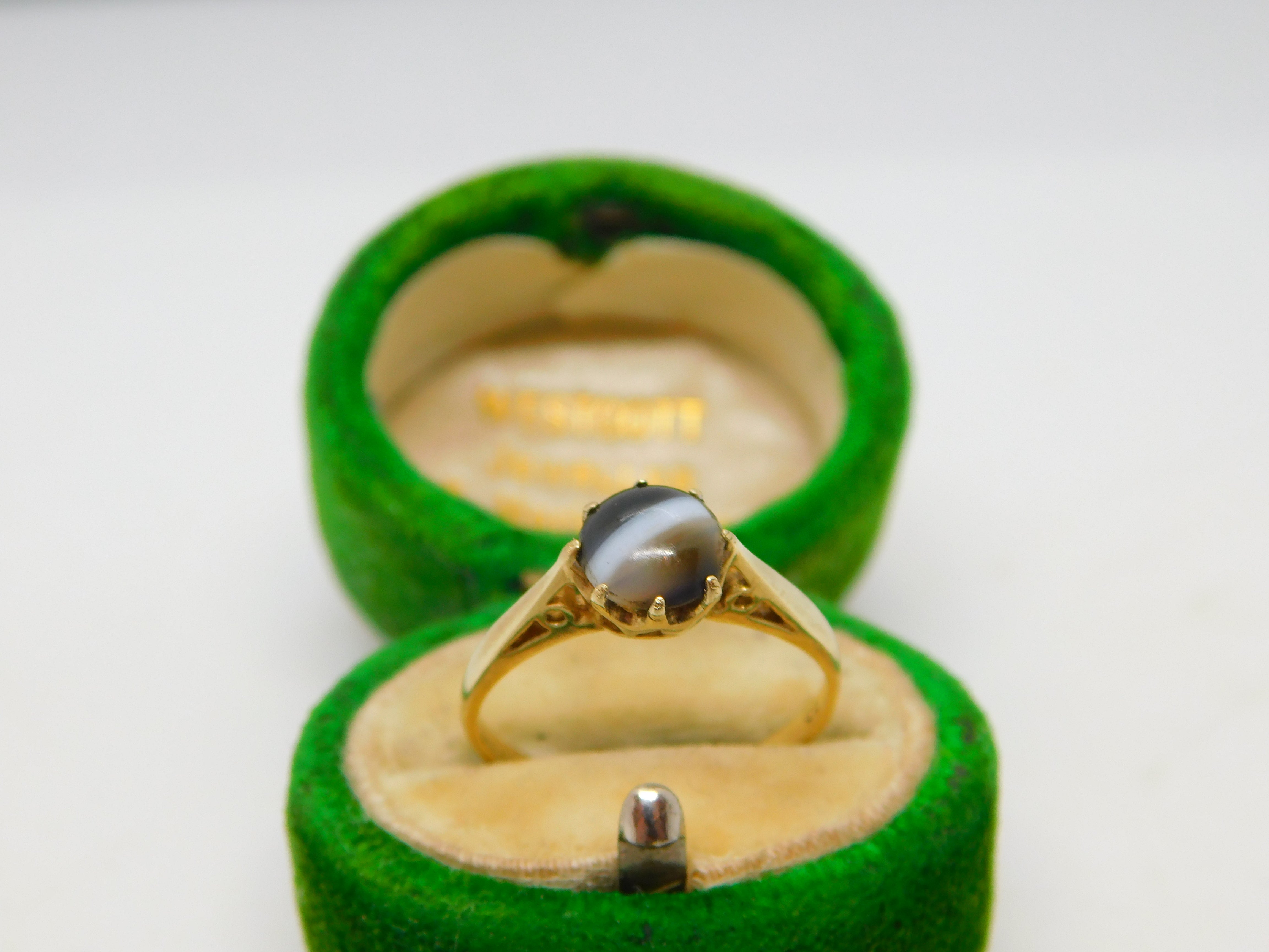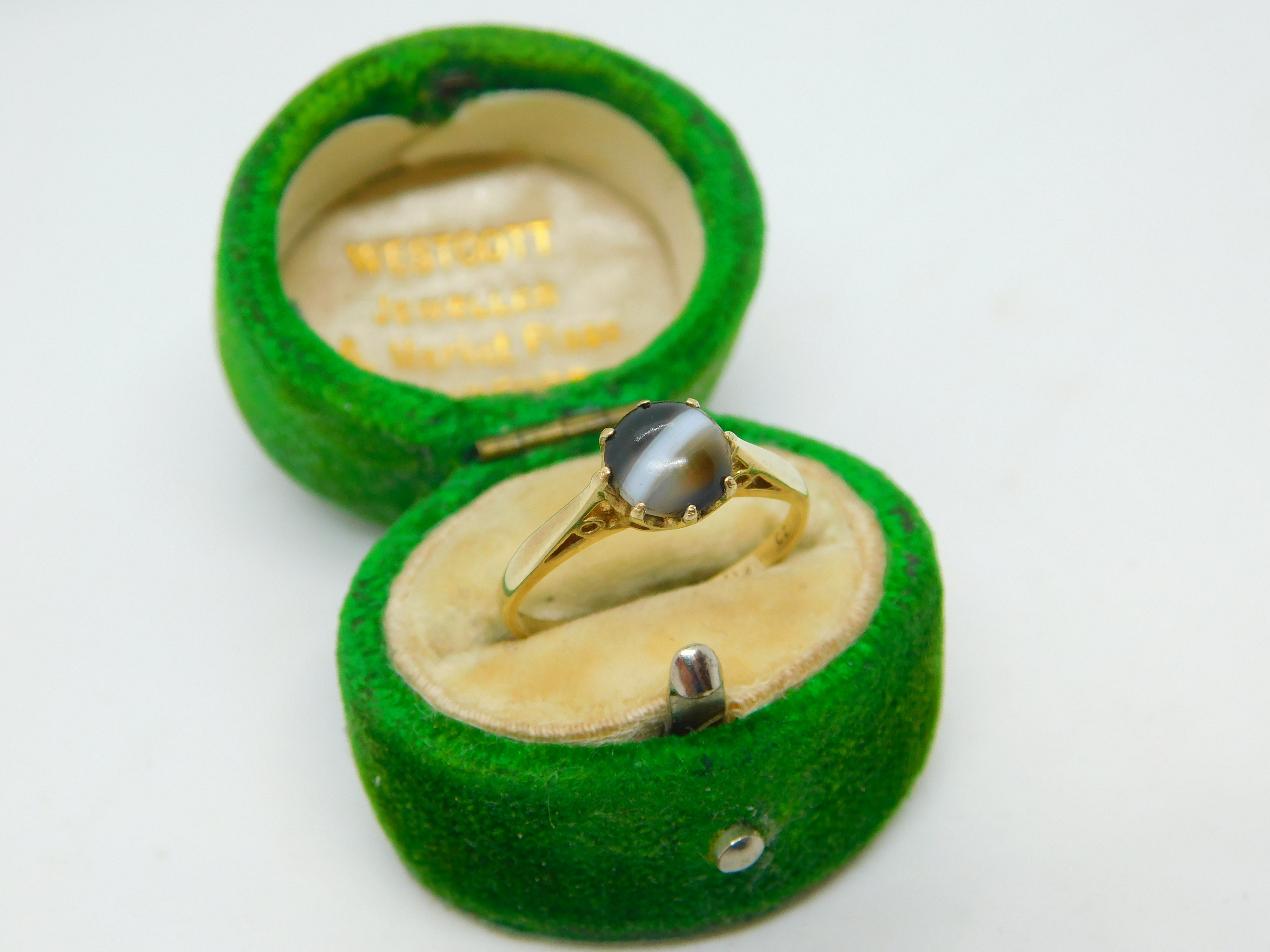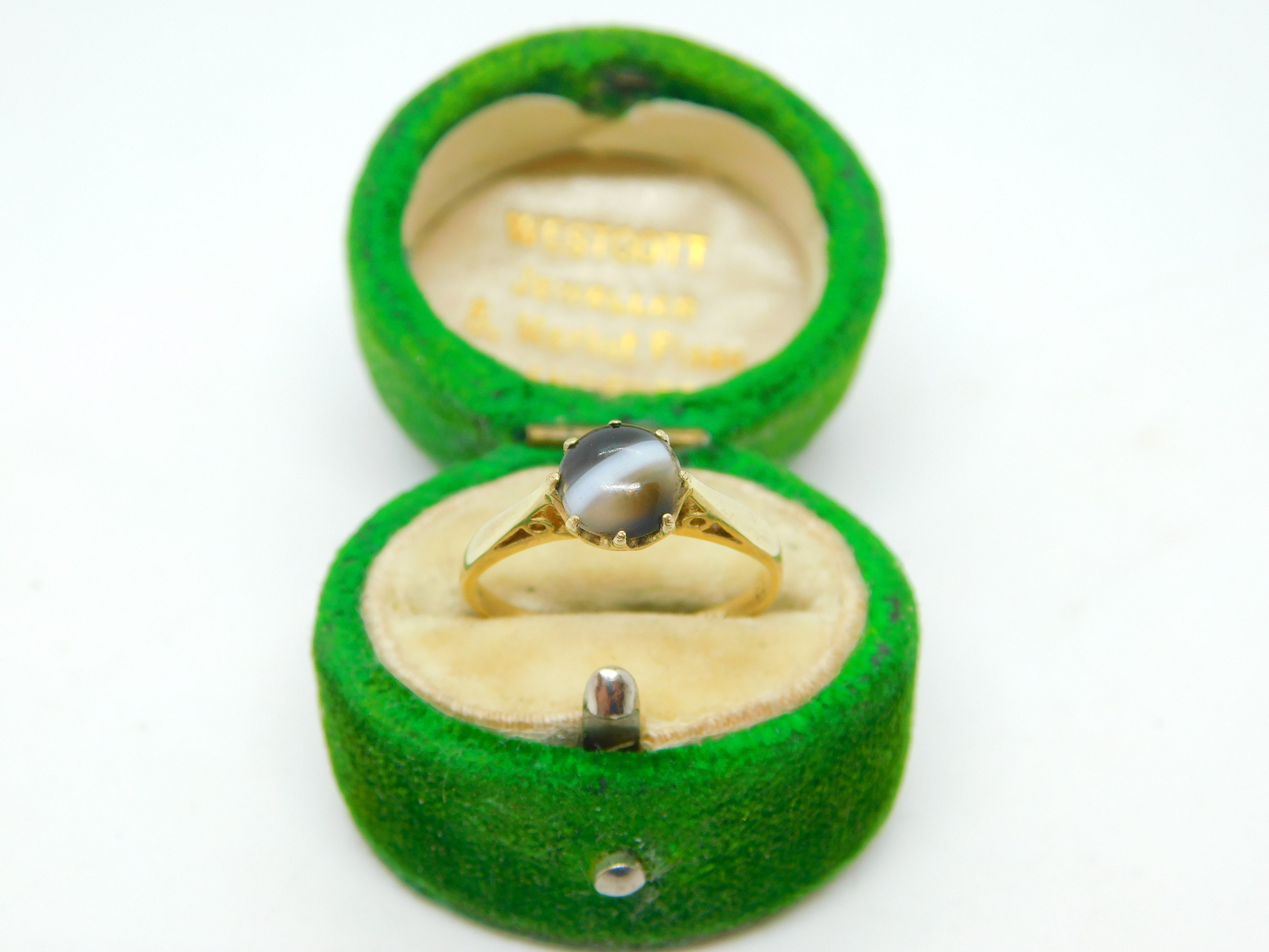 Details: A fantastic and wonderfully designed vintage 9ct yellow gold & cabochon banded agate dress ring hallmarked Birmingham 1983. This is a wonderful item that would make a perfect gift or addition to any collection. The BOX pictured is for PRESENTATION ONLY and is NOT included in the listings but used to frame the pictures unless specifically stated otherwise.