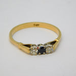 Details: A fantastic and wonderfully designed vintage 9ct yellow gold three-stone ring set with brilliant cut diamonds & central sapphire hallmarked '9ct' to the interior band c1970. This is a wonderful item that would make a perfect gift or addition to any collection.