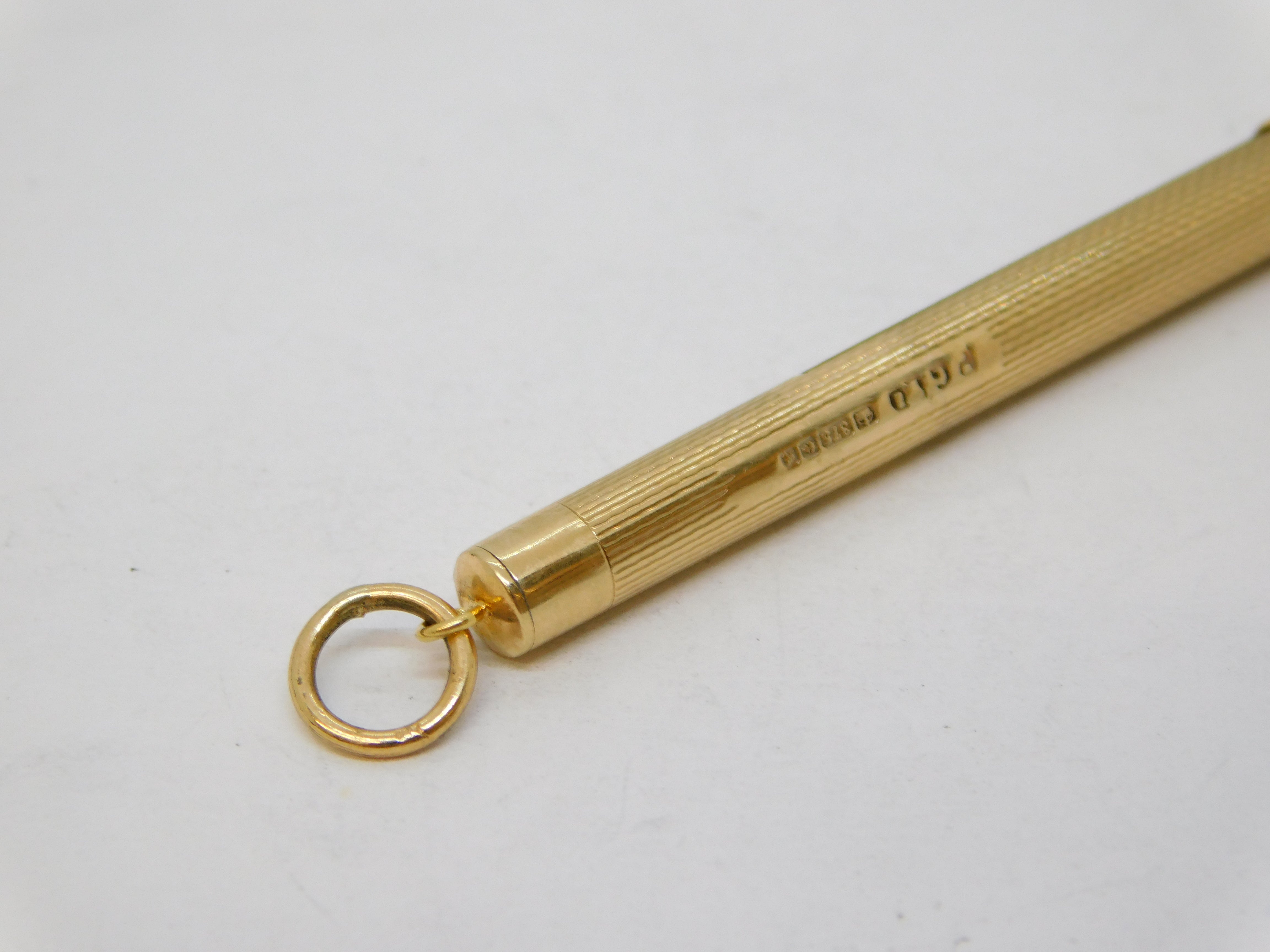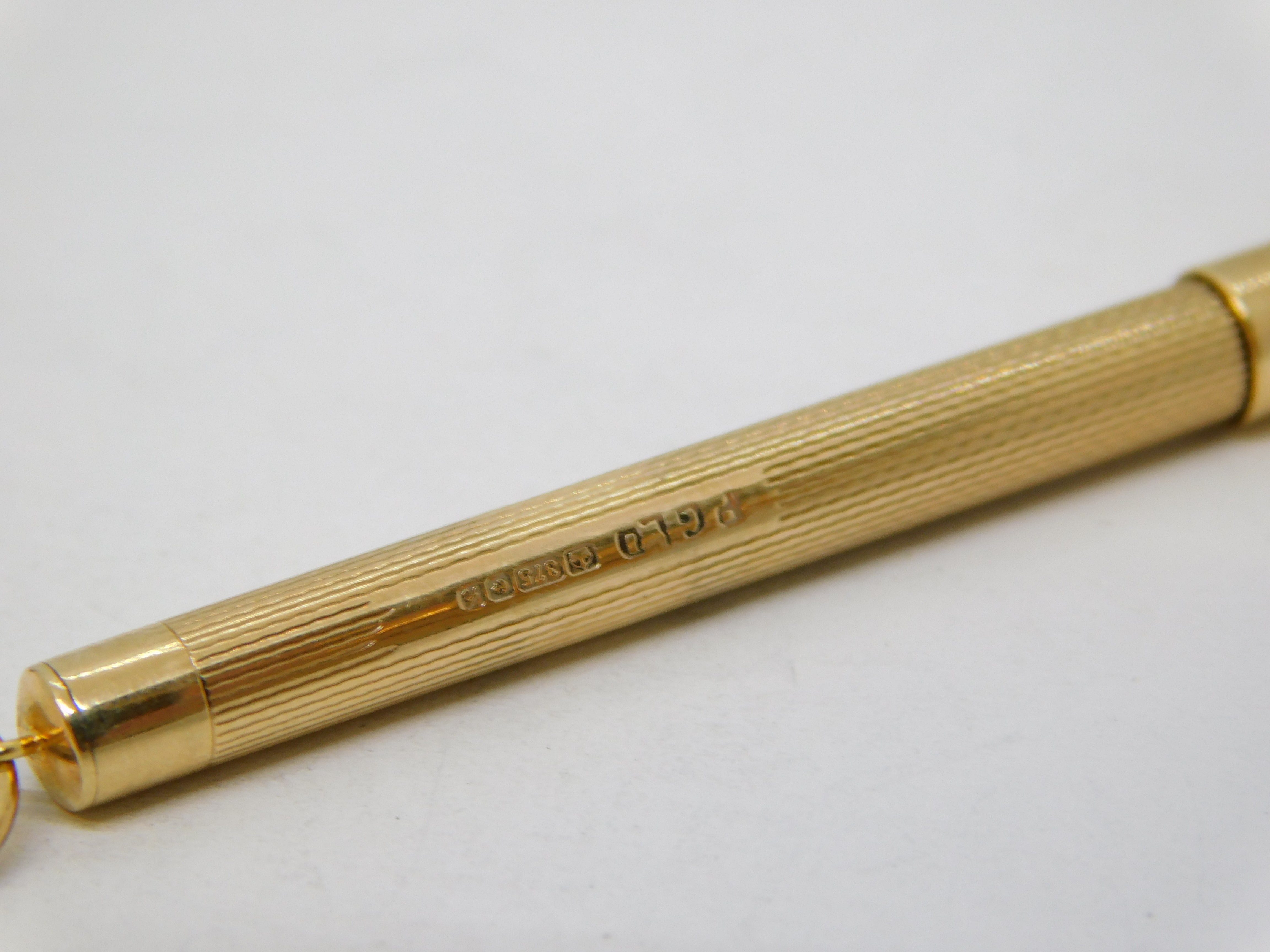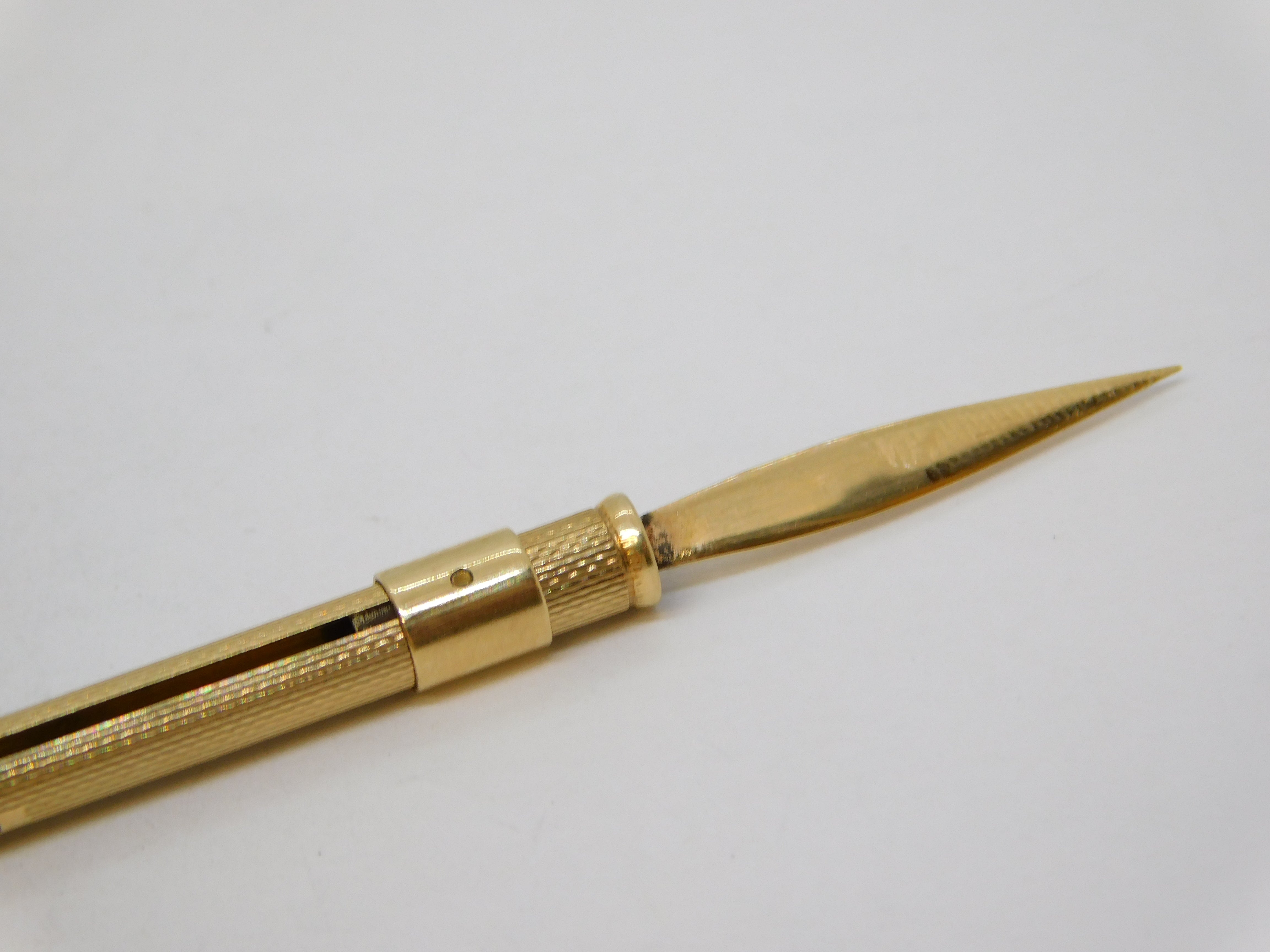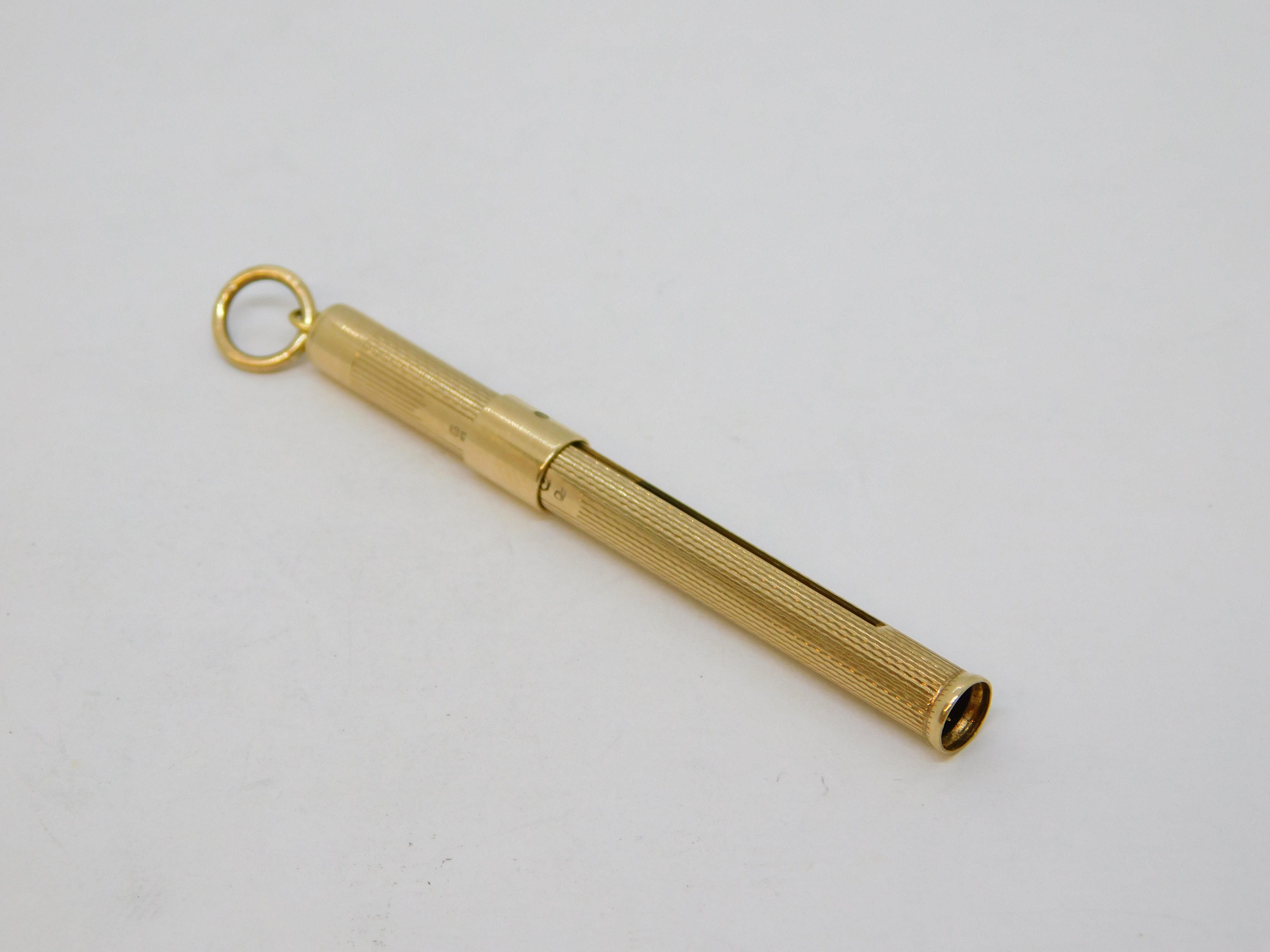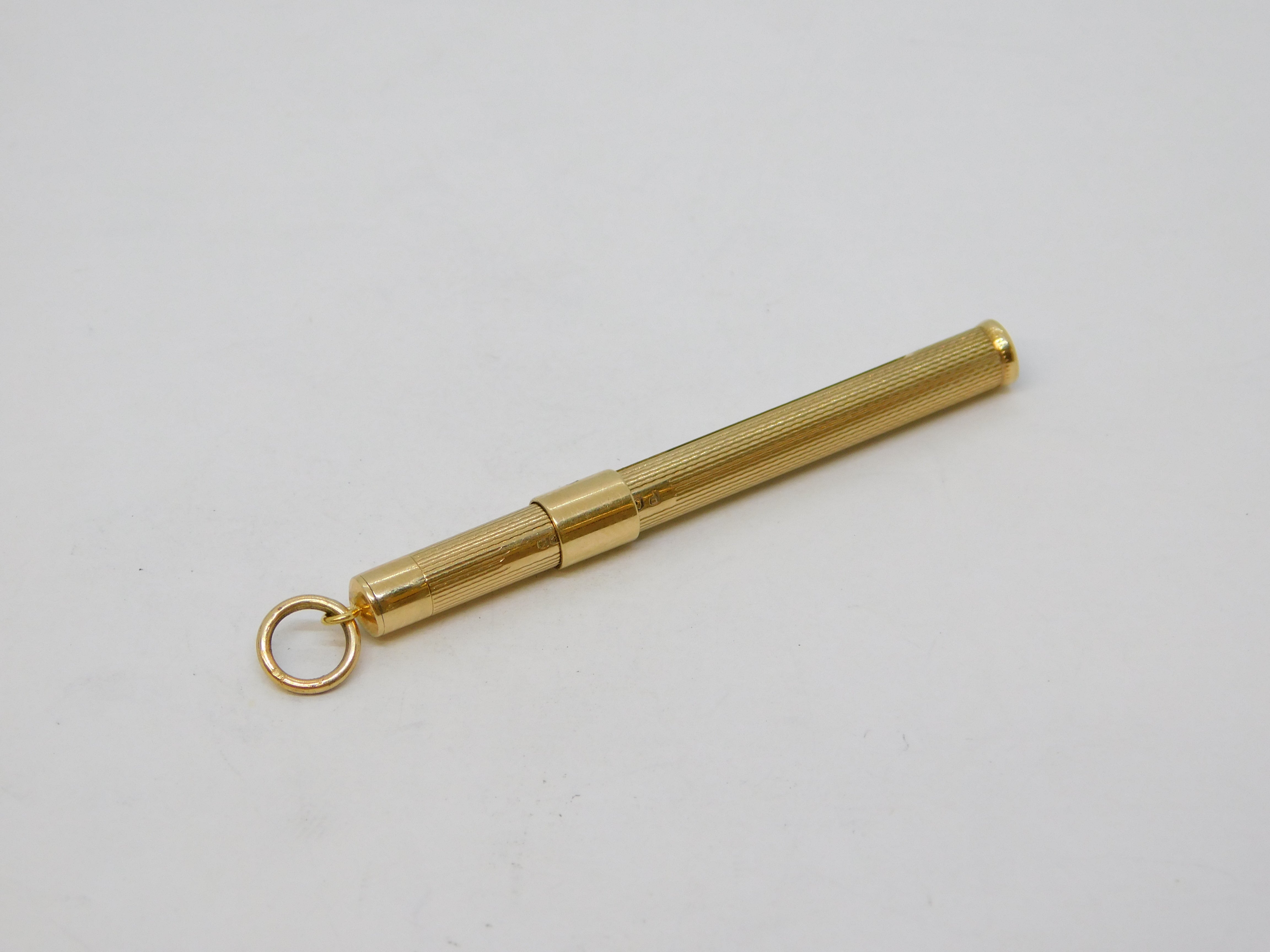 Details: A fantastic and wonderfully designed vintage 9ct yellow gold engine turned propelling toothpick with lovely detailing hallmarked Birmingham 1975. This is a wonderful item that would make a perfect gift or addition to any collection.