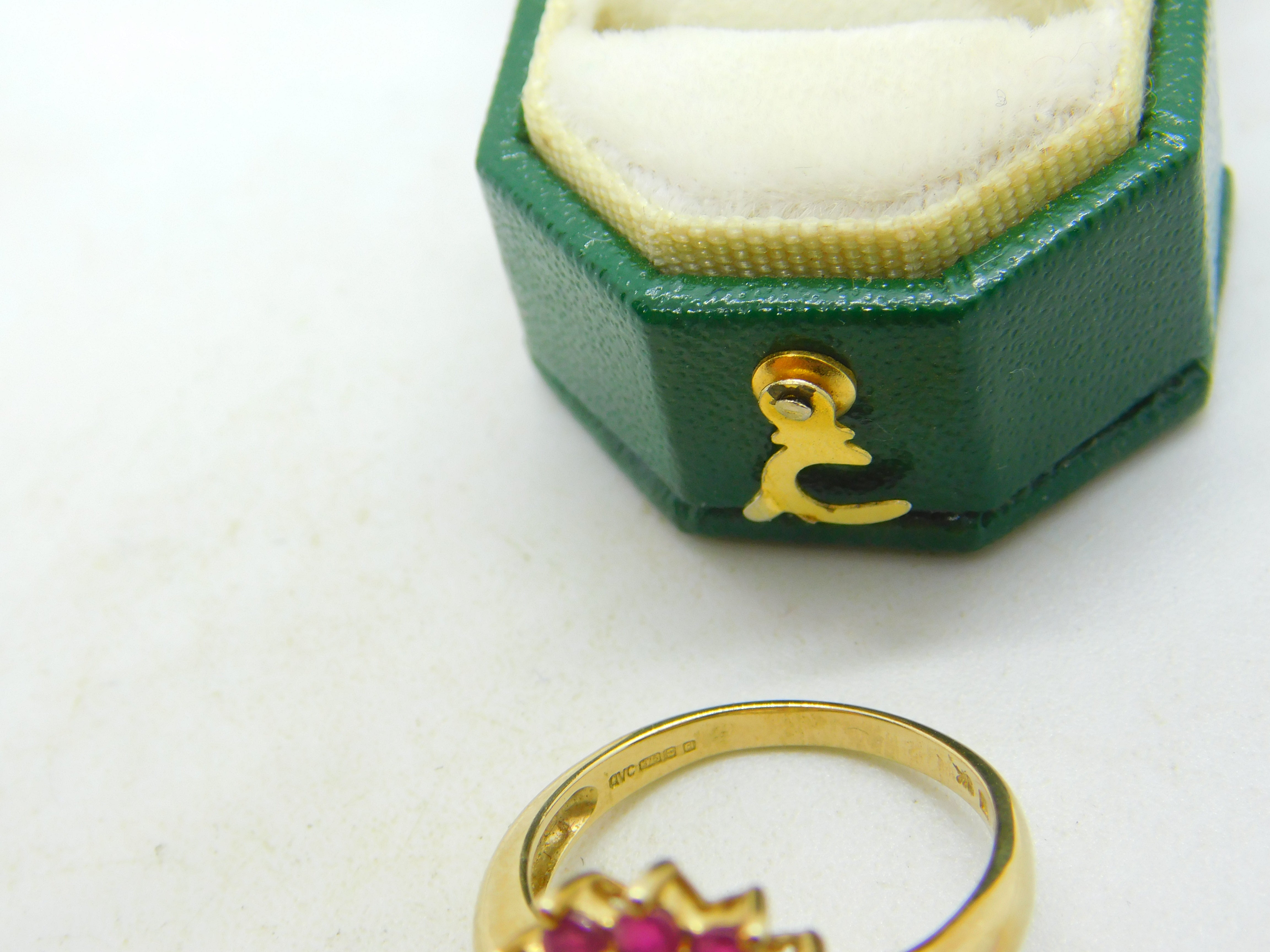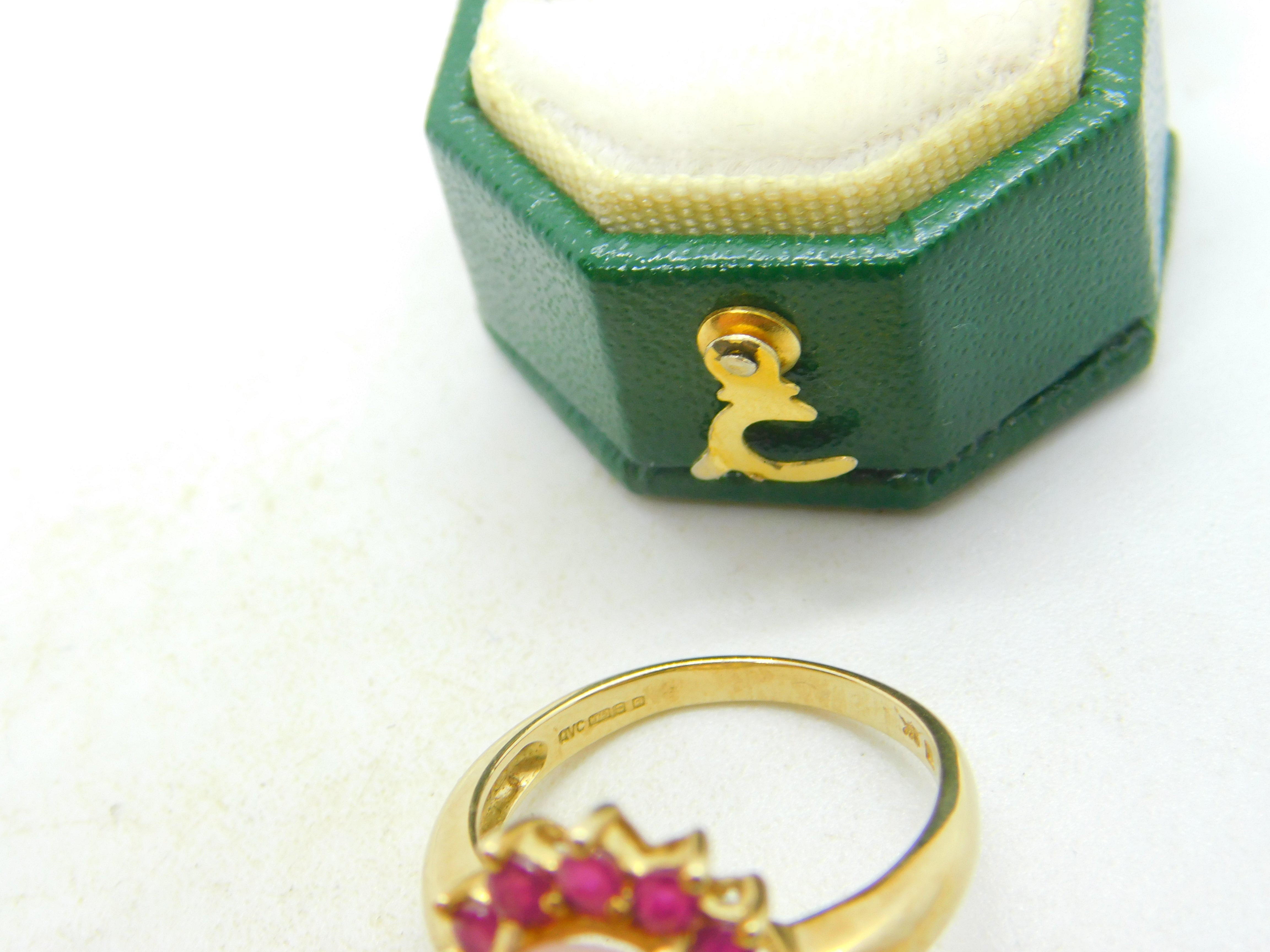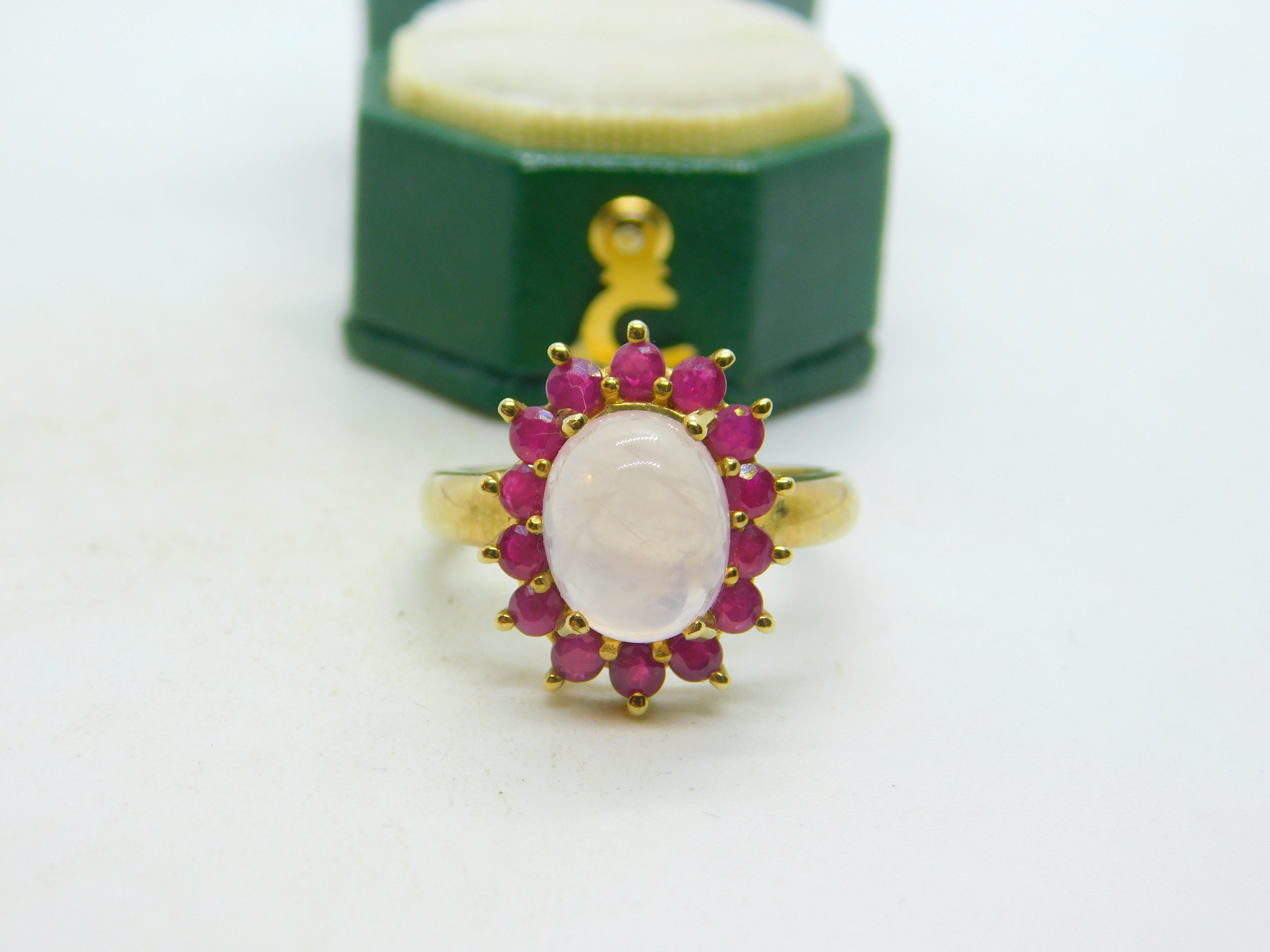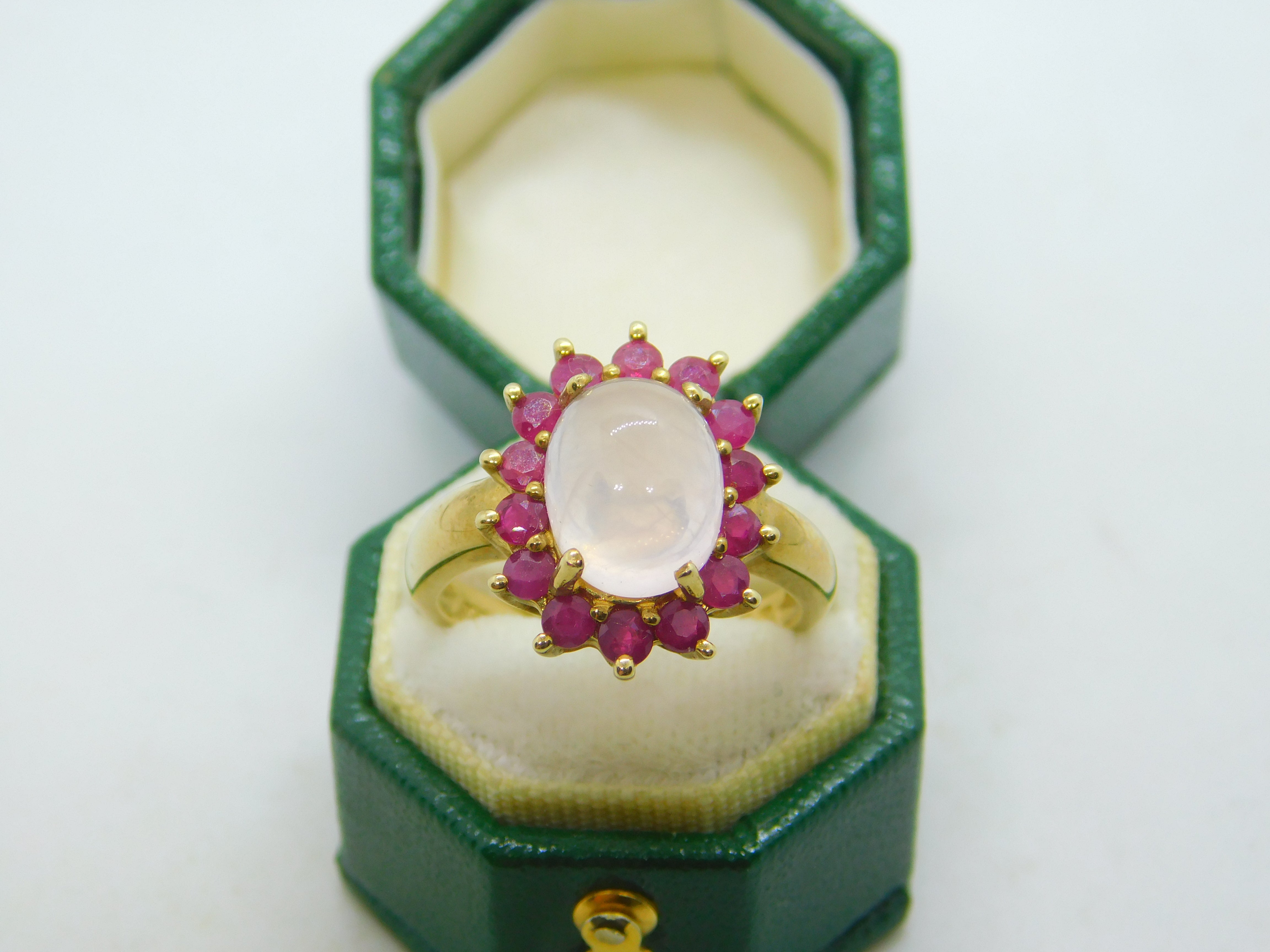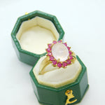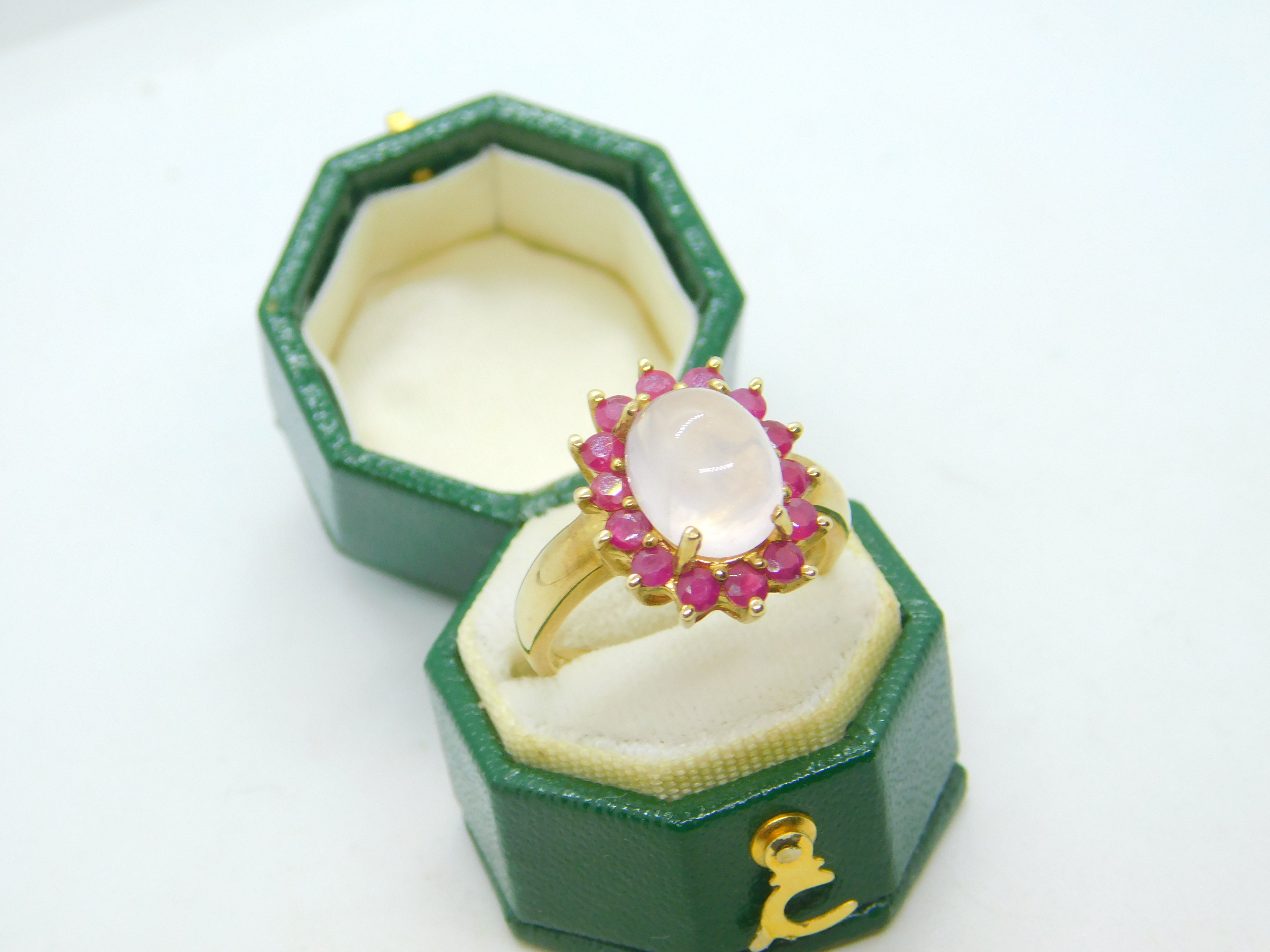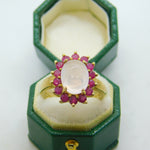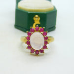 9ct Yellow Gold, Ruby & Cabochon Rose Quartz Cluster Ring Vintage c1990