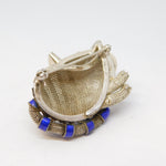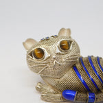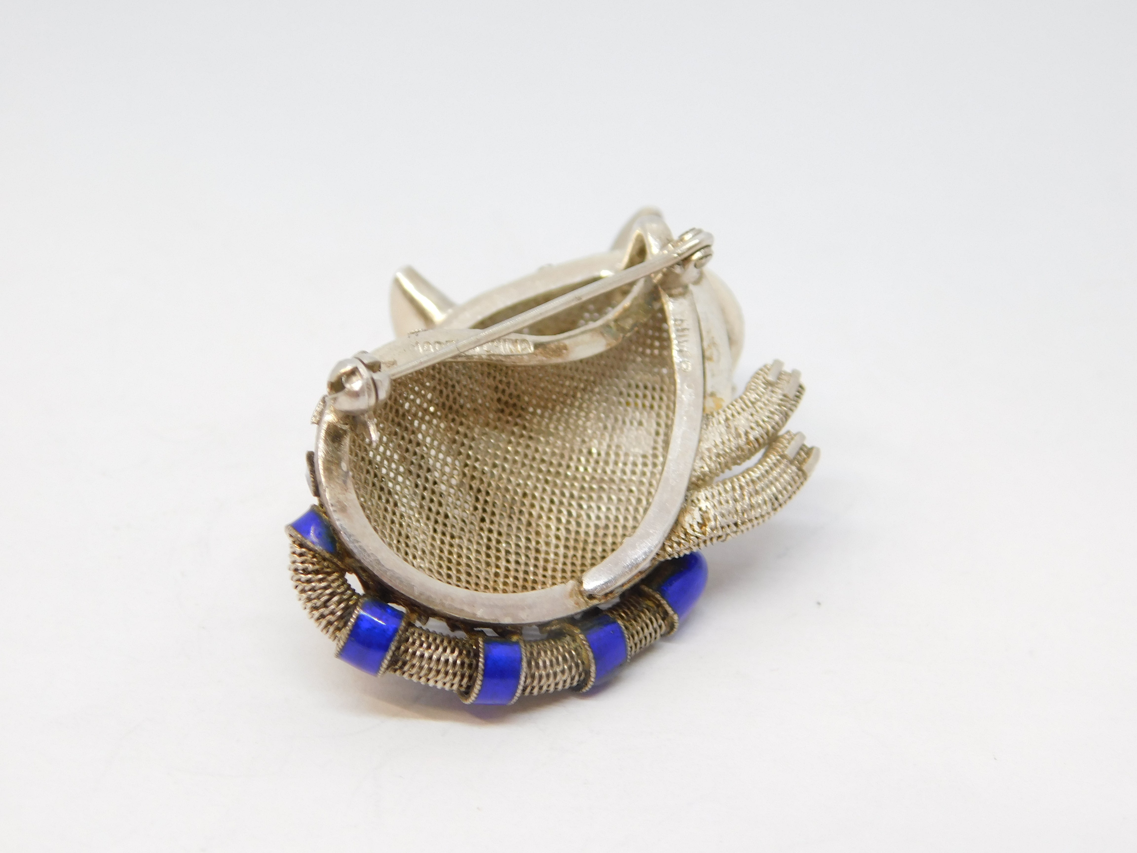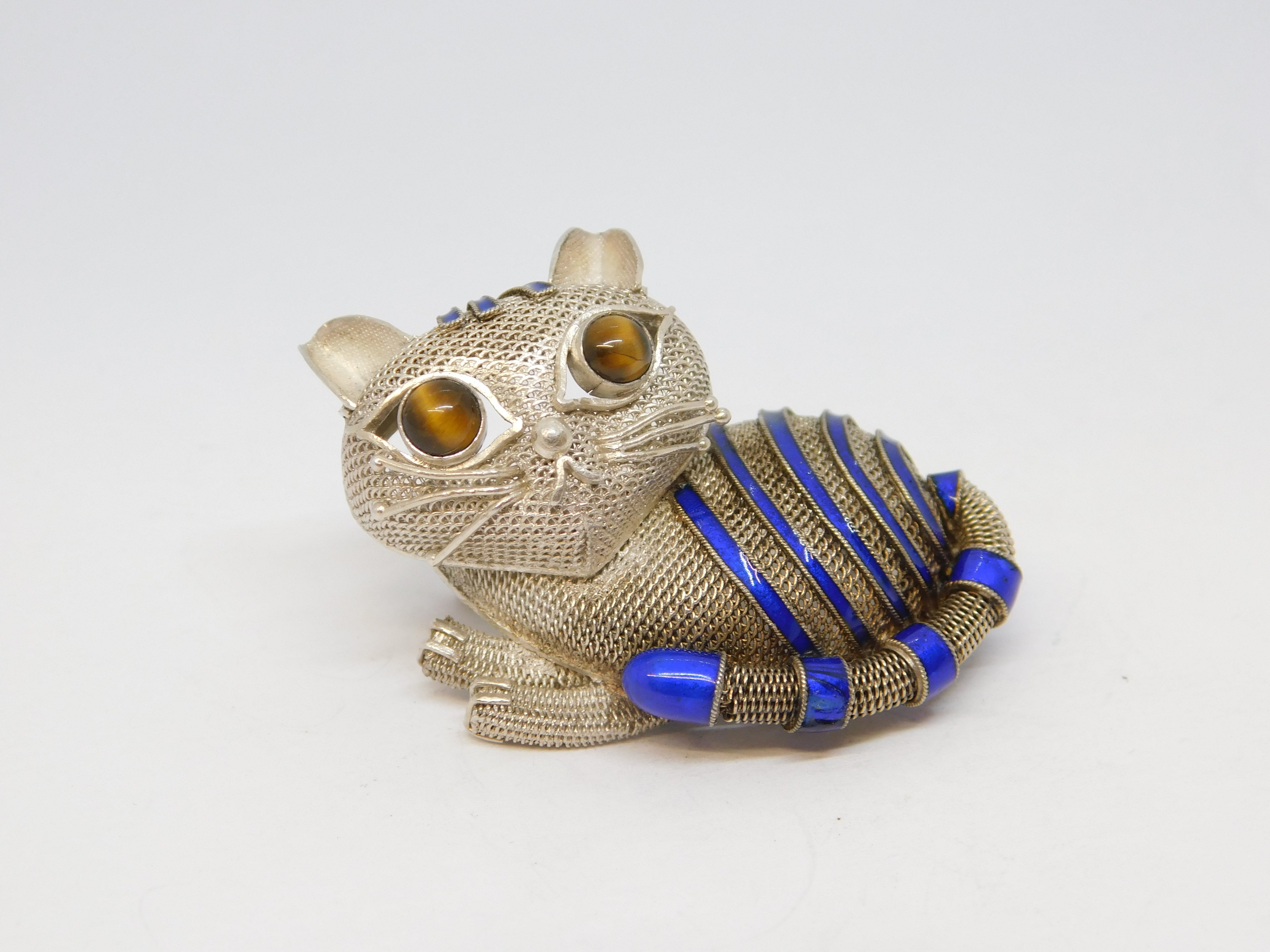 Chinese Sterling Silver, Blue Enamel & Tiger's Eye Cat Brooch Vintage c1960