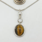 Details: A fantastic and wonderfully designed vintage German sterling silver modernist jewellery suite to include a wonderful chunky silver brooch alongside a gorgeous drop pendant necklace both set with large tiger's eye cabochons, both hallmarked Grosse 1973 to the reverse. This is a wonderful item that would make a perfect gift or addition to any collection. We are more than happy to provide XRF reports for items upon request.