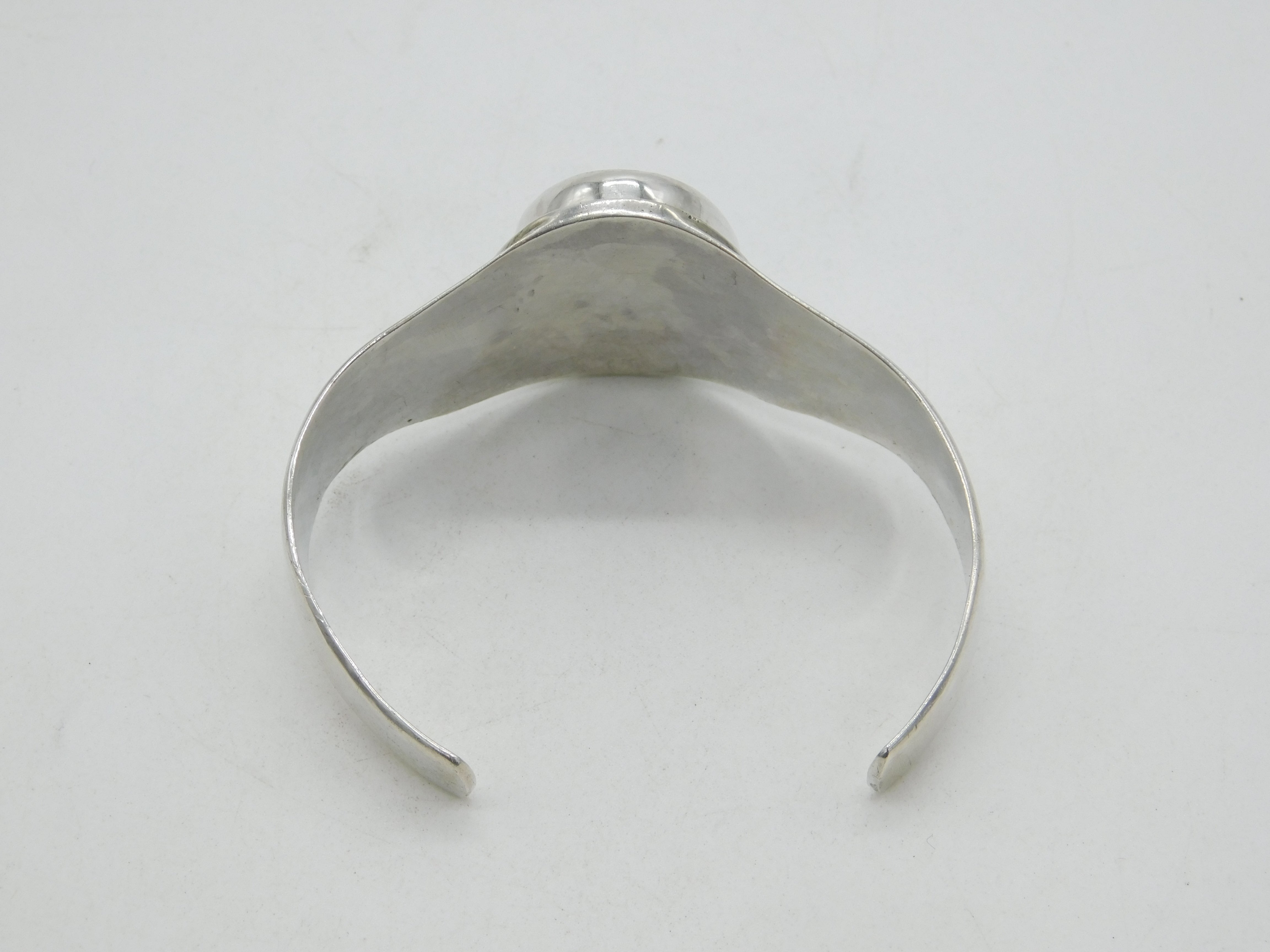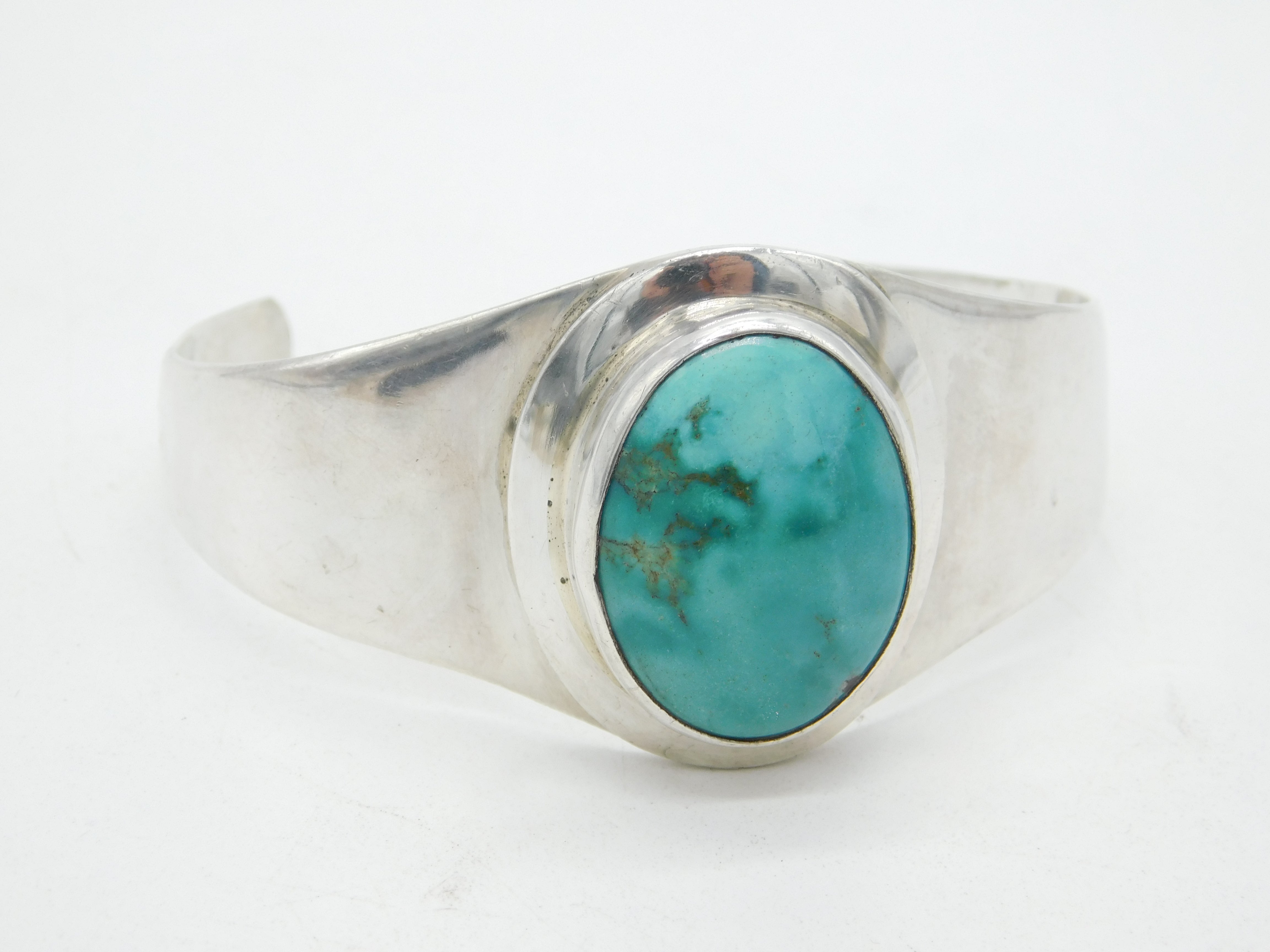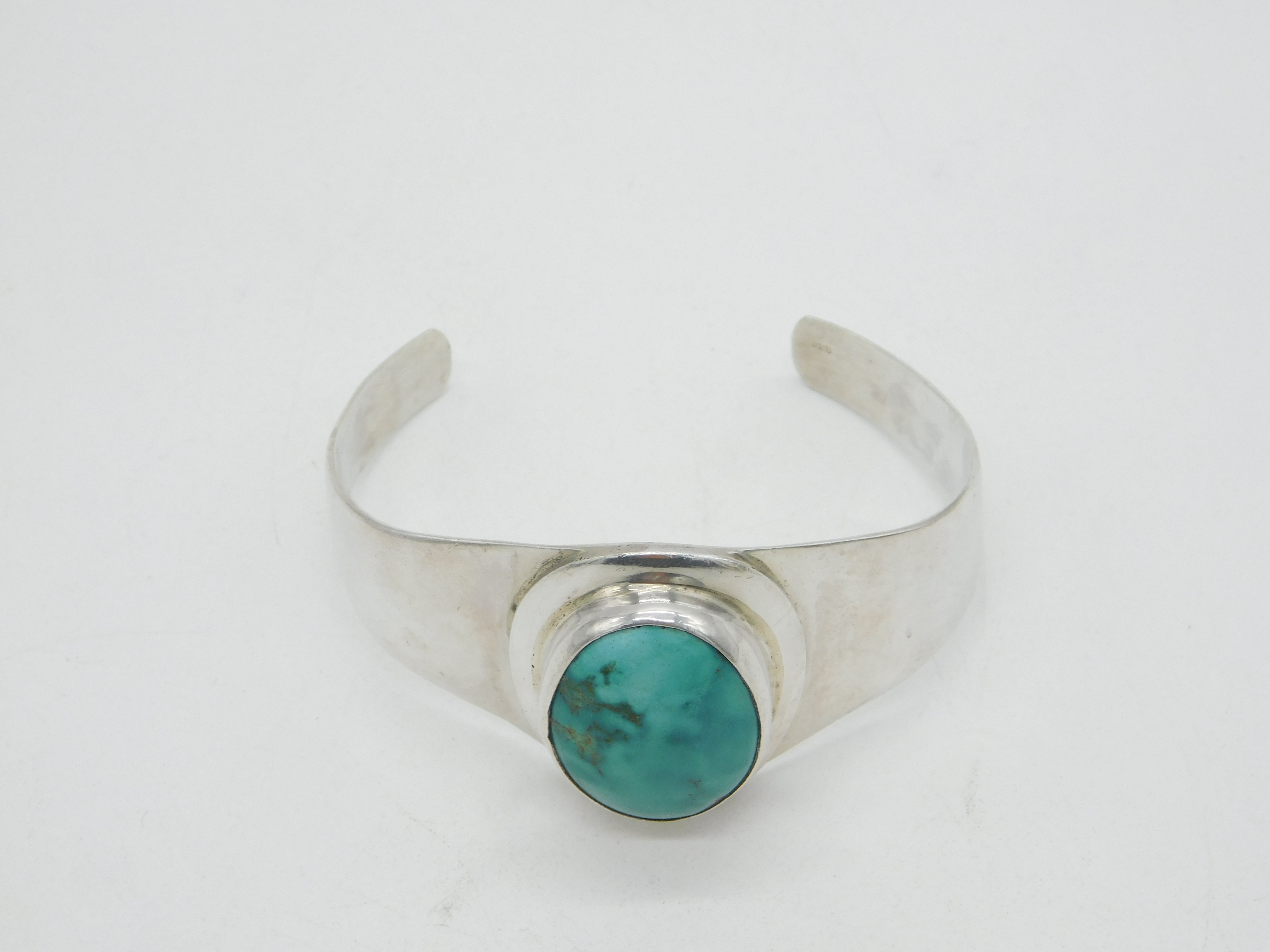Details: A fantastic and wonderfully designed vintage Mexican studio jewellery sterling silver cuff bangle bracelet set with highly polished turquoise cabochon marked 925 to the edge c1970. This is a wonderful item that would make a perfect gift or addition to any collection. The BOX pictured is for PRESENTATION ONLY and is NOT included in the listings but used to frame the pictures unless specifically stated otherwise.