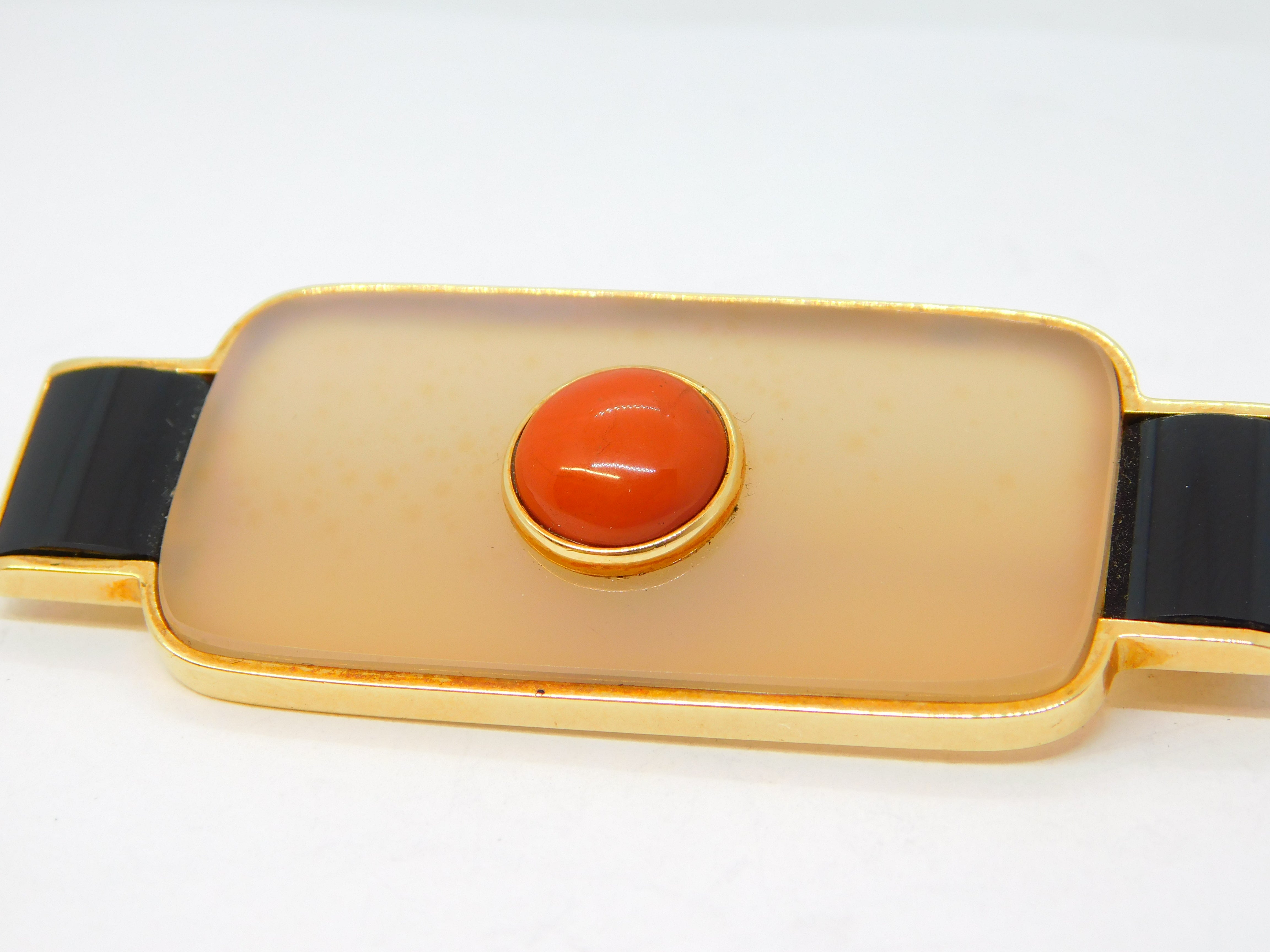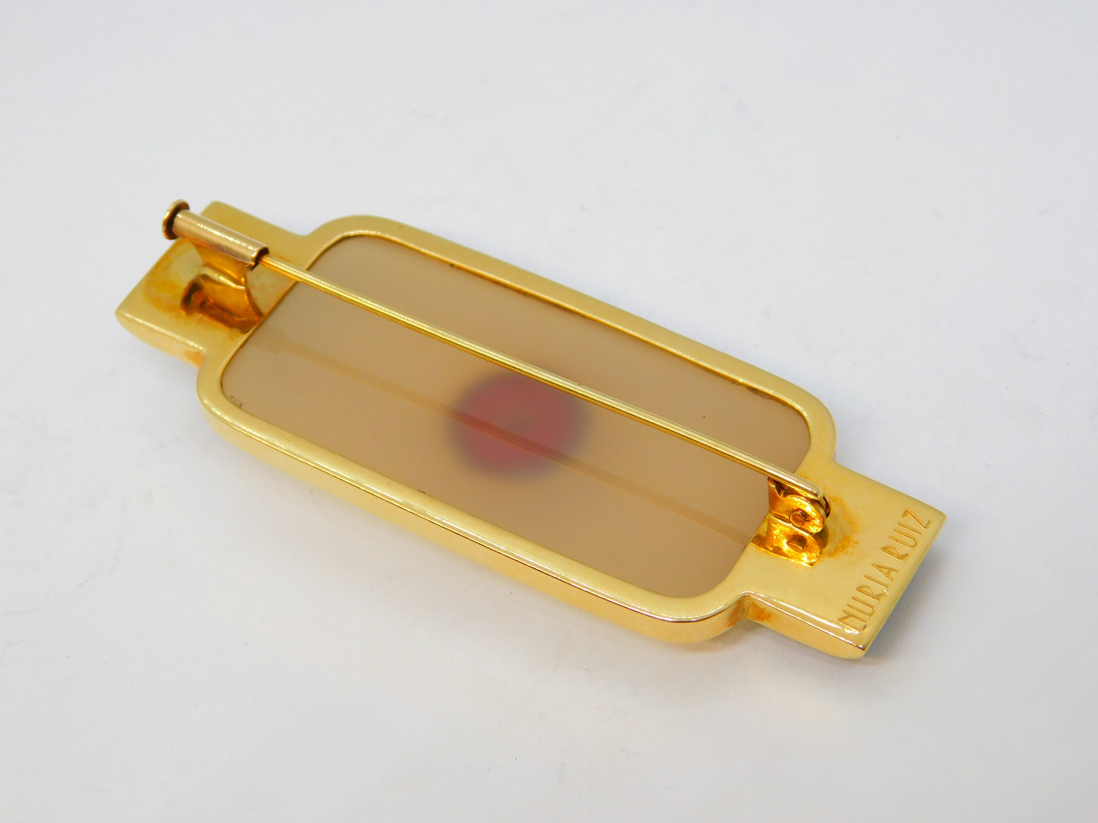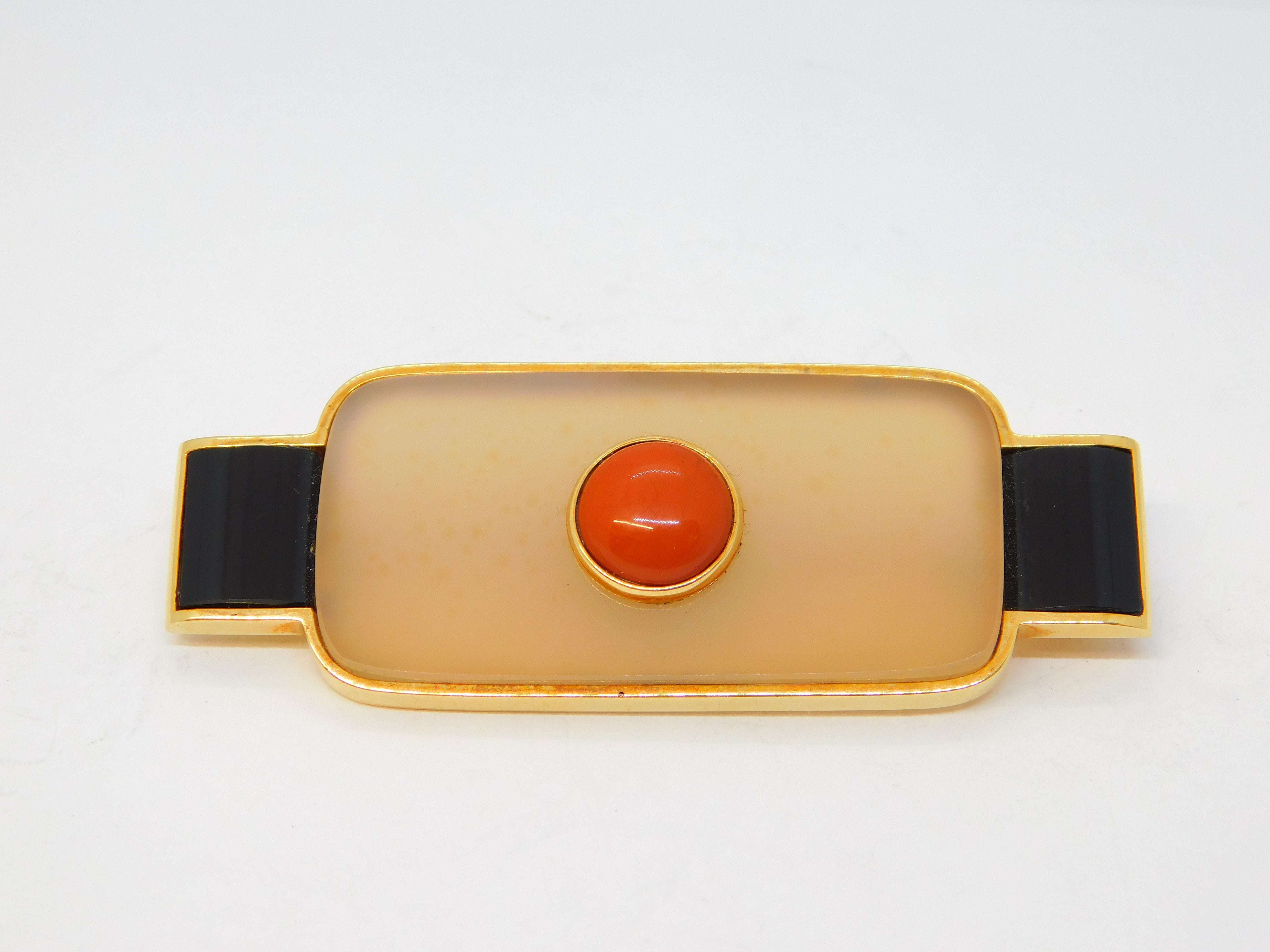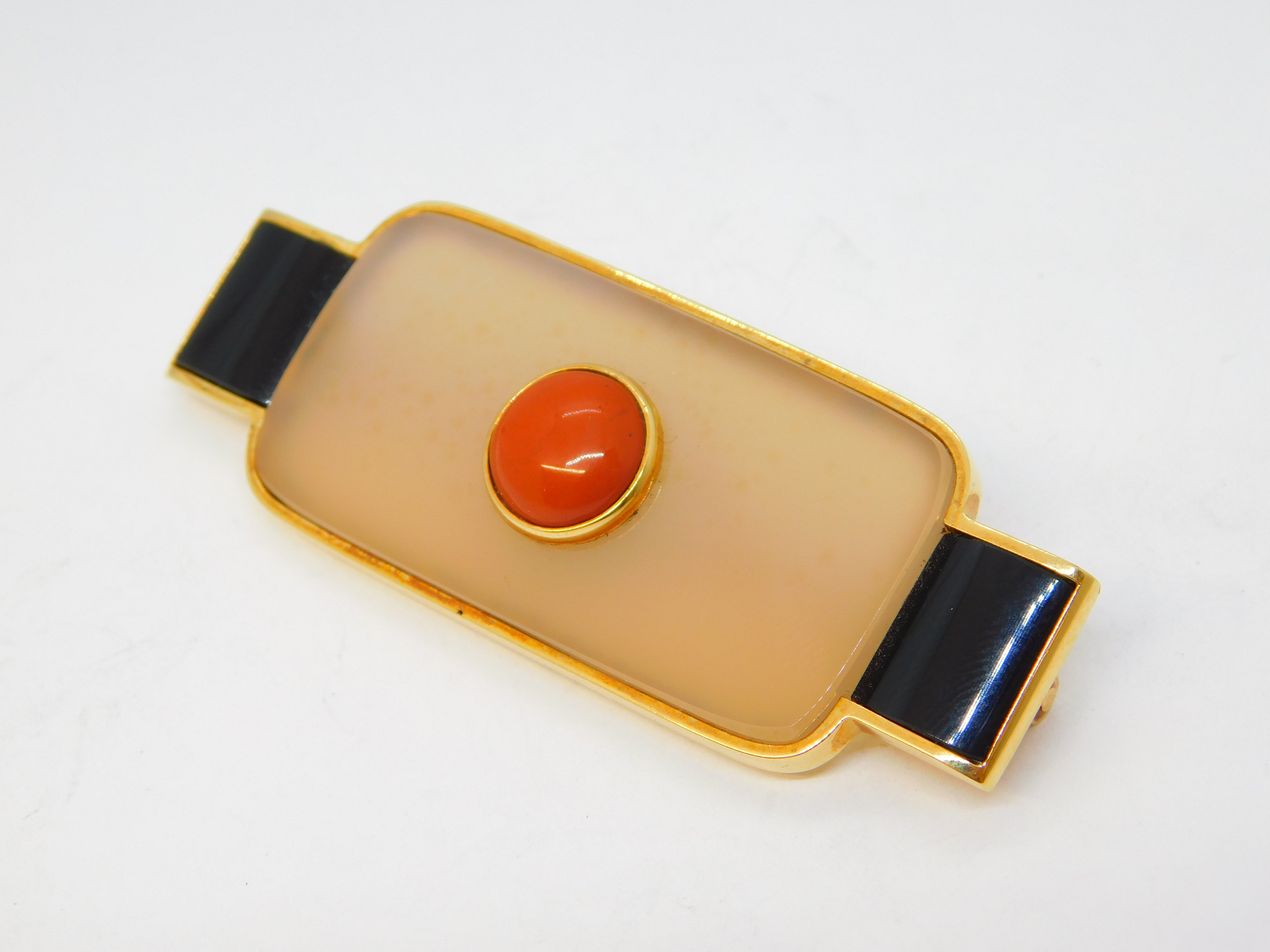 Details: A fantastic and wonderfully designed vintage Spanish designer 18ct yellow gold mounted art deco style modernist brooch with two sections of onyx flanking a central agate panel set with gold mounted red jasper to the centre. The gold has been XRF tested as it is unmarked, marked 'Nuria Ruiz' to the edge. Likely a commissioned piece, superior quality and in excellent condition. This is a wonderful item that would make a perfect gift or addition to any collection. We are more than happy to provide XRF reports for items upon request.