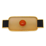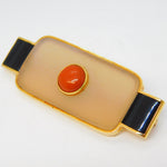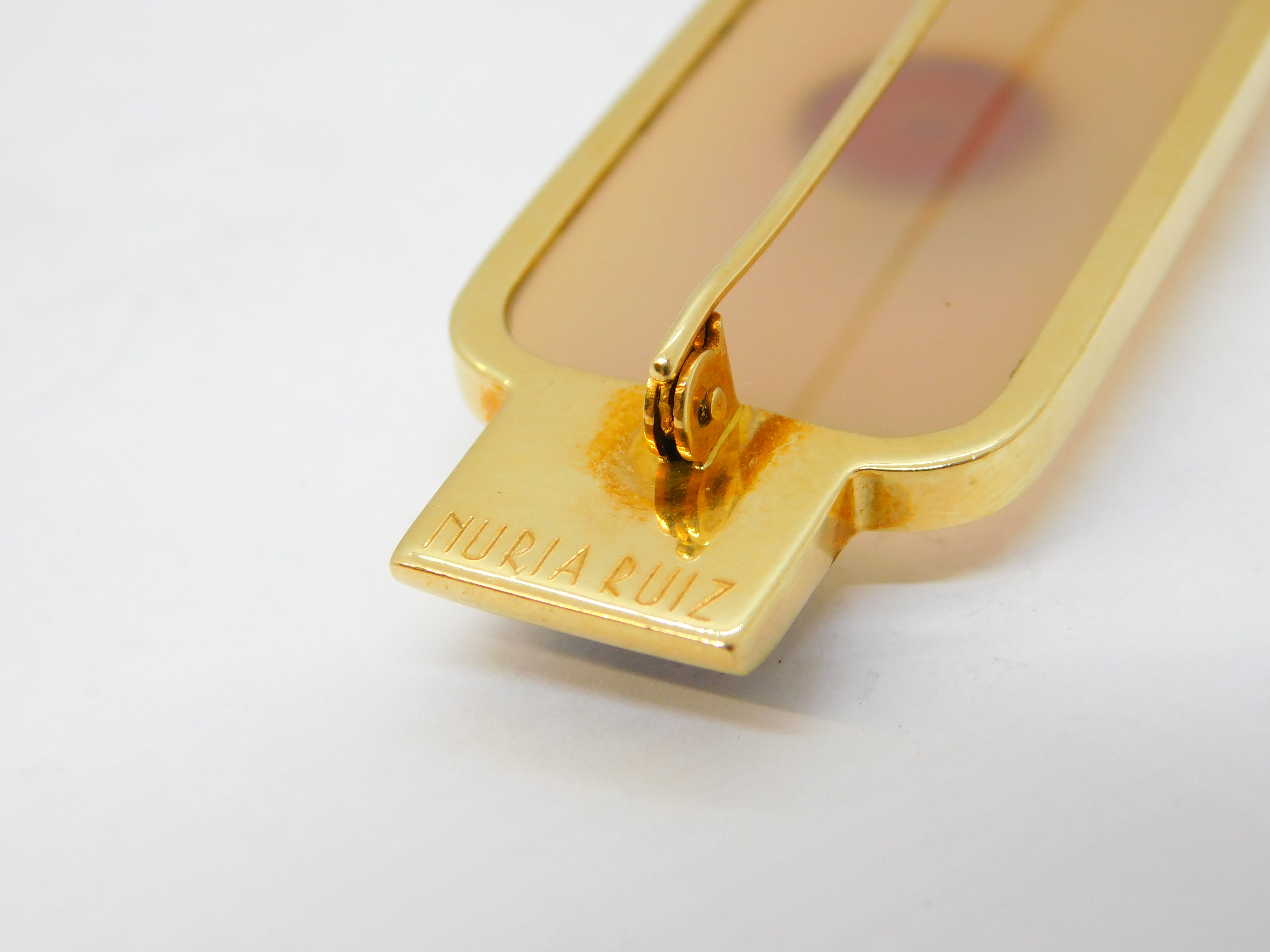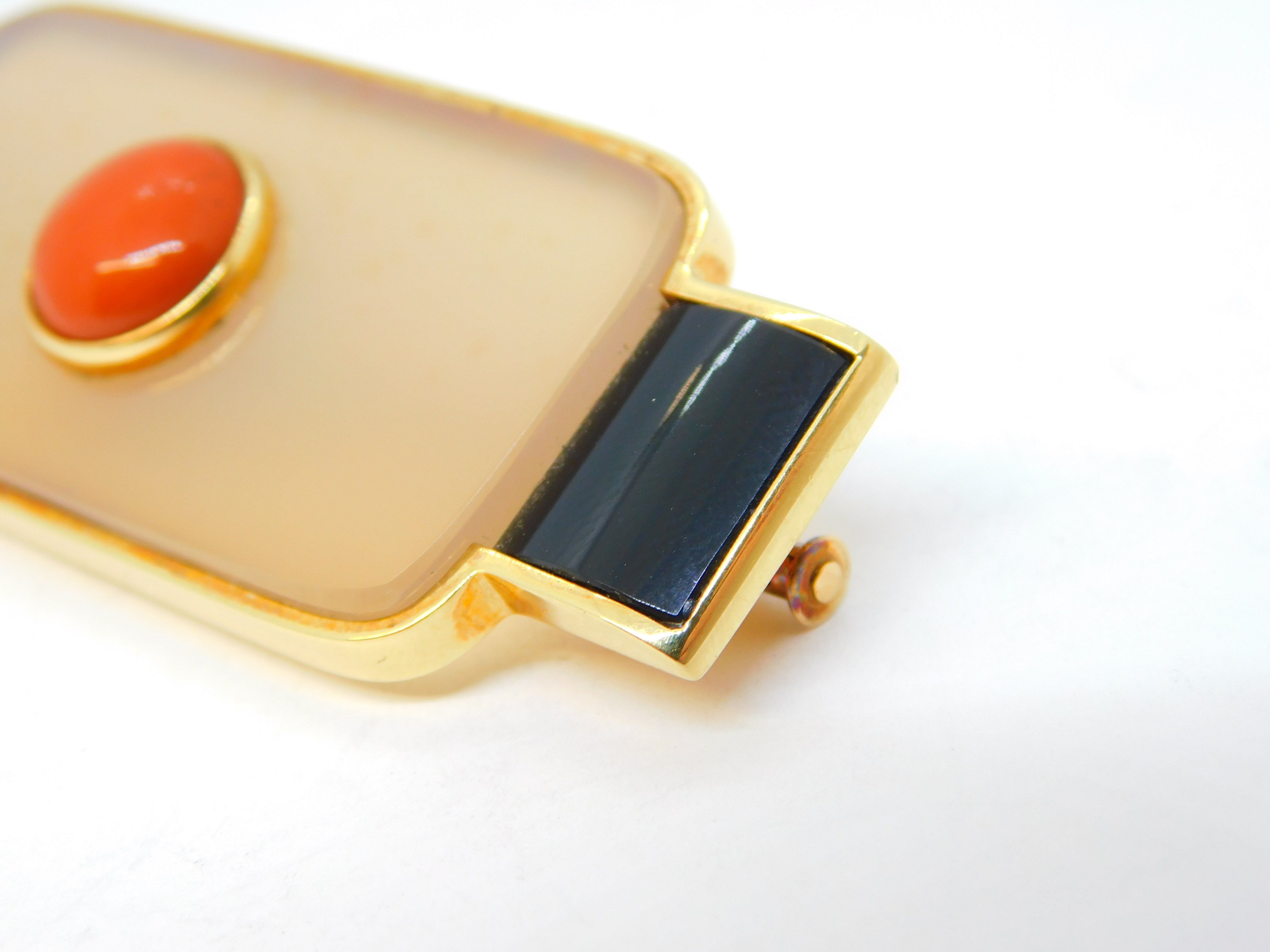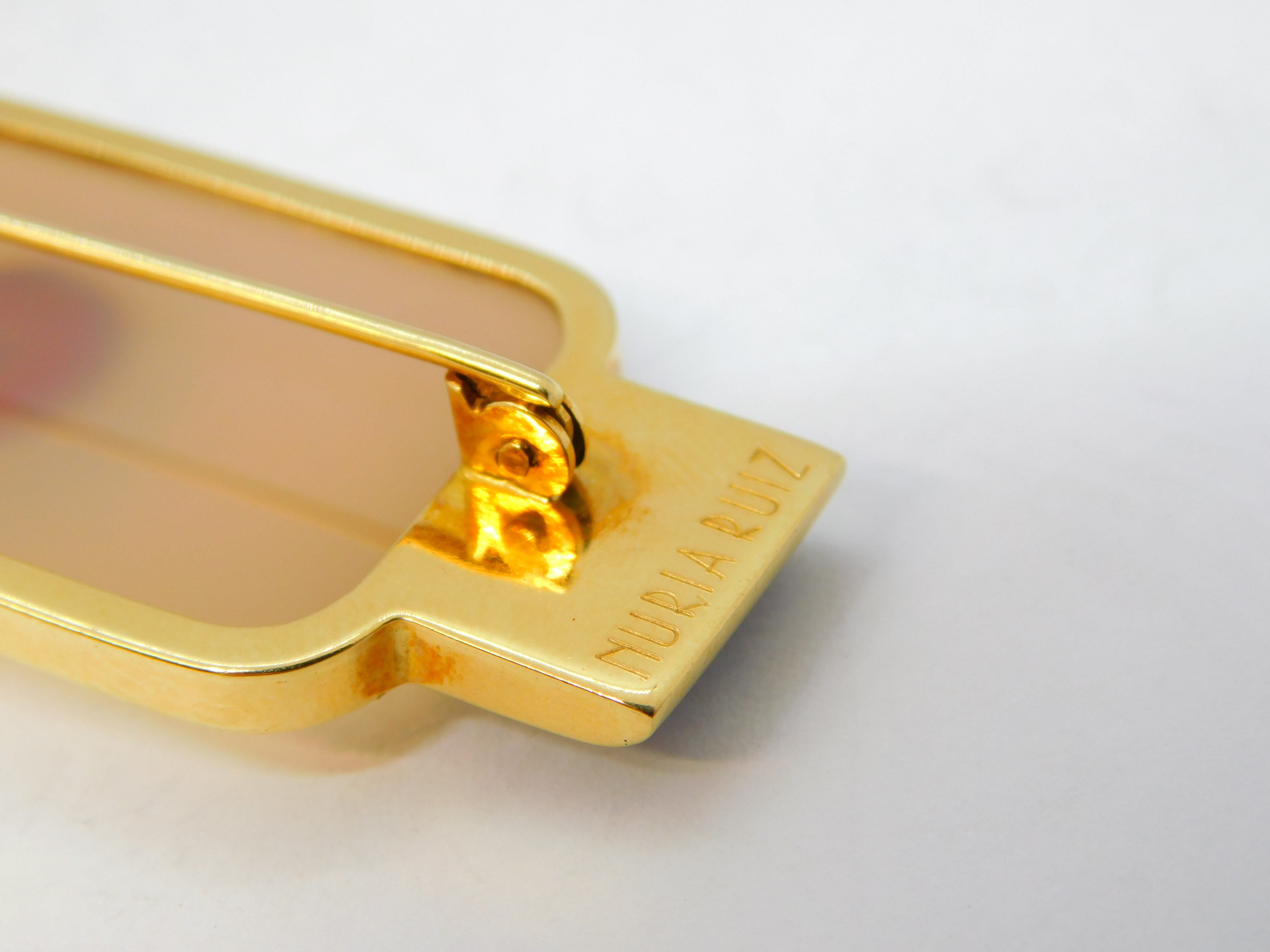 Details: A fantastic and wonderfully designed vintage Spanish designer 18ct yellow gold mounted art deco style modernist brooch with two sections of onyx flanking a central agate panel set with gold mounted red jasper to the centre. The gold has been XRF tested as it is unmarked, marked 'Nuria Ruiz' to the edge. Likely a commissioned piece, superior quality and in excellent condition. This is a wonderful item that would make a perfect gift or addition to any collection. We are more than happy to provide XRF reports for items upon request.