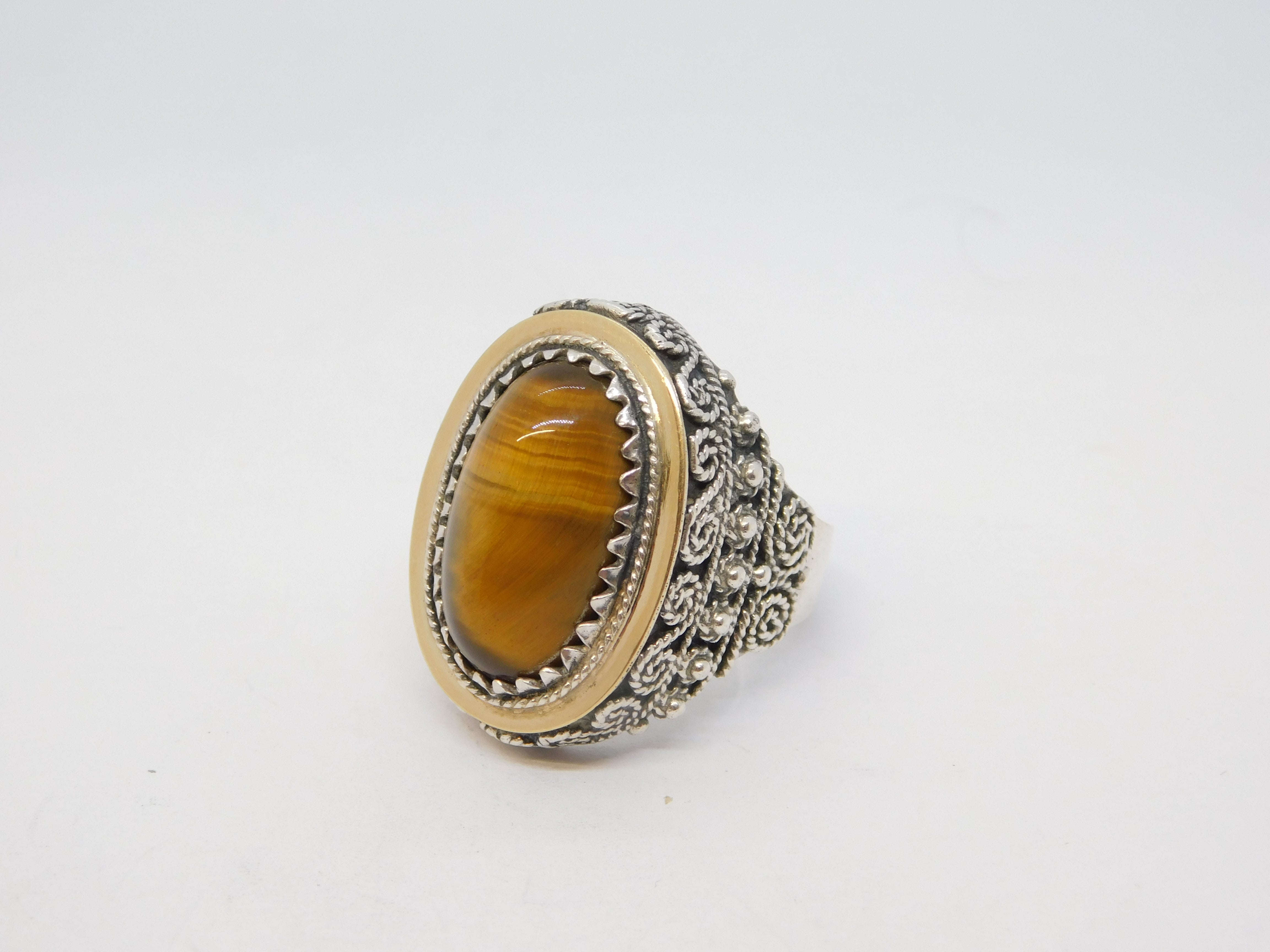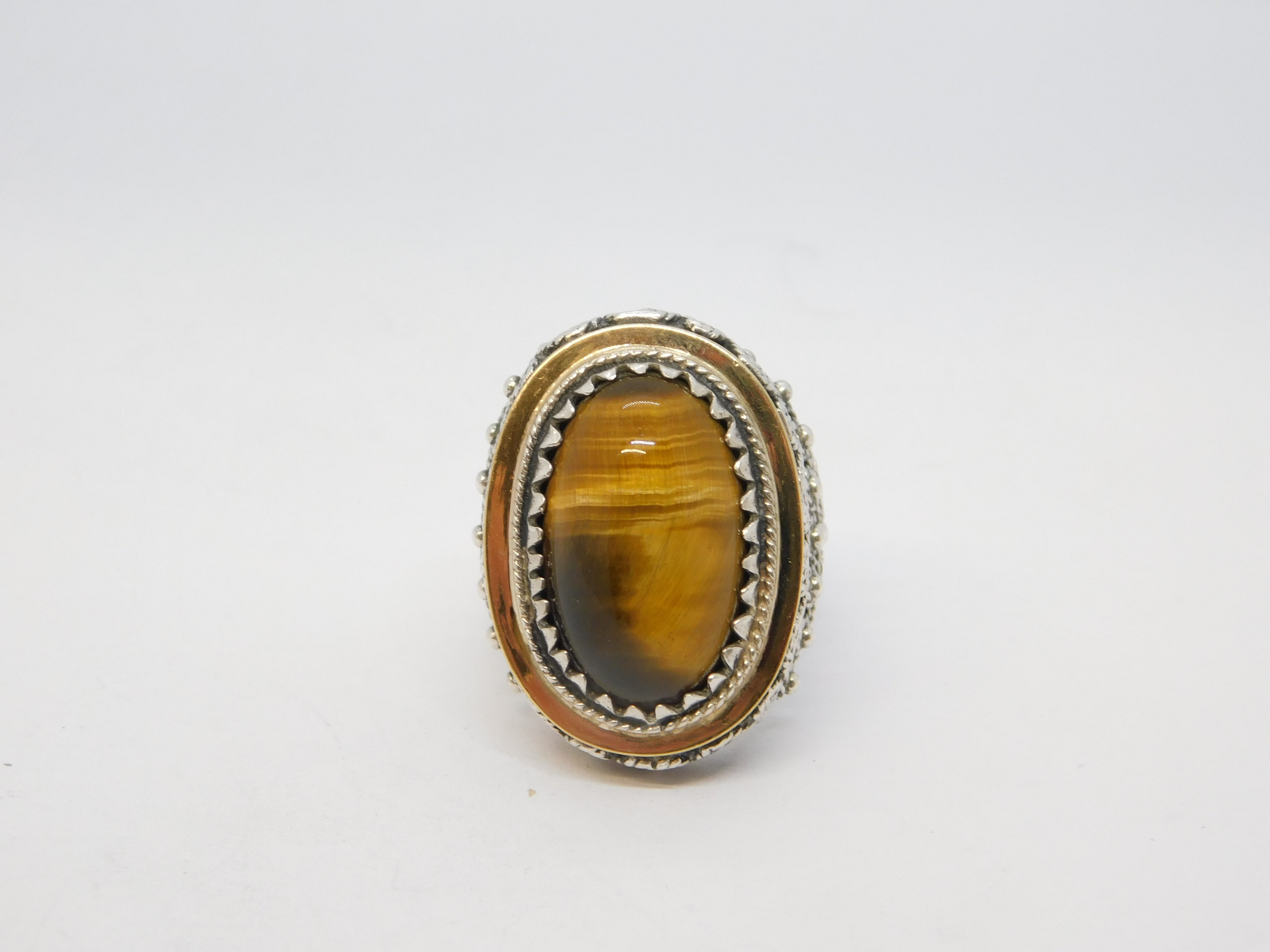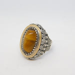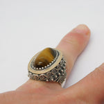 Spanish Large Sterling Silver, Gold & Tiger's Eye Signet Ring Vintage c1950