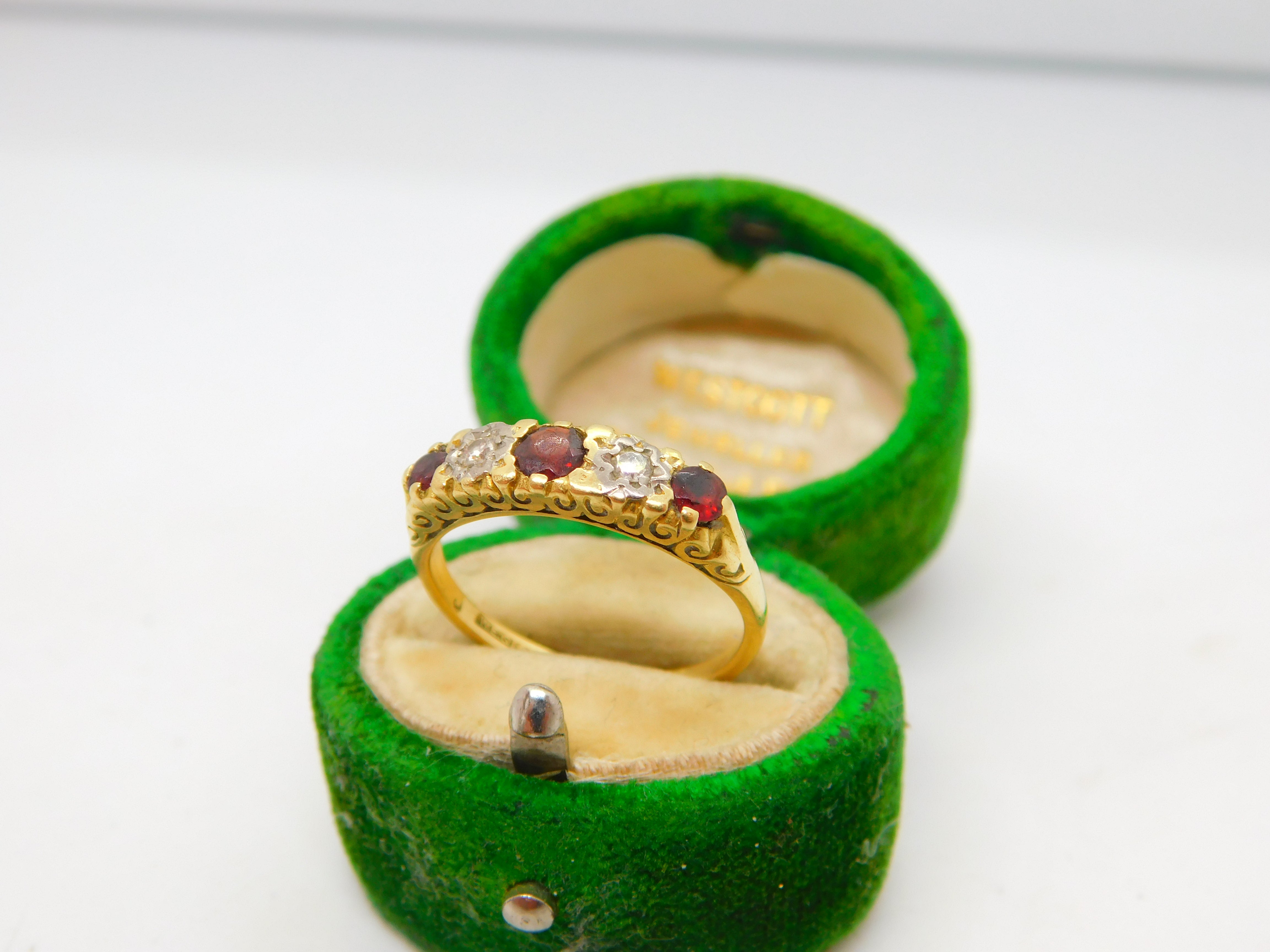 18ct Yellow Gold, Garnet & Diamond Victorian Style Boat Ring Vintage 1973