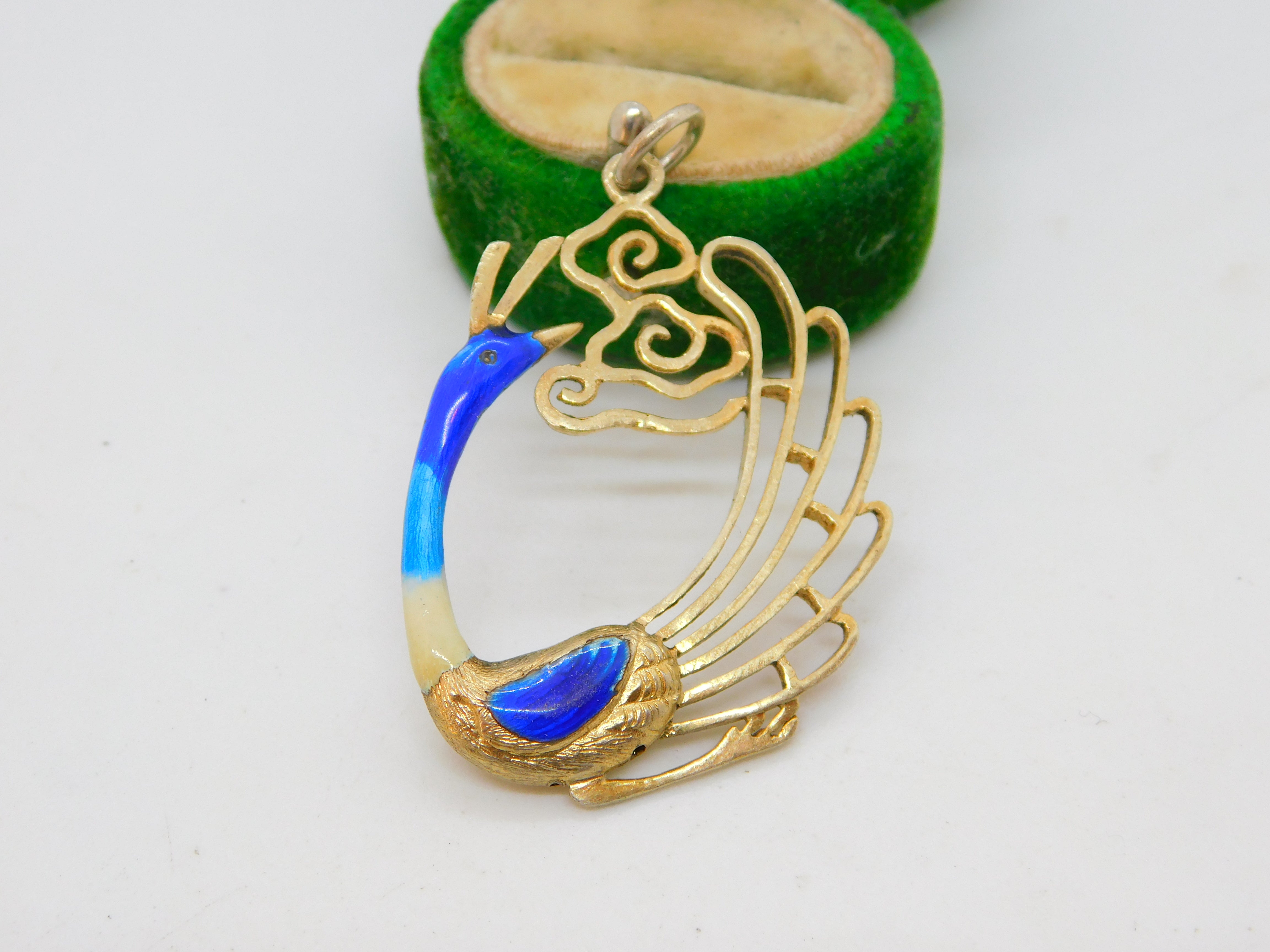 Sterling Silver Gilt & Colourful Enamel Peacock Drop Pendant Vintage c1980