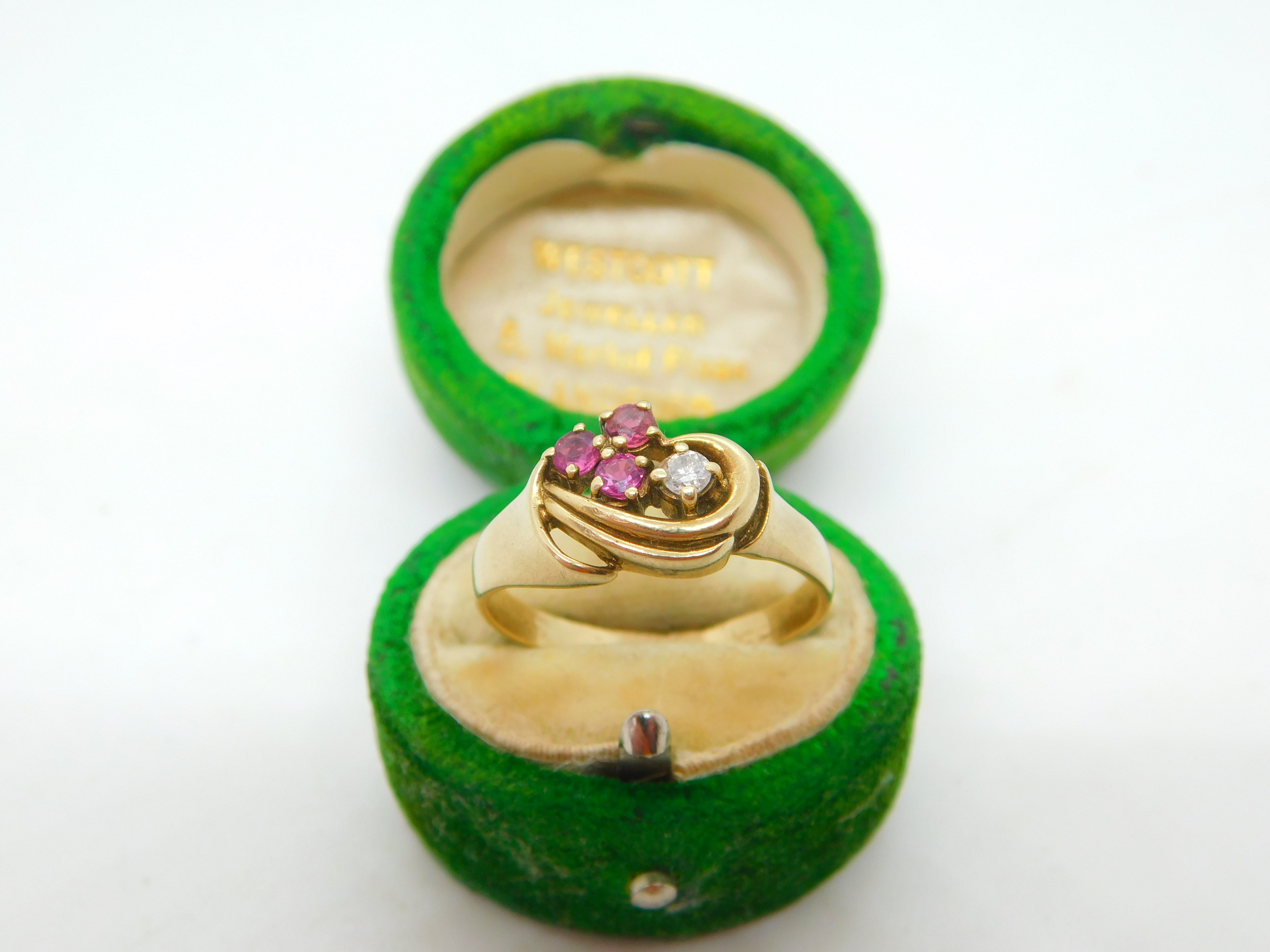 14ct Gold, Ruby & 0.1ct Diamond Floral Spray Band Ring Vintage c1970