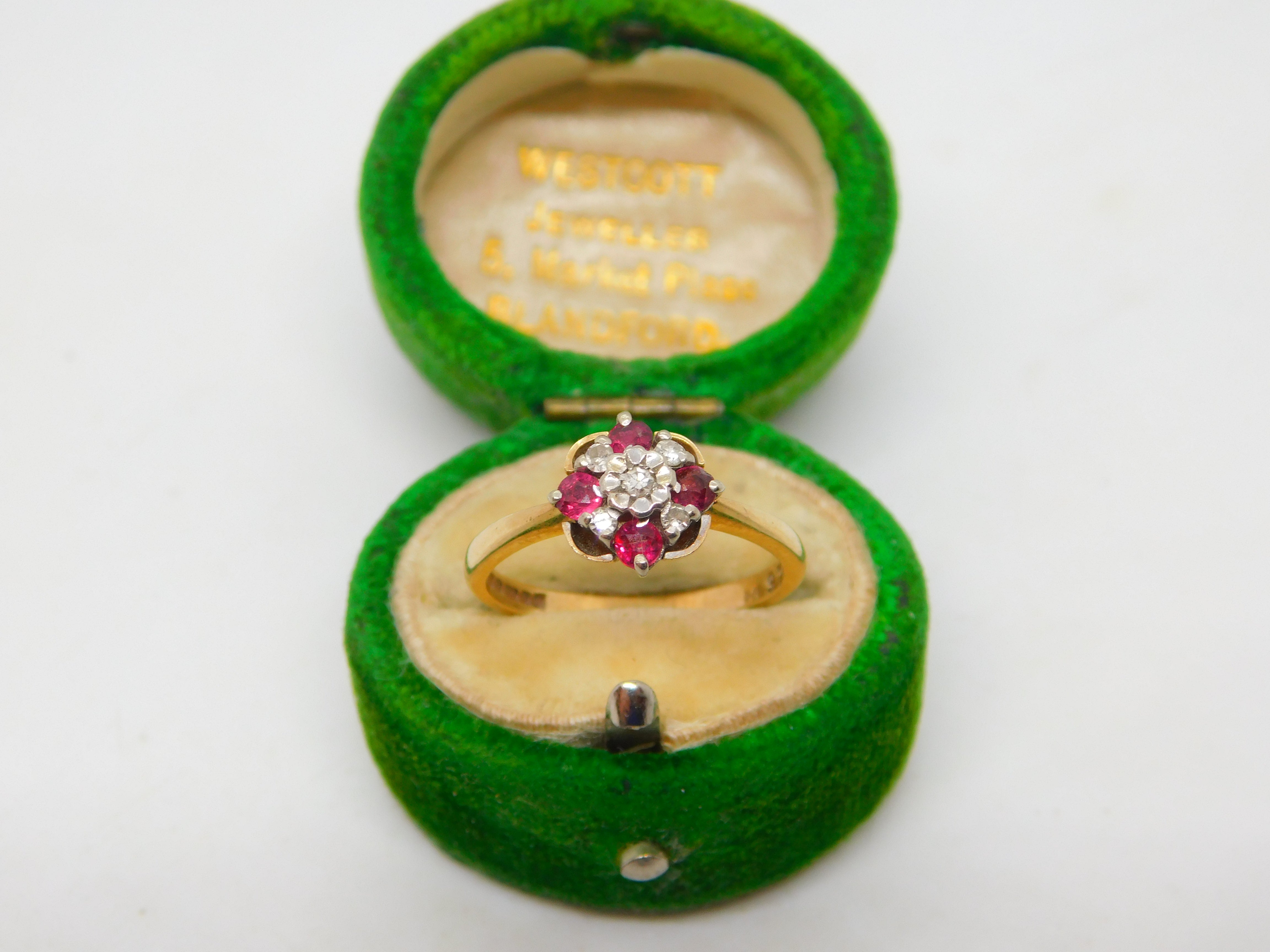 9ct Yellow Gold, Diamond & Ruby Set Floral Cluster Ring Vintage 1975 Birmingham