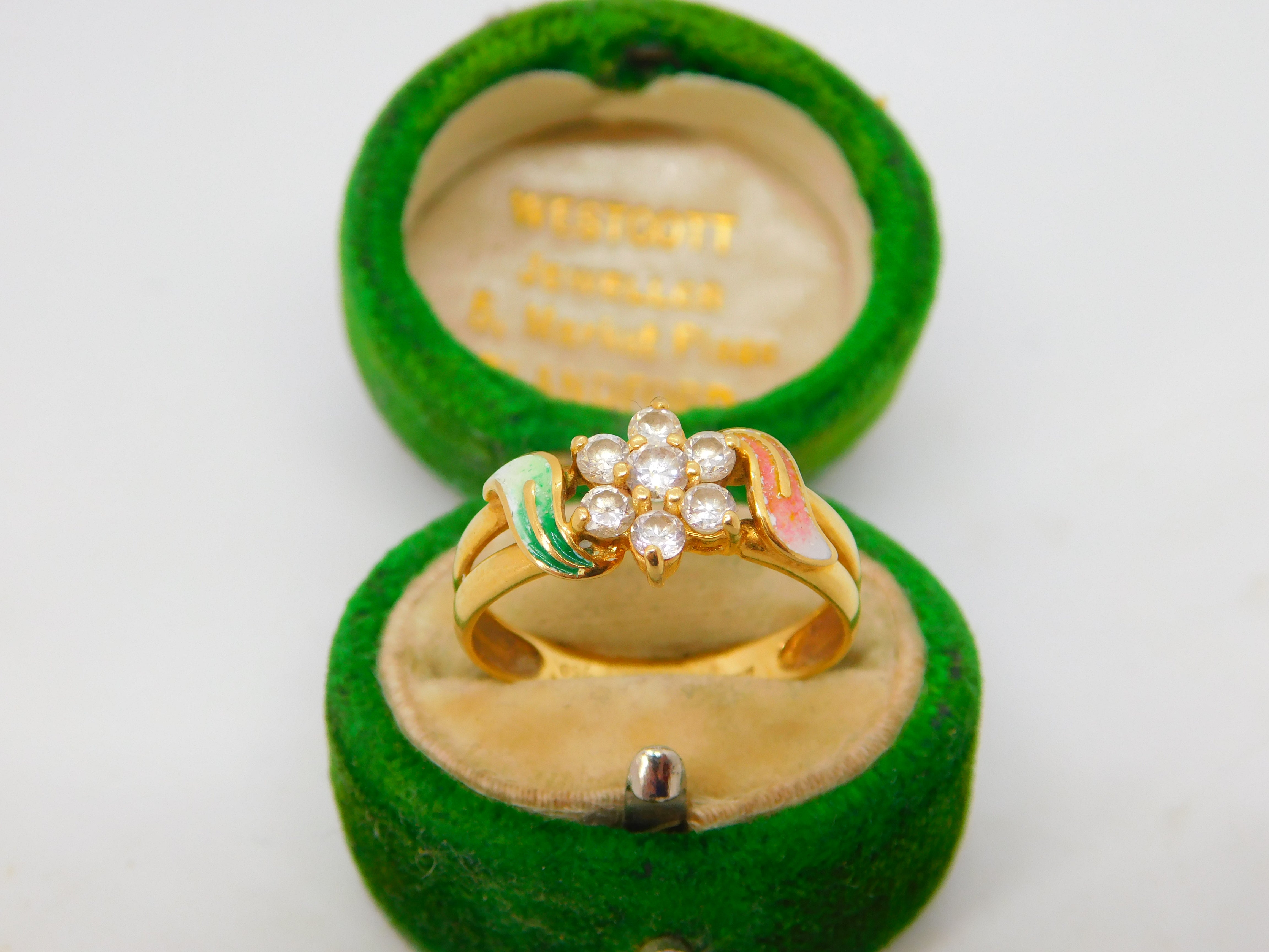 18ct Yellow Gold, Spinel & Pink-Green Enamel Floral Cluster Ring Vintage c1990