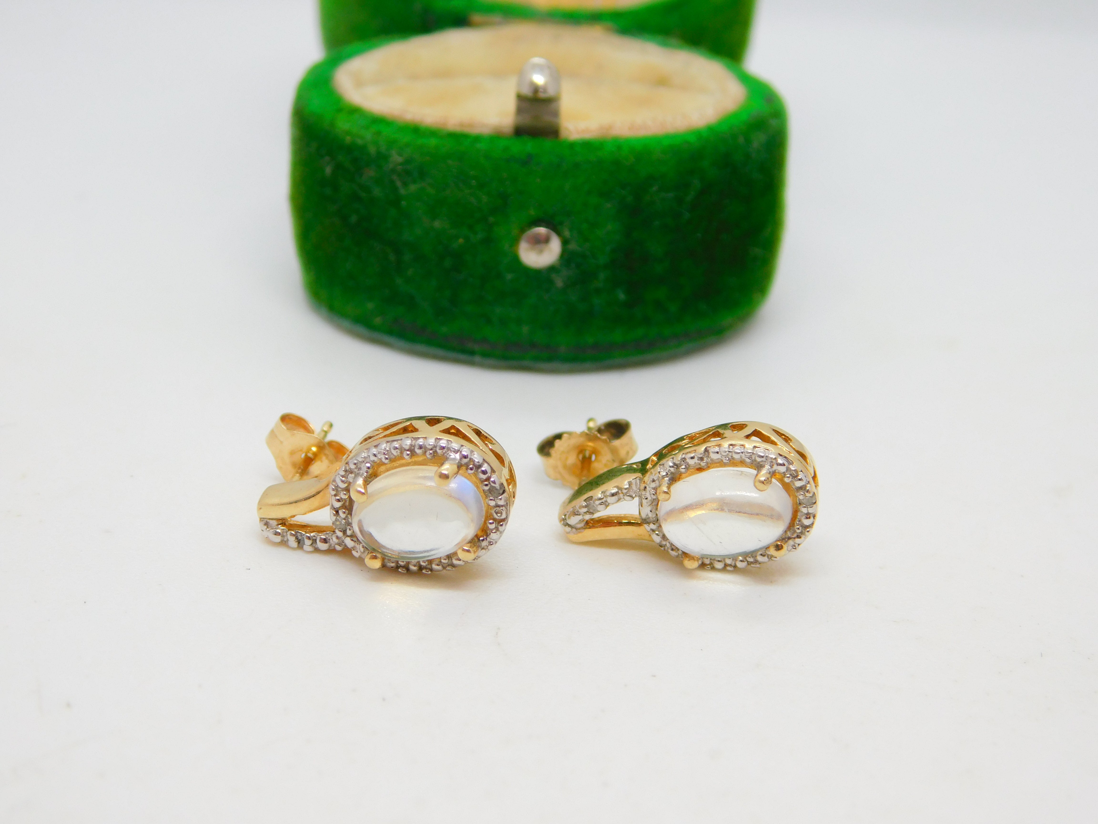 14ct Yellow Gold, Cabochon Moonstone & Diamond Stud Earrings Vintage c1980