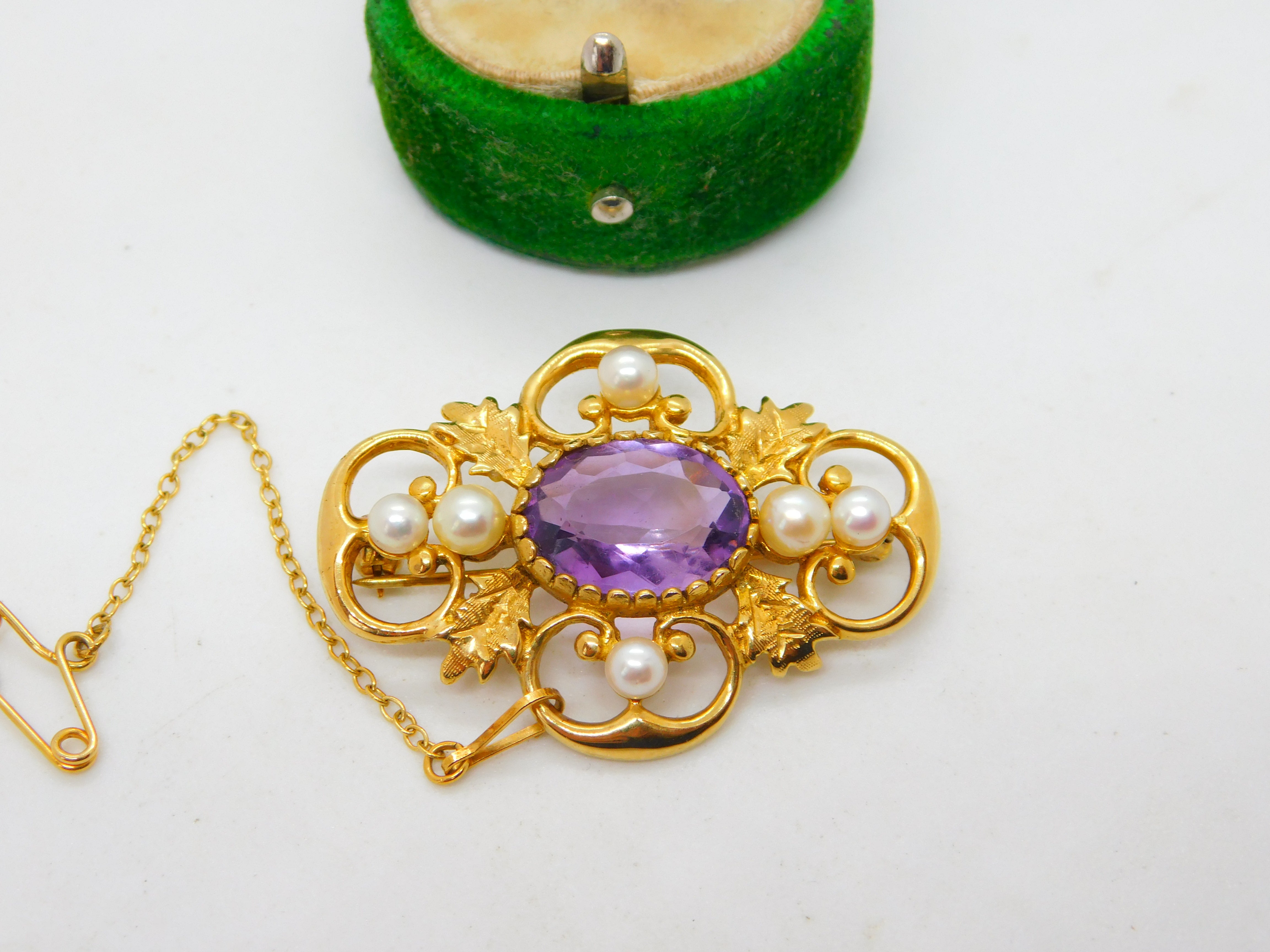 9ct Yellow Gold, Pearl & Amethyst Quatrefoil Floral Brooch Vintage 1972 London