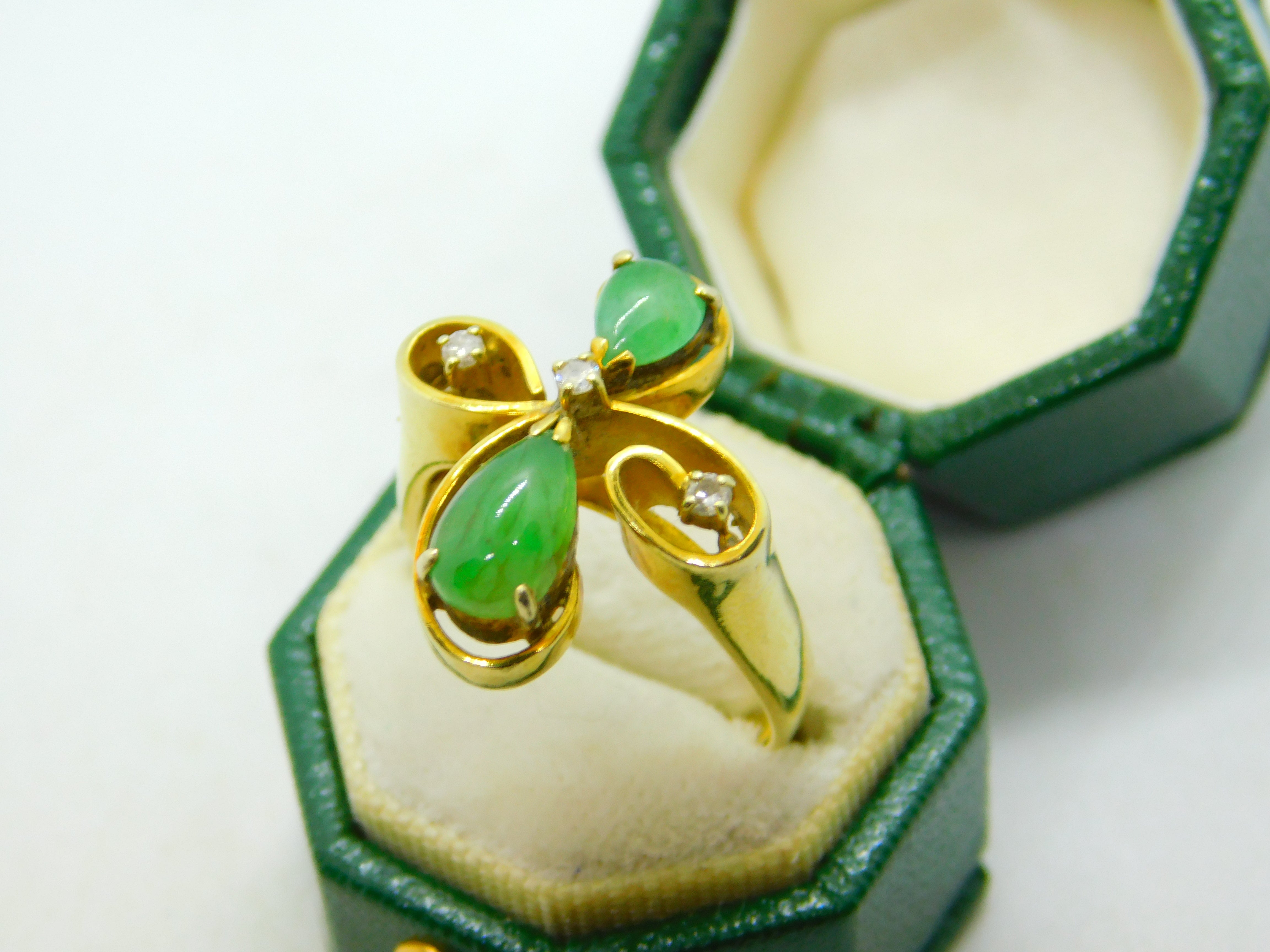 14ct Yellow Gold, Cabochon Jade & Diamond Floral Dress Ring Vintage c1970
