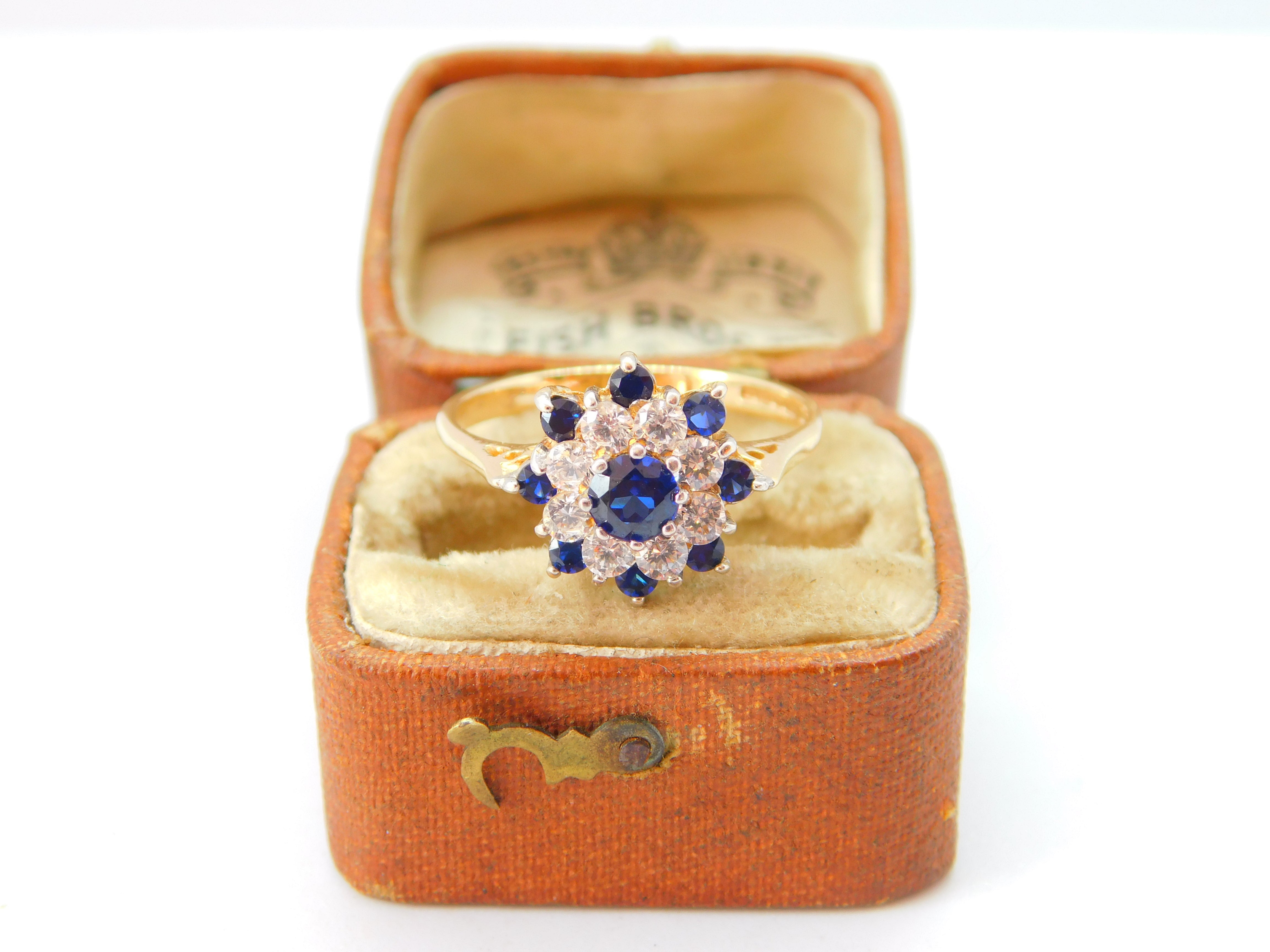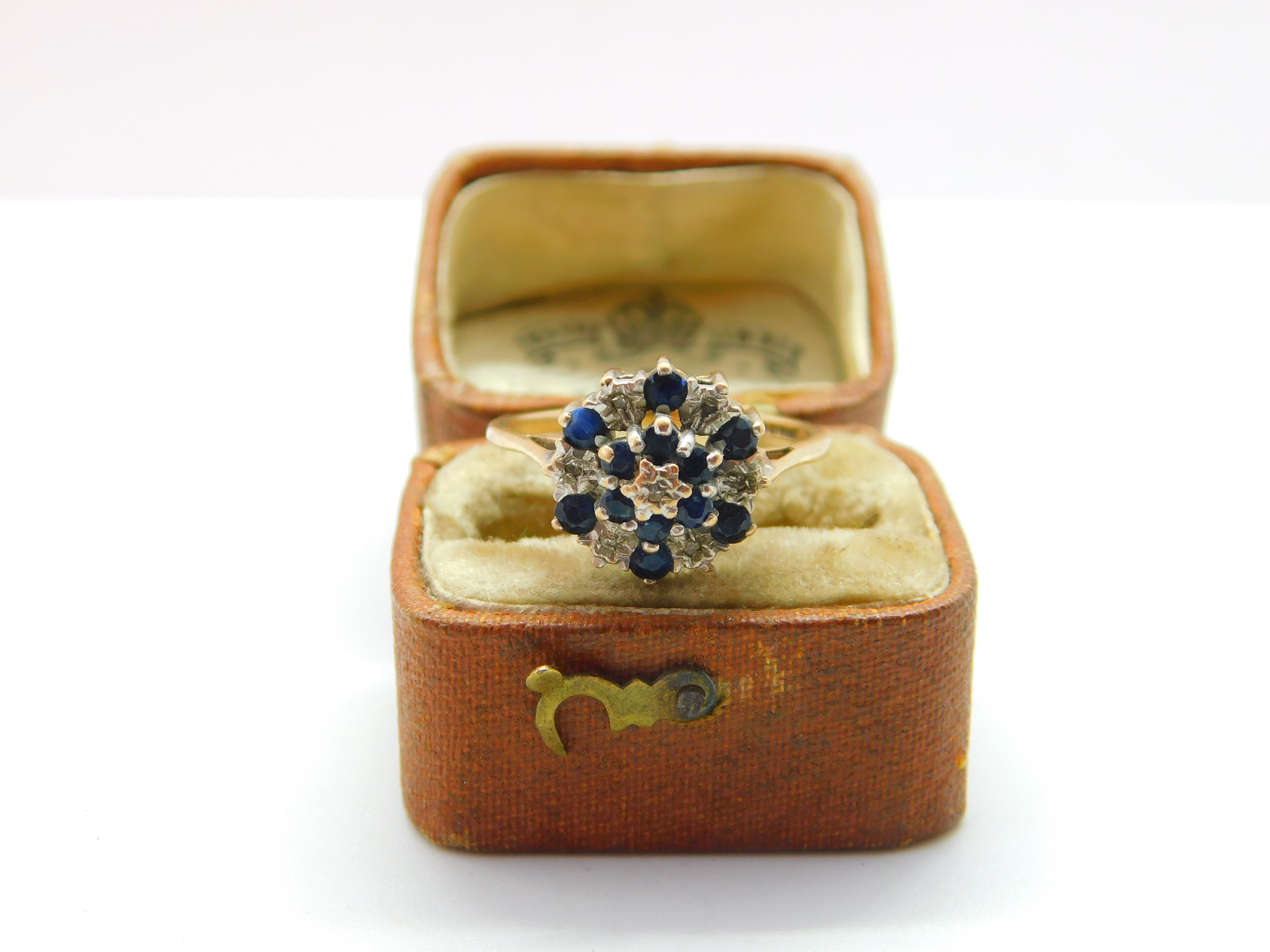 9ct Yellow Gold Sapphire & Diamond Floral Cluster Ring 1977 Birmingham Vintage