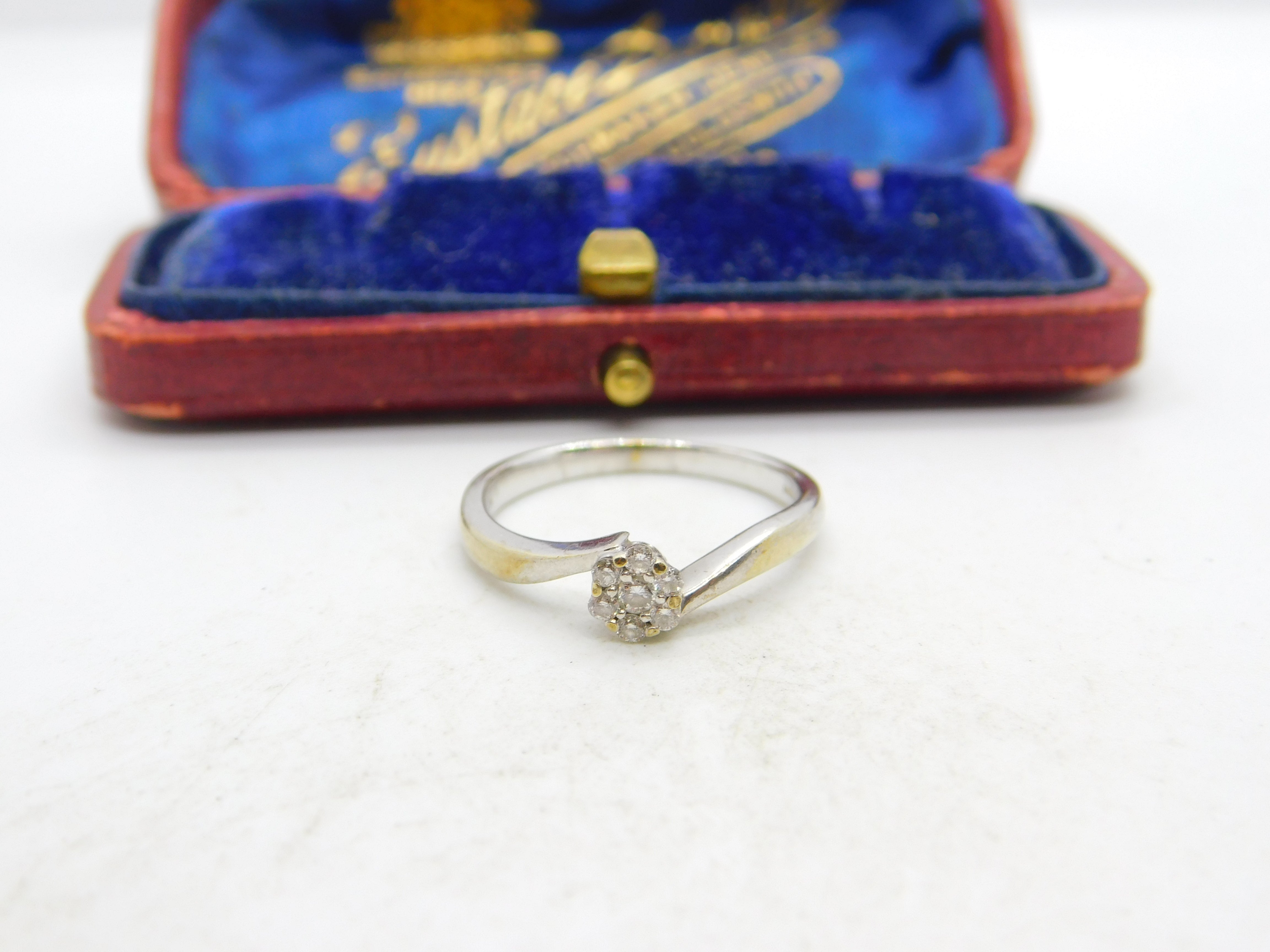 9ct White Gold Diamond Set Daisy Cluster Crossover Ring Vintage c1990