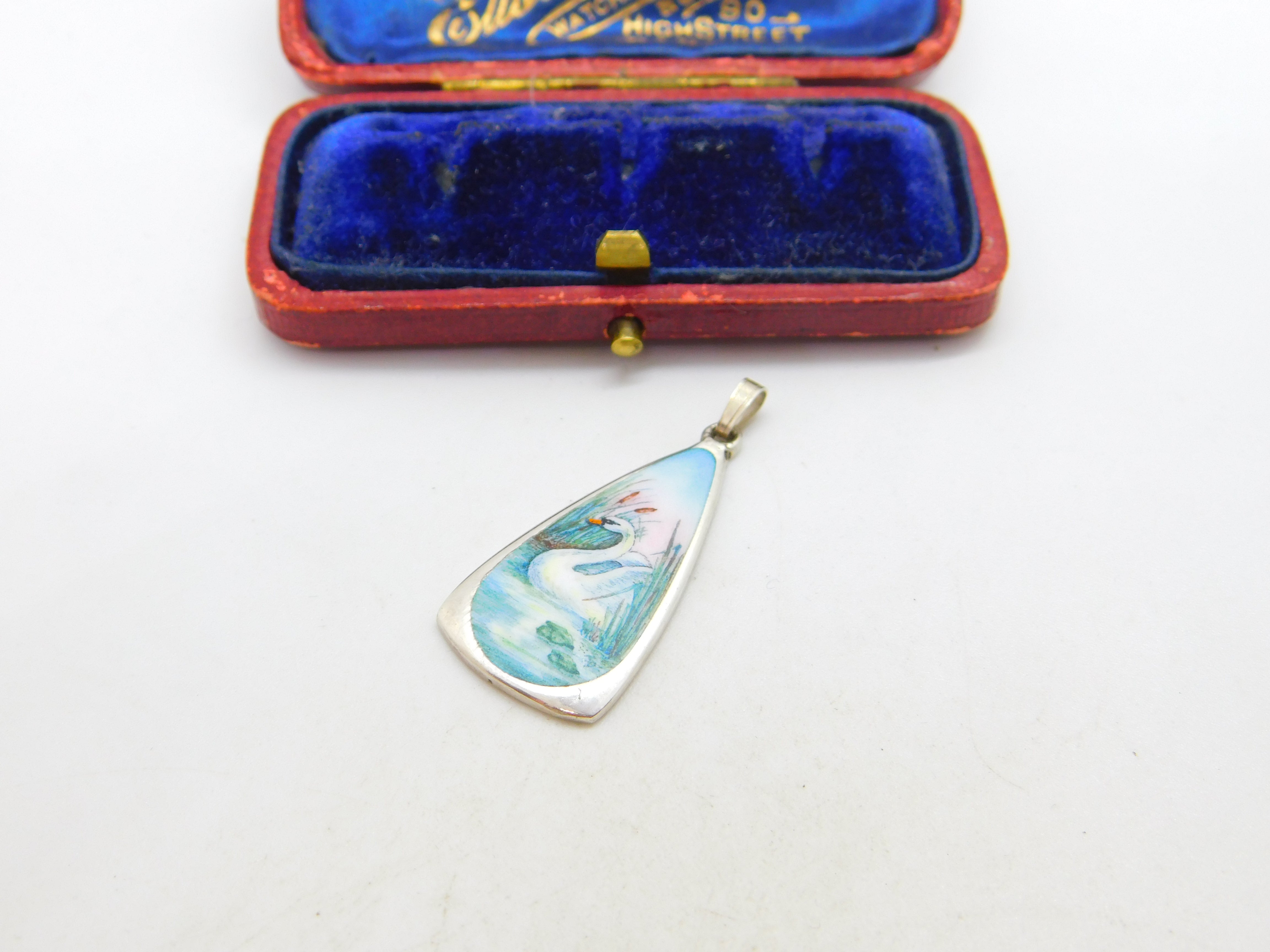 Sterling Silver Colourful Enamel Swan on Water Drop Pendant c1970 Vintage