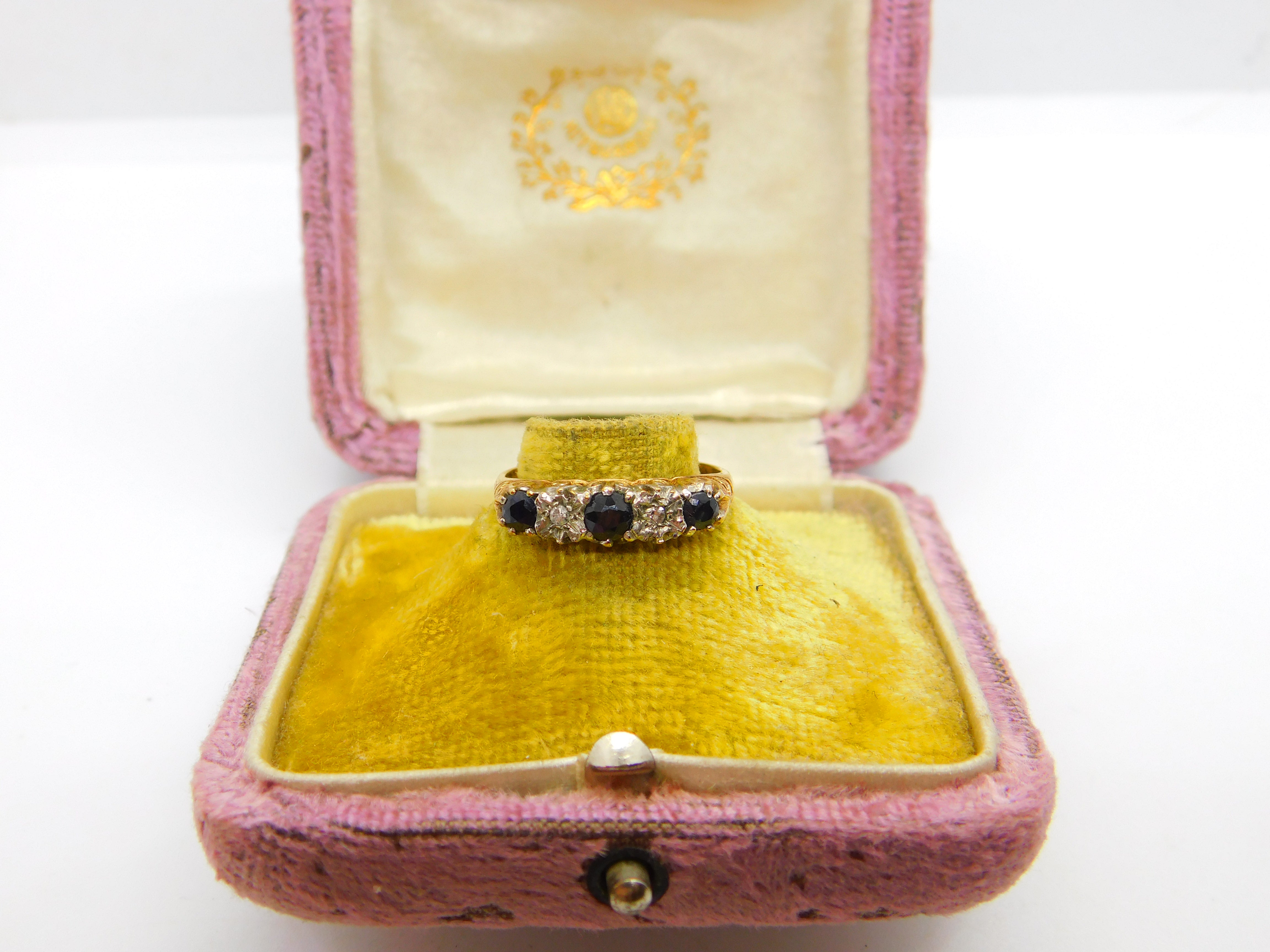 9ct Yellow Gold, Sapphire & Diamond Boat Ring 1982 Edinburgh Vintage
