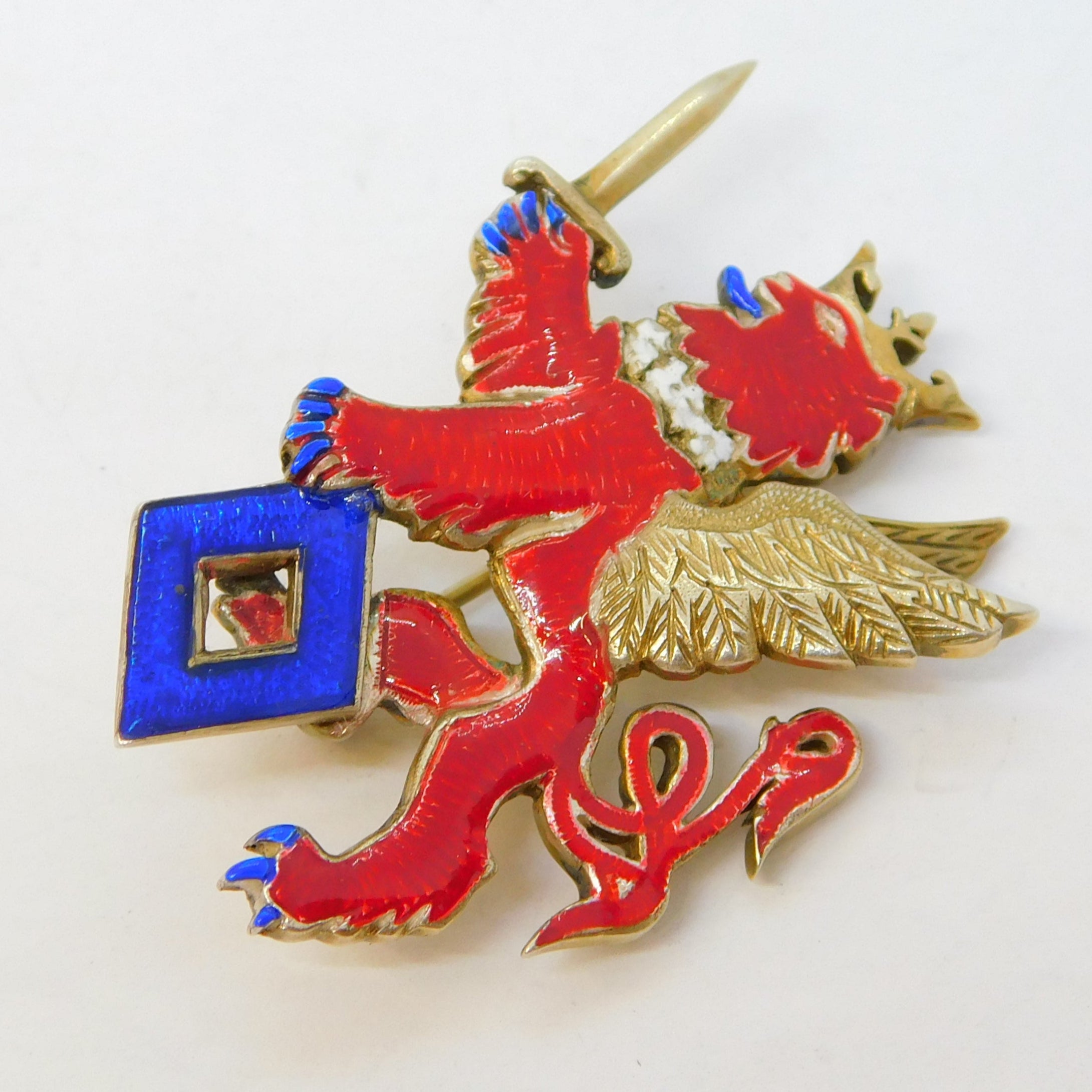 Sterling Silver Gilt, Blue-Red Enamel Winged Lion with Sword Brooch Vintage 1999
