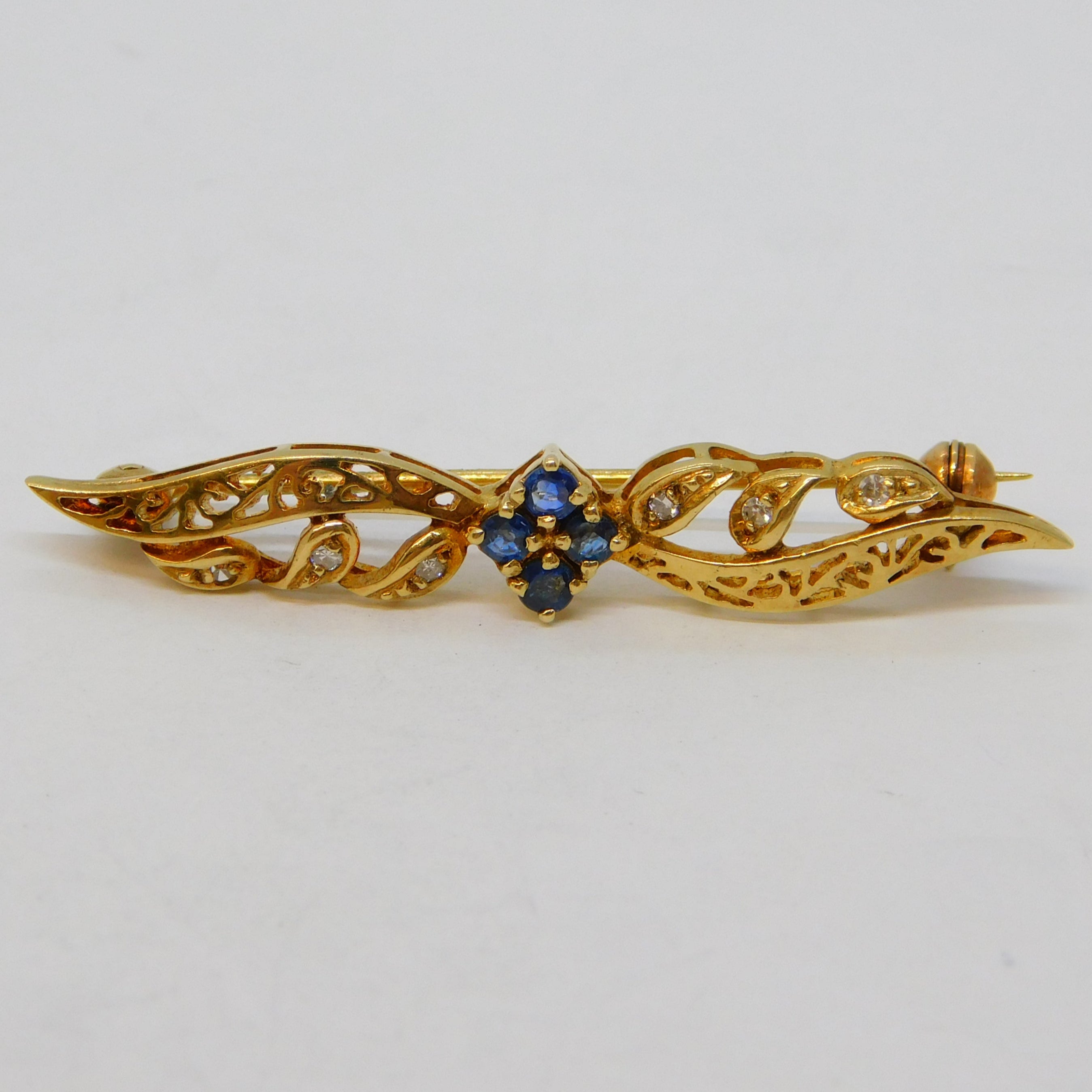 9ct Yellow Gold, Sapphire & Diamond Floral Spray Brooch Vintage c1970