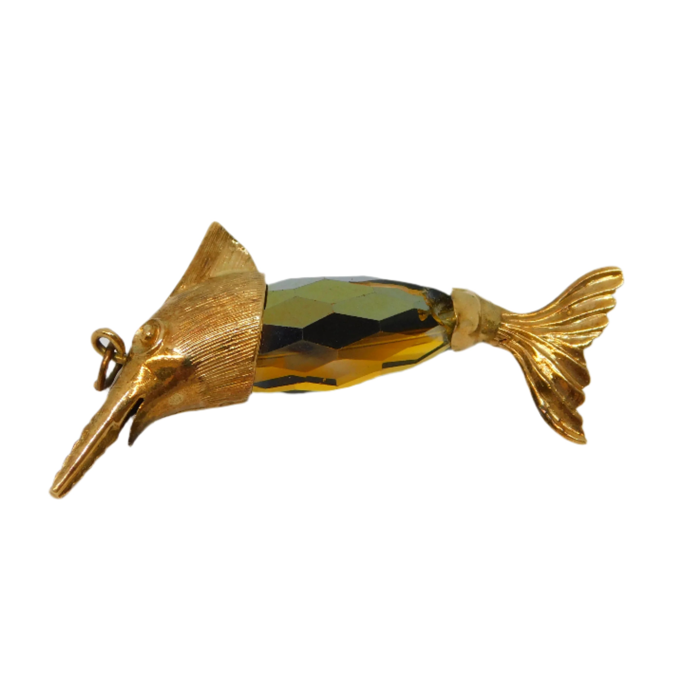 9ct Yellow Gold Citrine Glass Large Swordfish Charm Pendant Vintage 1981 London