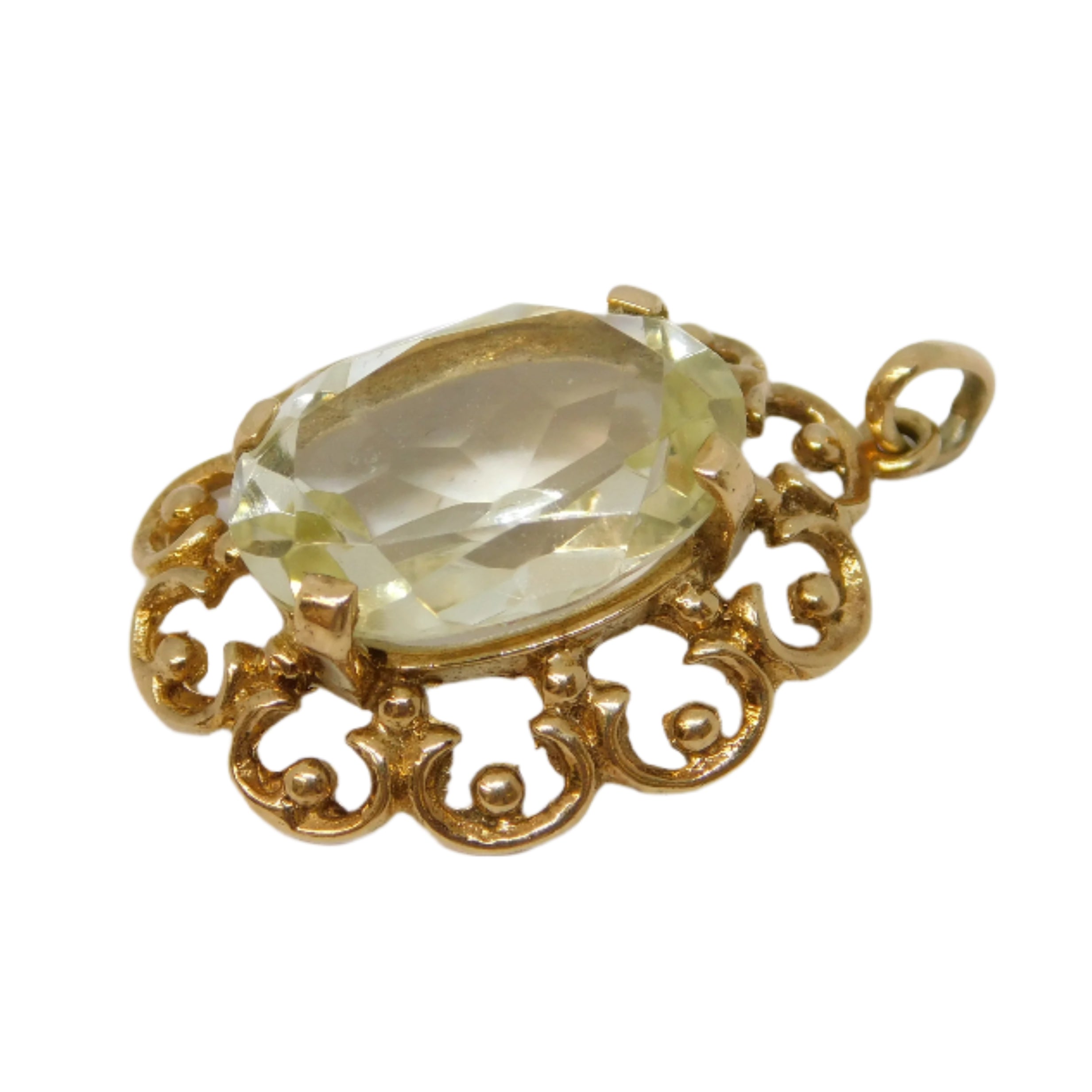 9ct Yellow Gold Carved Citrine Set Floral Drop Pendant Vintage 1968 London