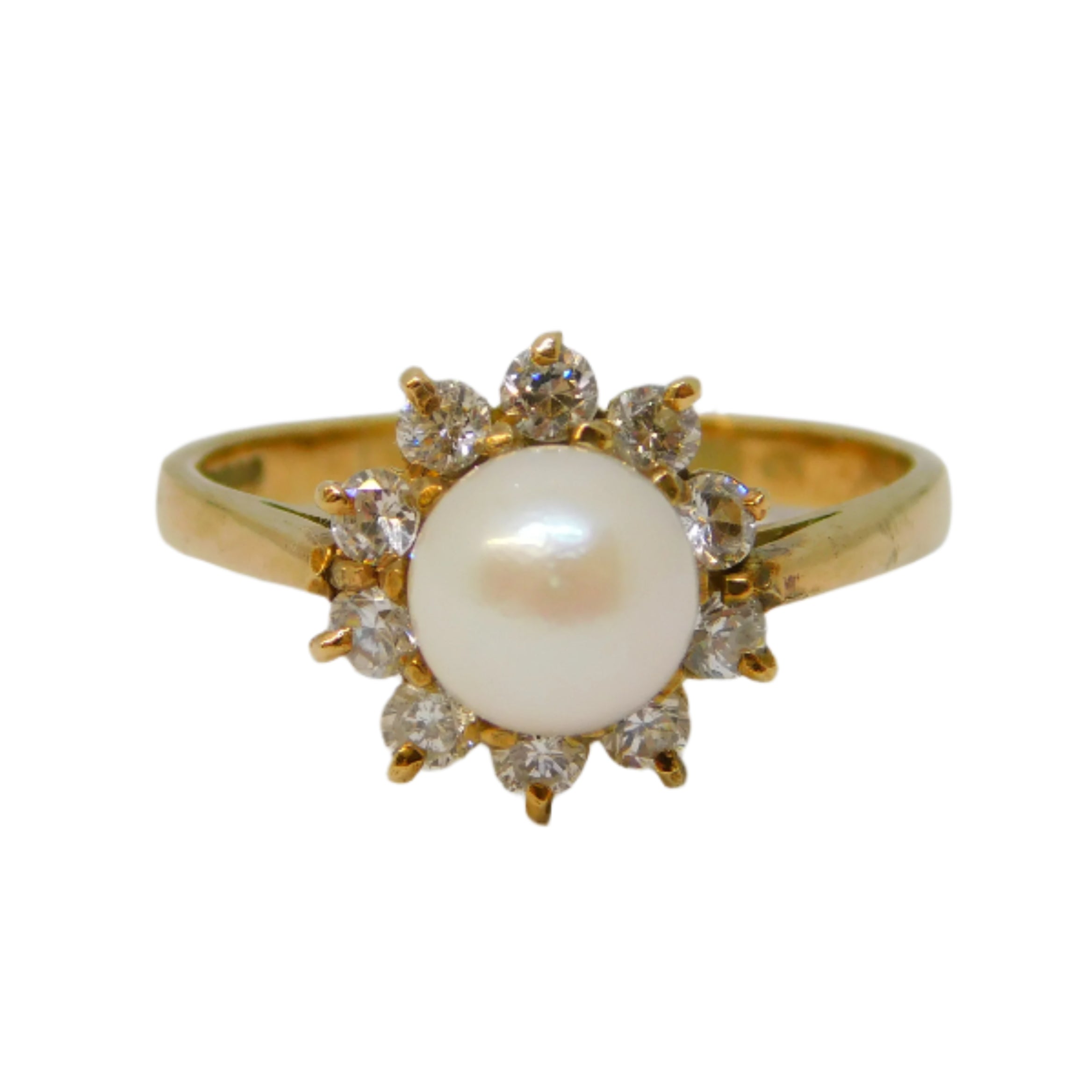 9ct Yellow Gold, Spinel & Pearl Set Floral Cluster Ring Vintage 1998 London