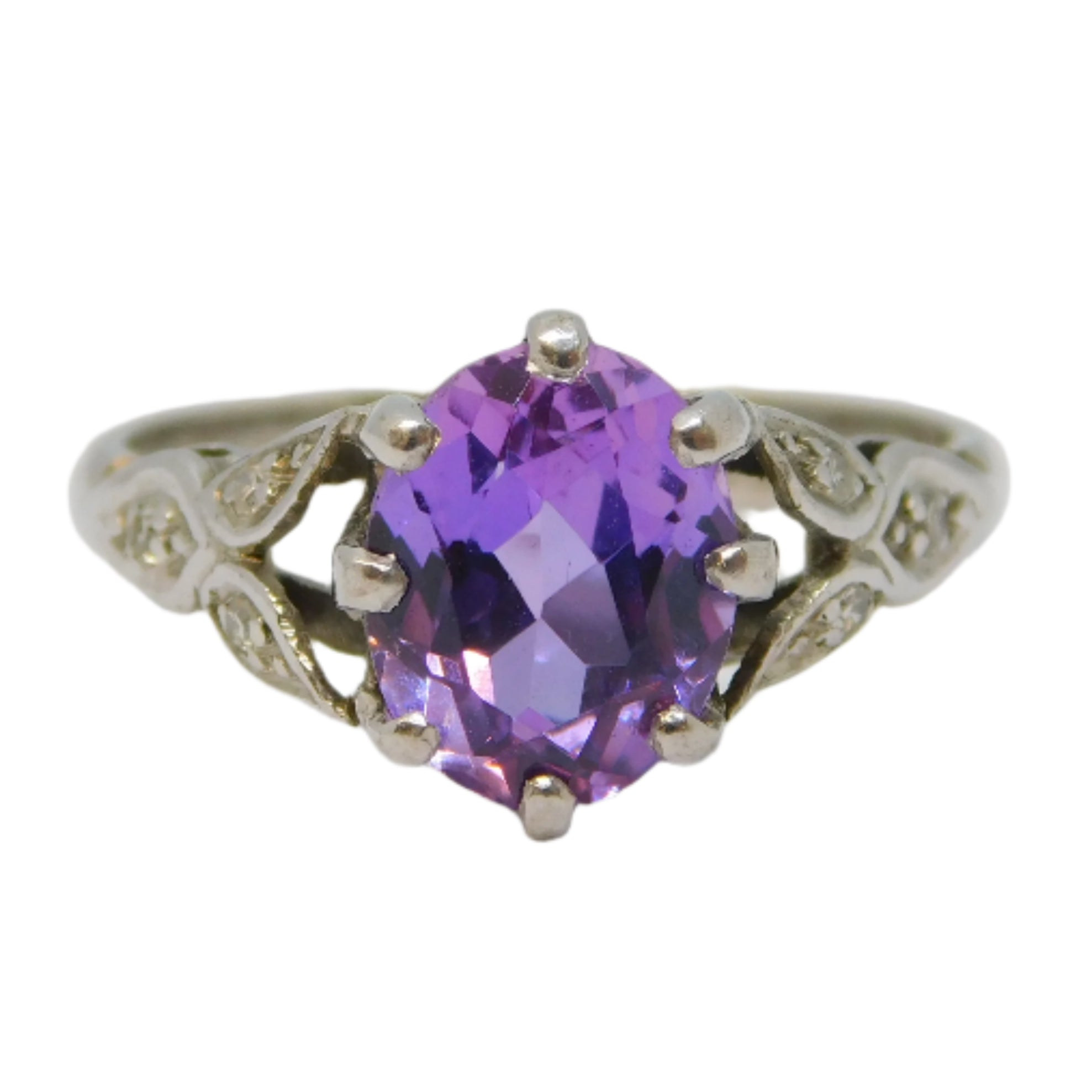 18ct White Gold, Oval Cut Amethyst & Diamond Floral Dress Ring Vintage c1970