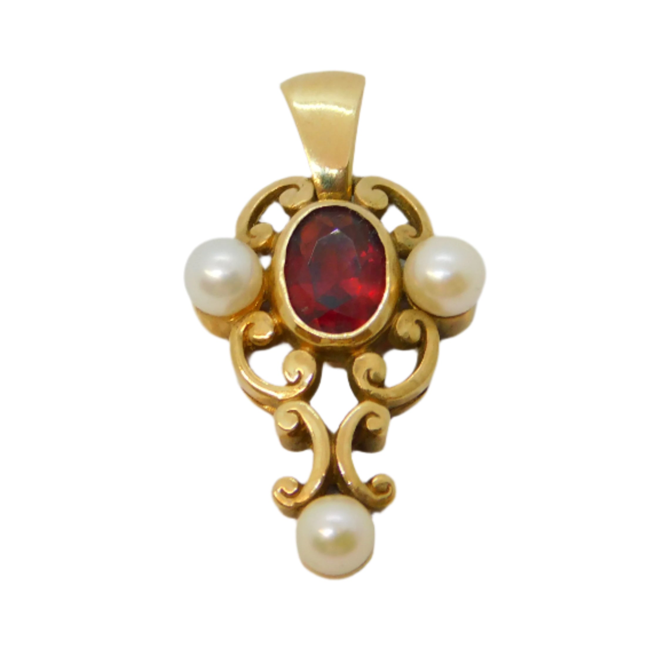 9ct Yellow Gold, Pearl & Garnet Set Floral Drop Pendant Vintage 1996 London