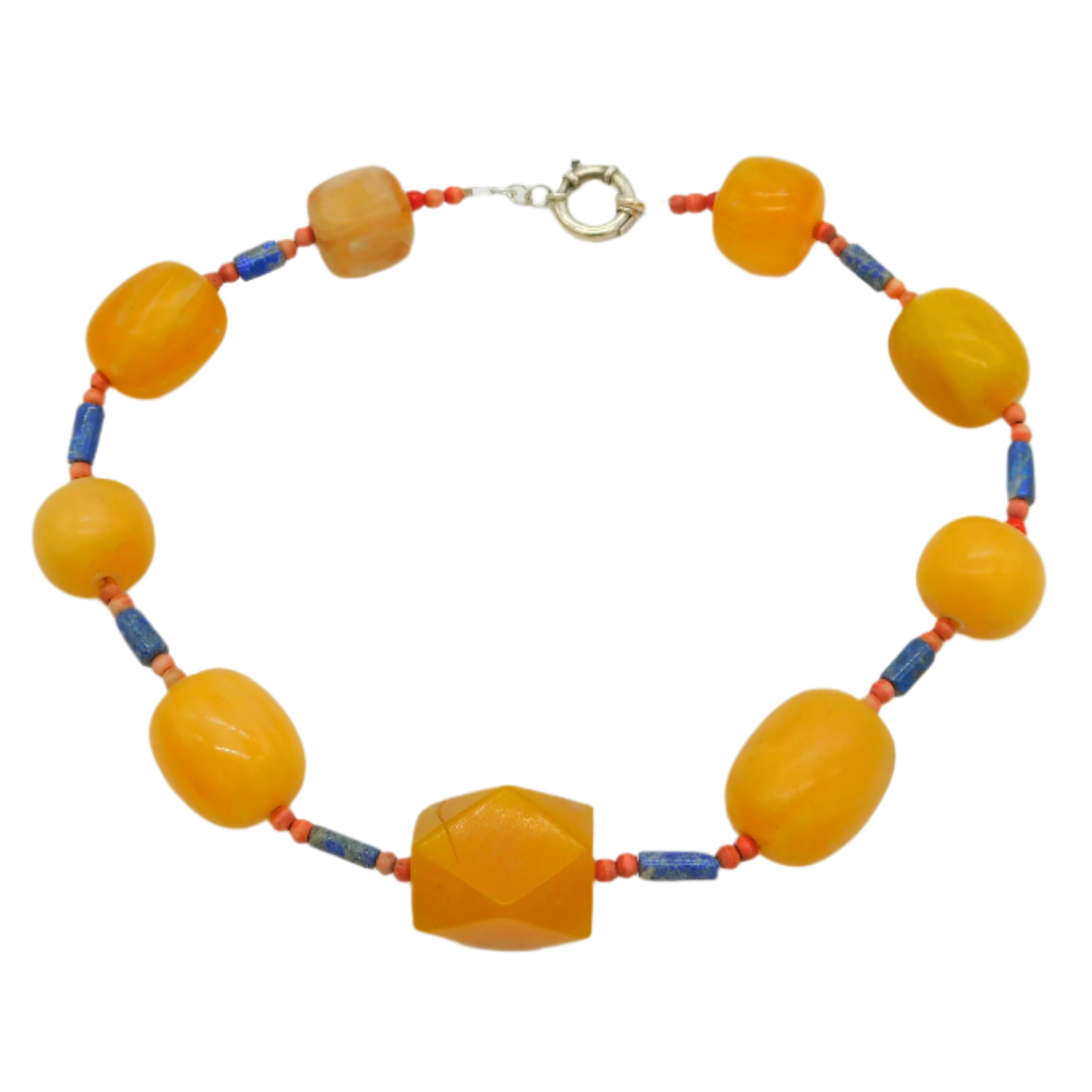 Sterling Silver, Large Amber, Red Coral & Lapis Lazuli Necklace Vintage c1970